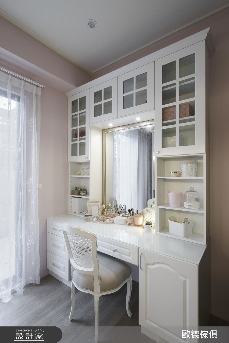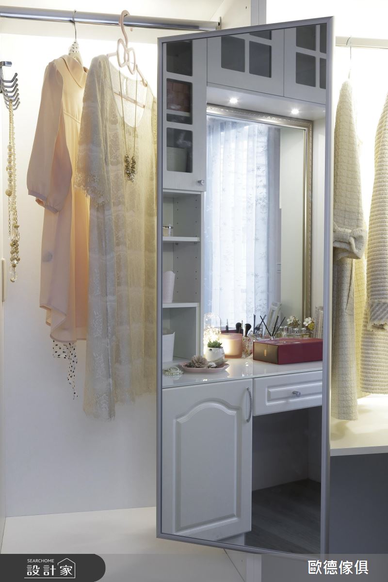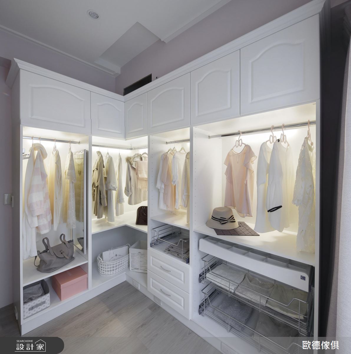 設計師特別為女主人打造了夢寐以求的獨立更衣間,牆面漆上粉紅色,並在 L型衣櫃內部設置大面旋轉鏡,可隨時抽出整體儀容,美觀又具機動性。