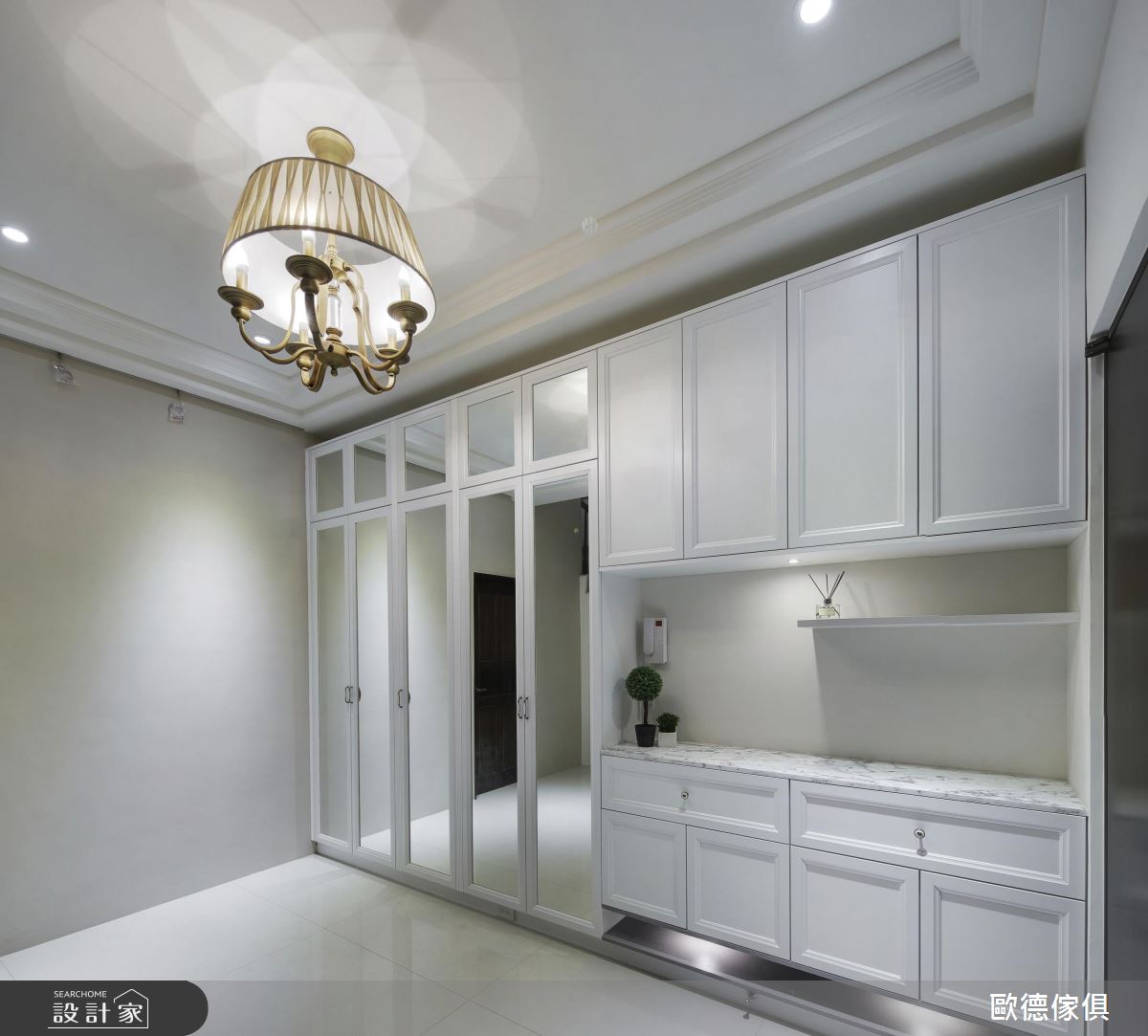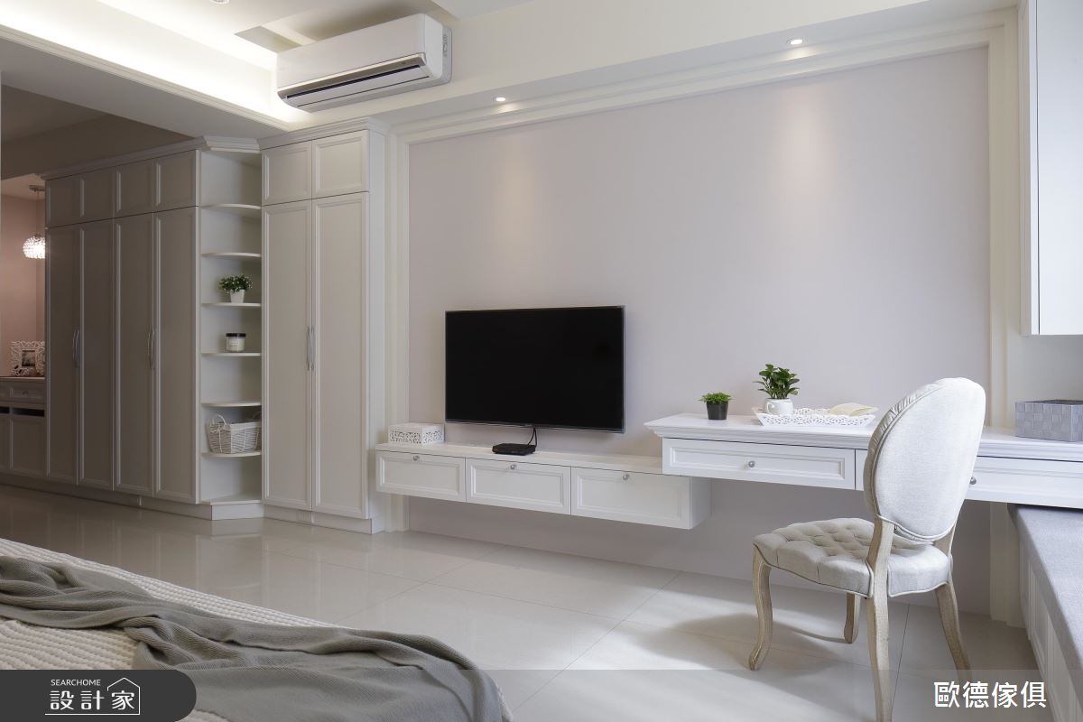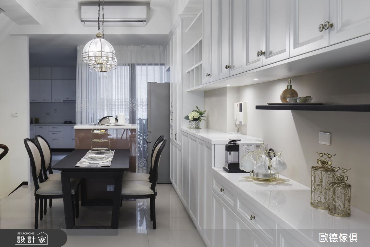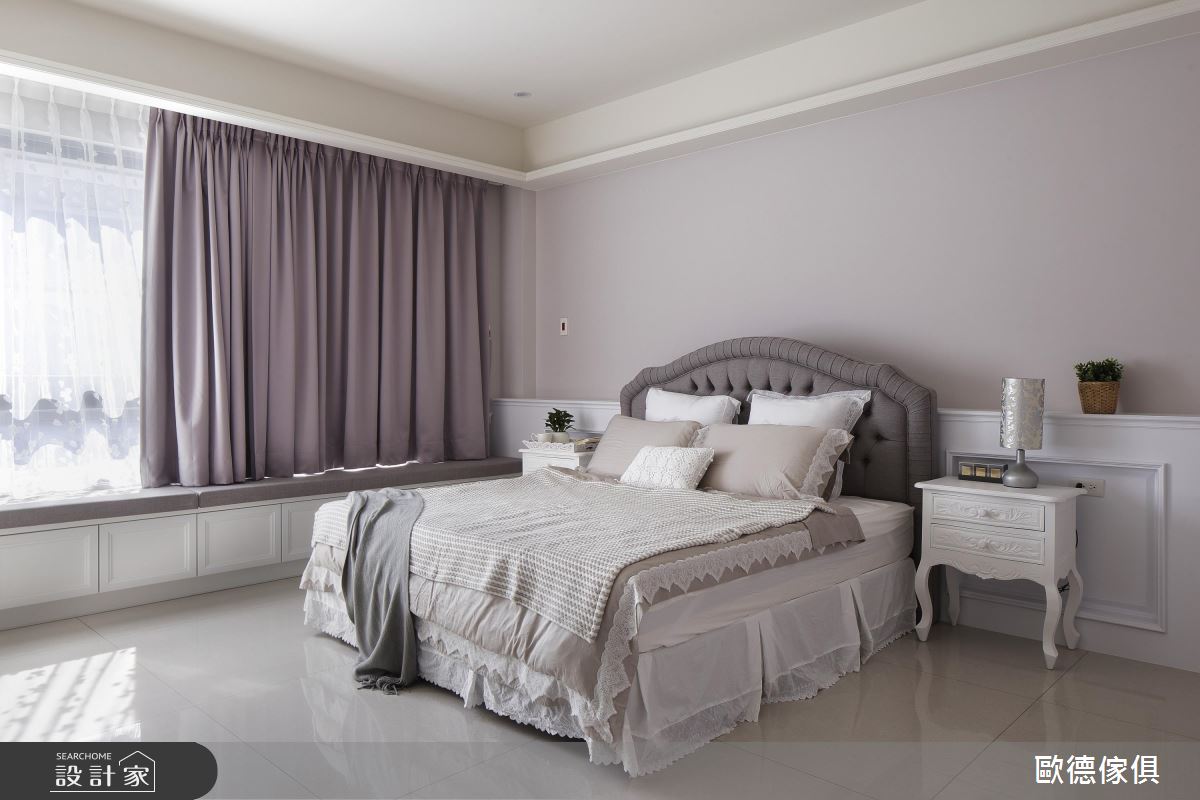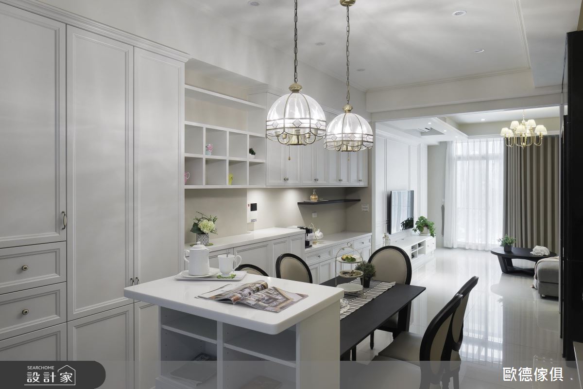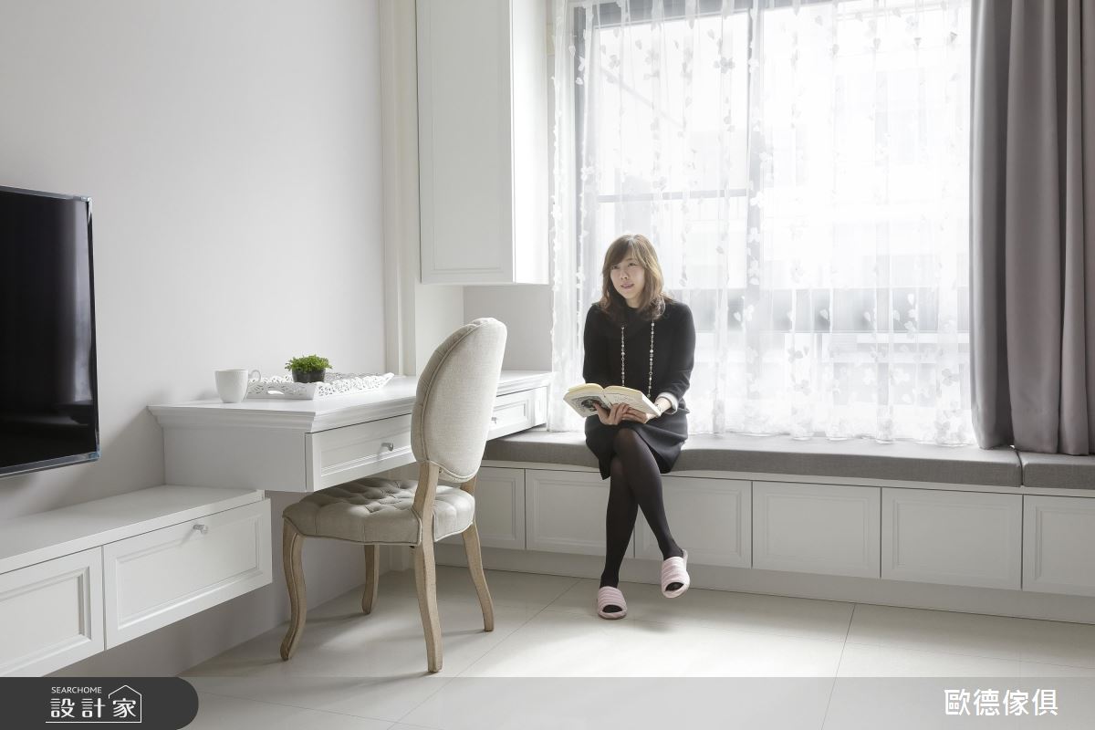 由於屋主喜愛優雅的美式風格,加上扣掉僅有前後採光以及單層面積不大的問題,設計師將大量純白線板應用在櫃體與天花板,搭配裸色調,營造簡約淡雅的氣息,更放大視覺感受。依據屋主的生活習慣,以白框玻璃拉門串連客廳與餐廚空間,打造隨心自如的開放設計。餐廳以白色木作打造迷你中島吧台,是女主人平時最能放鬆的空間。針對主臥設計,設計師於壁面與軟件注入淺紫色調,增添了浪漫柔美的氛圍,更於窗邊設置臥榻,同時兼具觀景與收納機能。