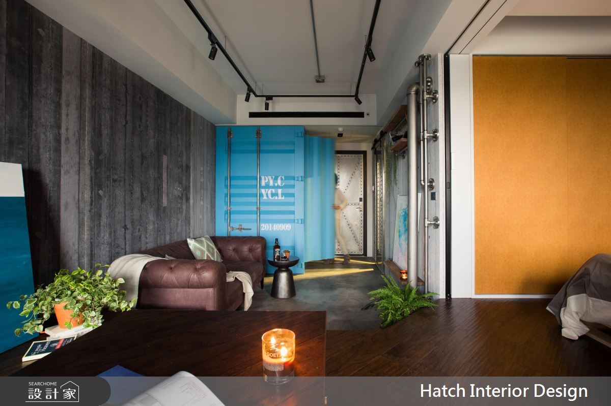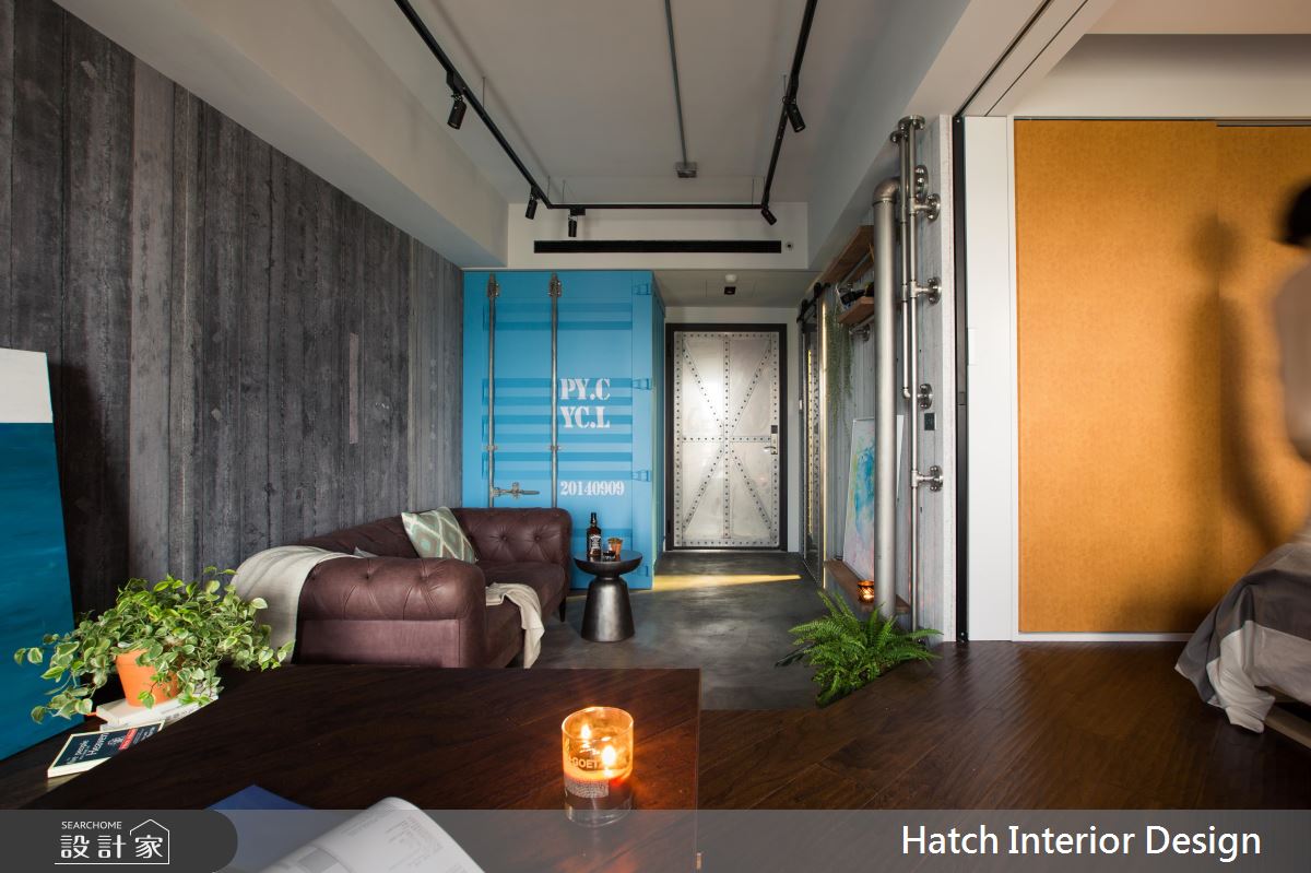 入門後右手邊設置一藍色貨櫃,繽紛色系為室內增添一處別具風格的角落,聚焦了空間視覺焦點,可移動式設計也讓小空間發揮更多機能,並增加變化性。