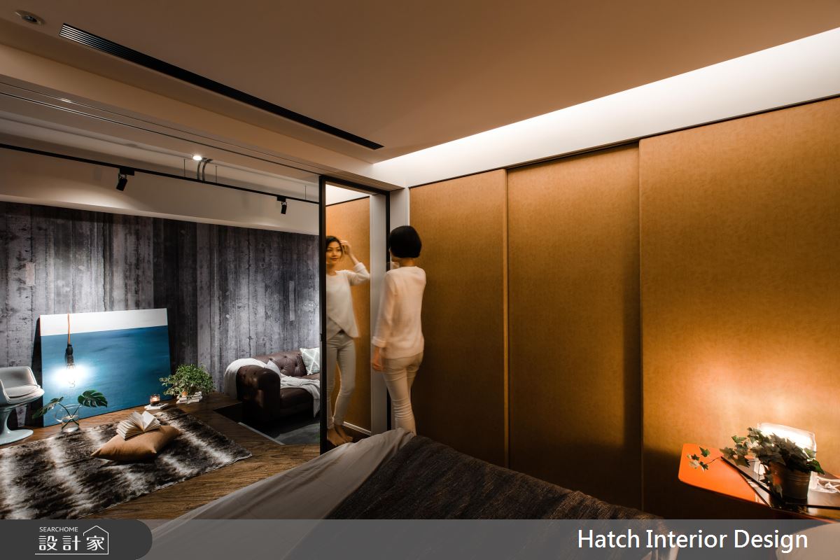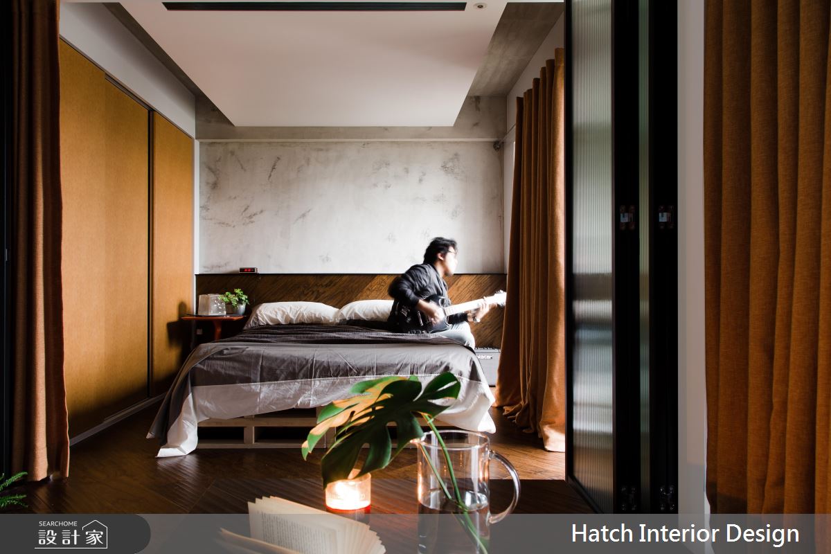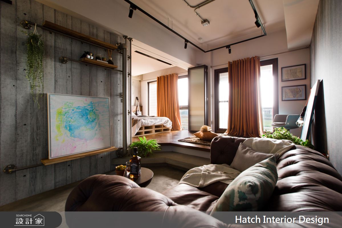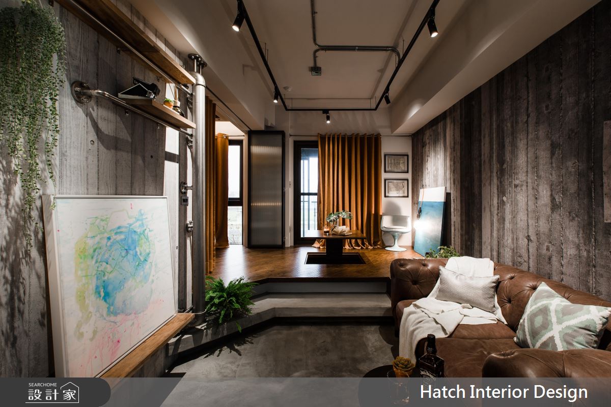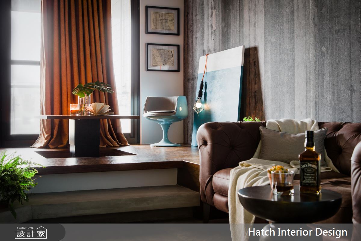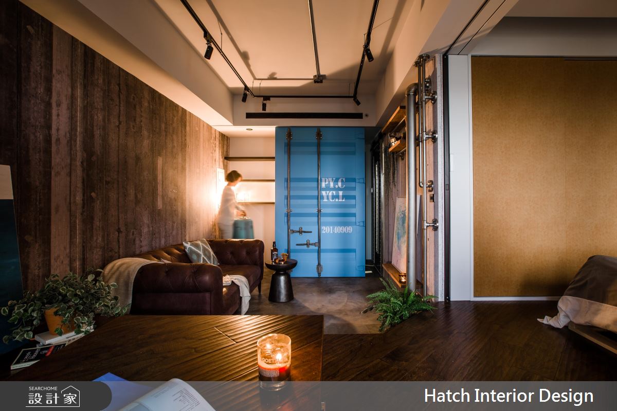 設計師運用水泥混搭金屬管造型牆面及焊接打造而成的鋼板門,將男屋主喜歡的粗曠感帶入空間。並在粗曠的氛圍中,運用進口壁材高質感增加空間精緻細膩度。為放大 11 坪小空間,將室內地板延伸入陽台局部區塊,並利用升降桌,增加空間使用機能,同時達到視覺延展效果。客廳與臥室中間以玻璃鐵框折門分割公、私領域,拉上折門時,具穿透性質的玻璃降低了空間縮小產生的壓迫感。地坪以水泥粉光與實木地坪穿插交織,平衡了室內冷暖度。整體空間的粗曠外表下帶有許多細膩精緻的設計巧思,值得讓人一再品味細究的有型空間。