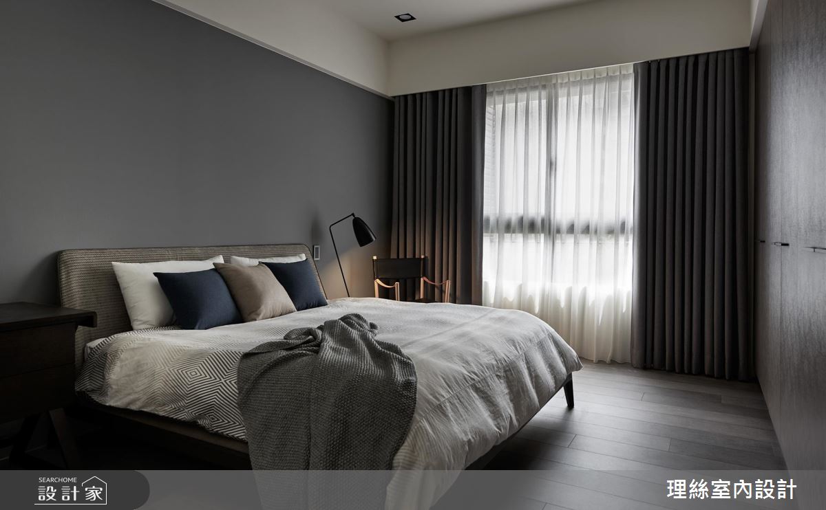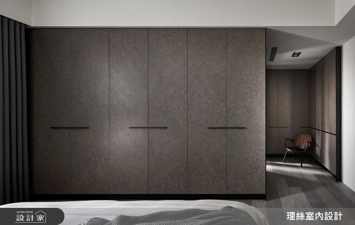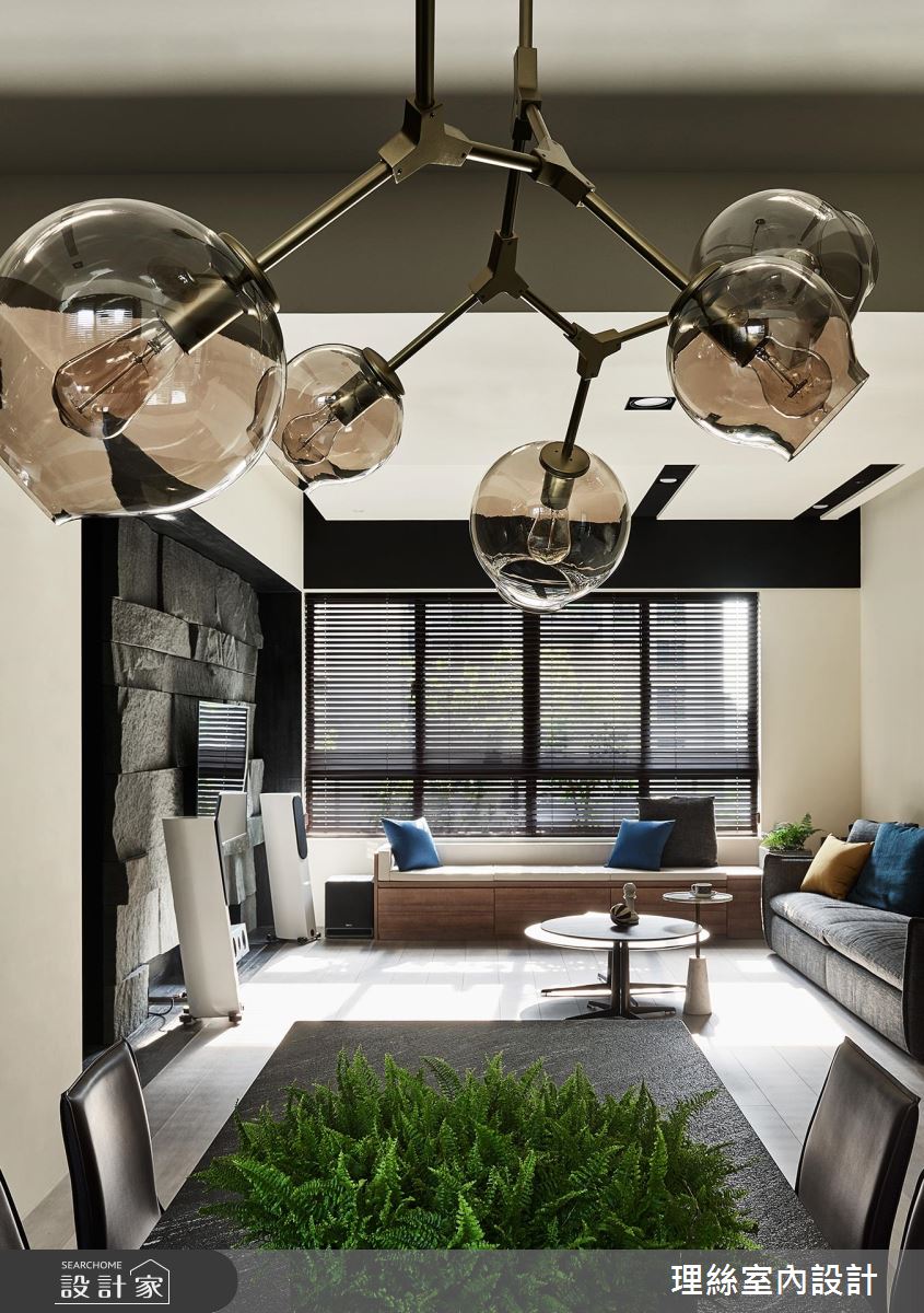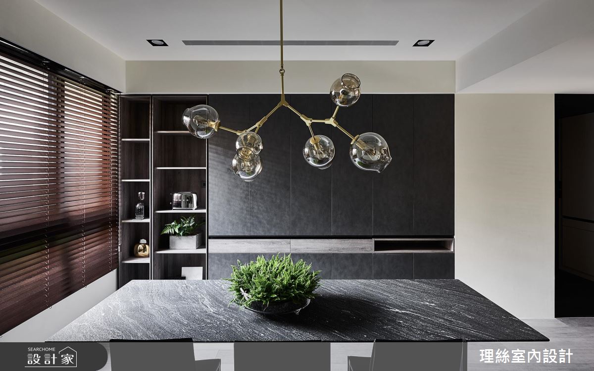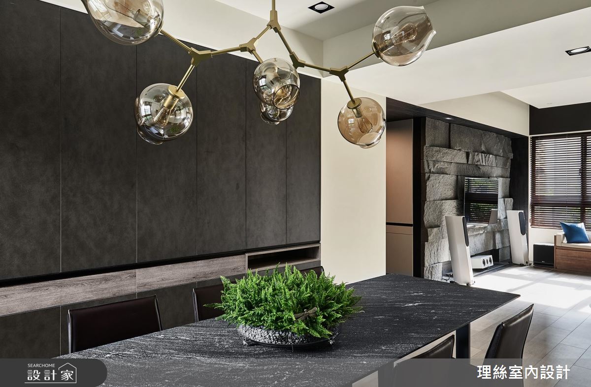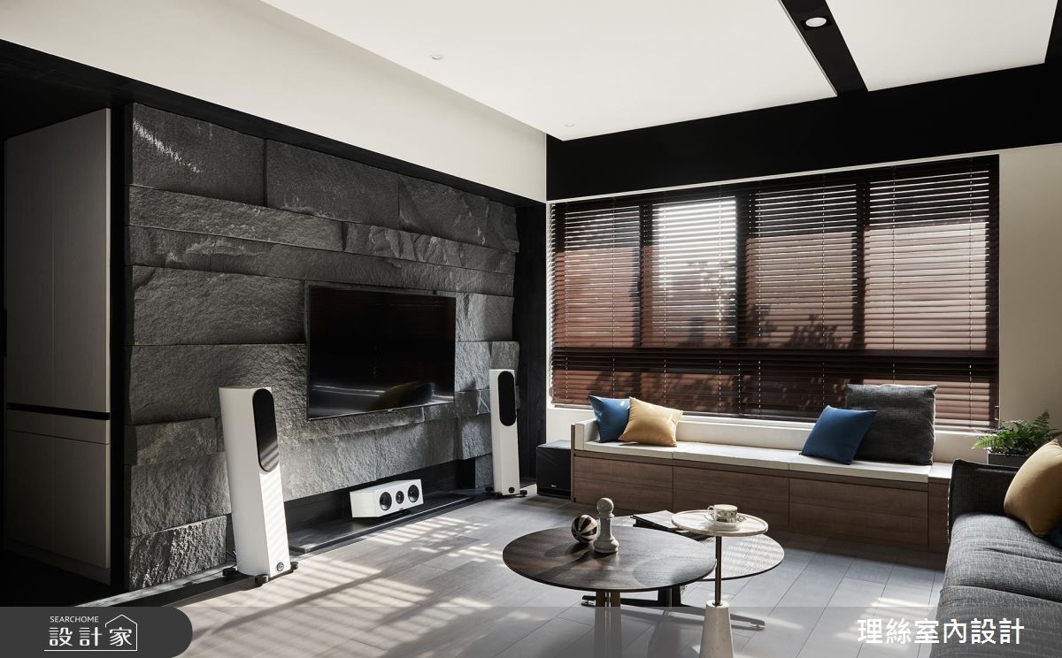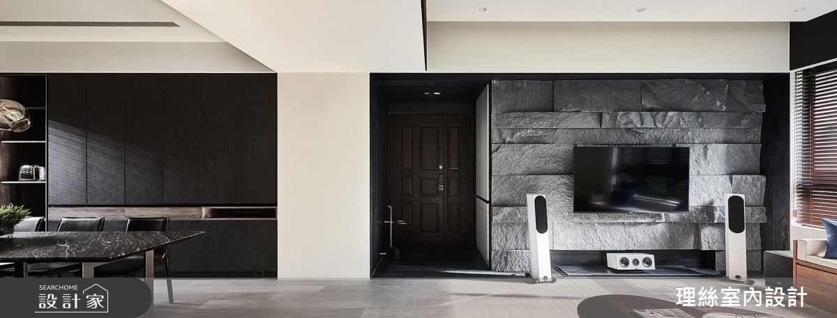 整體空間在不變動現有格局下,保留原有樑柱結構,透過裸露材質放大空間立體感,僅以乾淨、俐落的線條收邊;藉由裸色與灰墨色系交織出靜謐的空間基調,加上黑白色調鮮明對比,以及光影映照下,構築屋主夫妻倆日常的真實樣貌。電視牆面雖不大,利用粗獷感的石皮舖敘,再結合矩形的鐵件框構出玄關到整面牆體,賦予深邃的視覺漸層感,讓尺度全面拉闊開來,更顯寬闊氣勢;臨窗臥榻區替生活增添愜意氣息,臥榻下方結合木作收納,上方則以繽紛的抱枕點綴,挹注居家的人文溫度。餐廳空間裡,以粉光手揉感的櫃體門片作為呈現,巧妙與一旁的電視牆相互呼應,餐桌也以薄石材般的材質呈現,表面紋理刻劃出細膩美感,讓空間氛圍都生動起來。