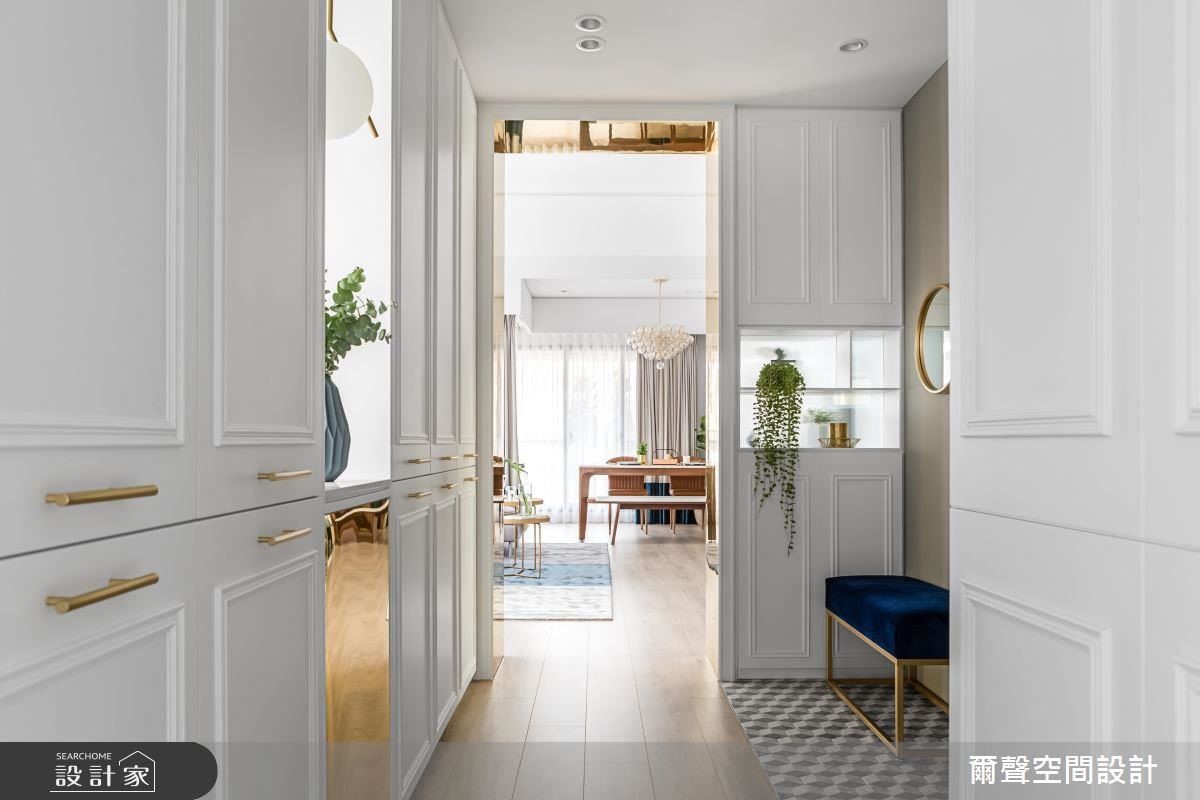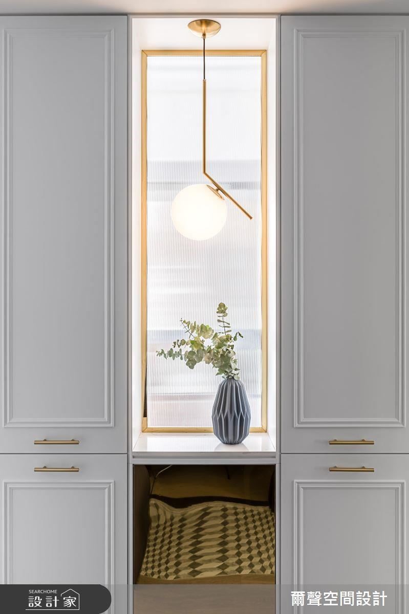 原有玄關面對鞋櫃與次臥拉門,採光受阻,而且落塵區等同於通往兩側公私領域的通道,反而把髒汙帶進屋內。因此,兩位設計師將玄關放大,左右分別是深淺不同的櫃體及衣帽區,可放行李箱與外出外套,前方牆面則設計為鞋櫃收納,最特別的是,以小冰柱玻璃紋路細密卻透光的特性,分享次臥光線,加上別致燈具,打造成進門最亮眼的端景。並以金色的法式門拱,展現迎賓的氣派。