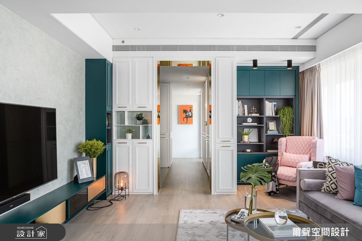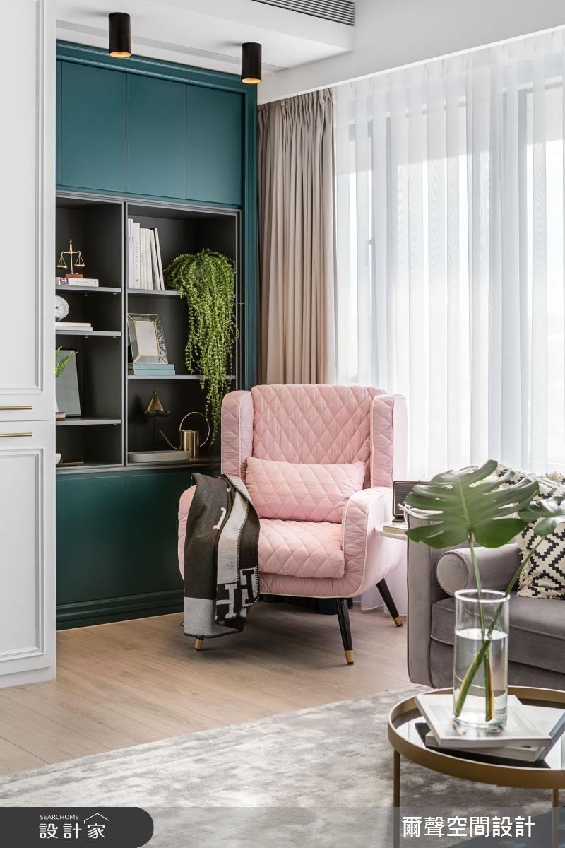 客廳最吸睛的,其實是色彩的表現,並以收藏畫作妝點,前衛而且時尚。以屋主喜愛的寶石綠最為搶鏡,像電視櫃、櫥櫃,以及窗簾的配色,再融入金與粉的點綴,恰如其分的比例,讓極具個性的色彩在沉穩中更顯跳脫。尤其是門拱旁的櫃體,一側中空嵌上小冰柱玻璃,讓客廳採光也讓透進玄關;另一側則是寶石綠櫃體加粉色單椅,安裝兩盞女主人最愛,外黑內金的造型投射燈,這裡是她喝咖啡、閱讀,可以發呆的角落。