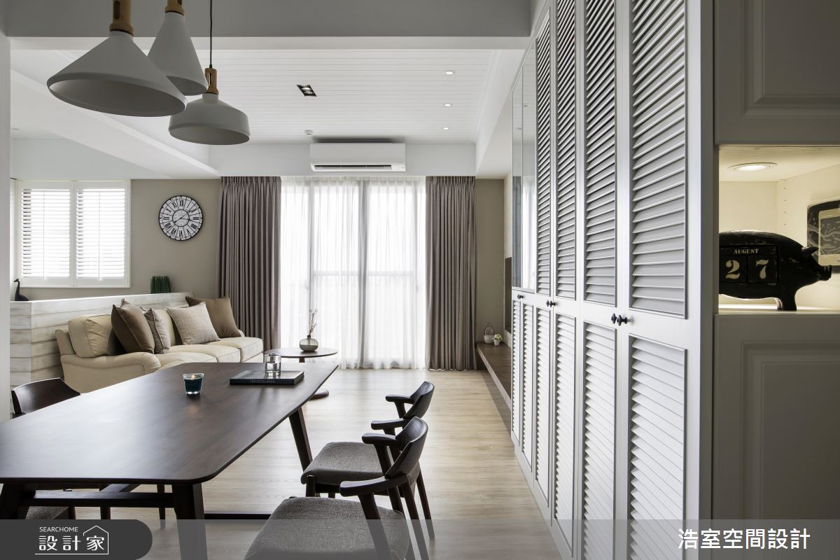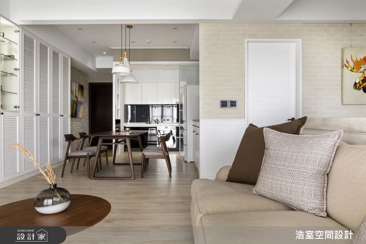 60 坪美式風宅邸,運用文化石牆、線版設計搭佐風格配件,帶出美式風格,空間中米白色系混搭淺調木質,呈現舒適柔和的居家氛圍,各空間大小配置良好,並規劃一間多功能客房,以備未來需求靈活運用。