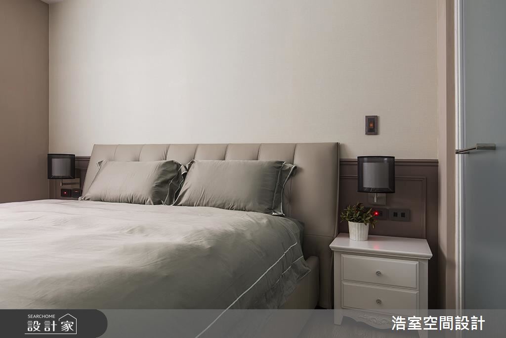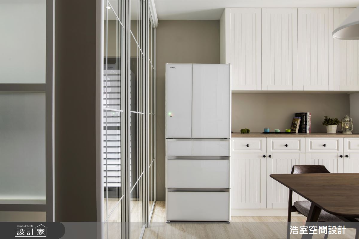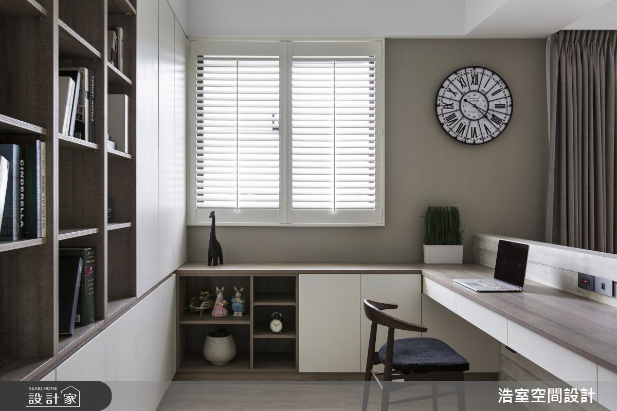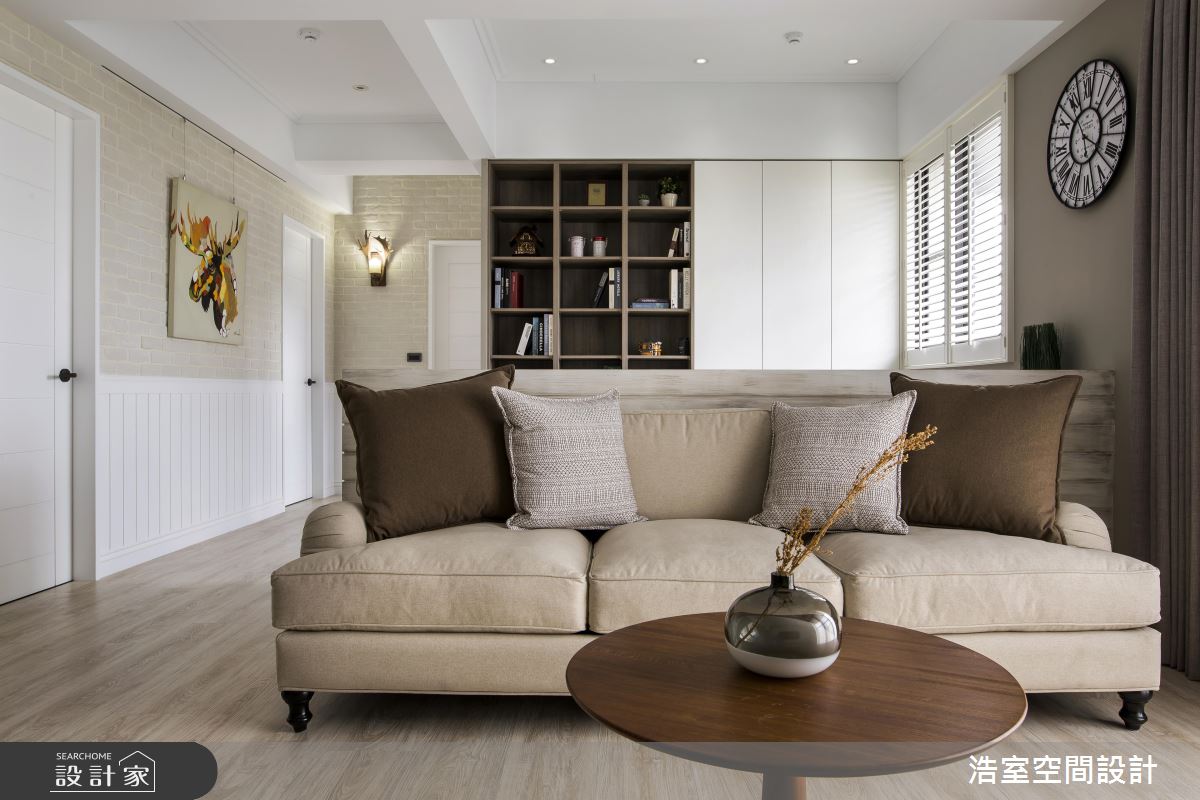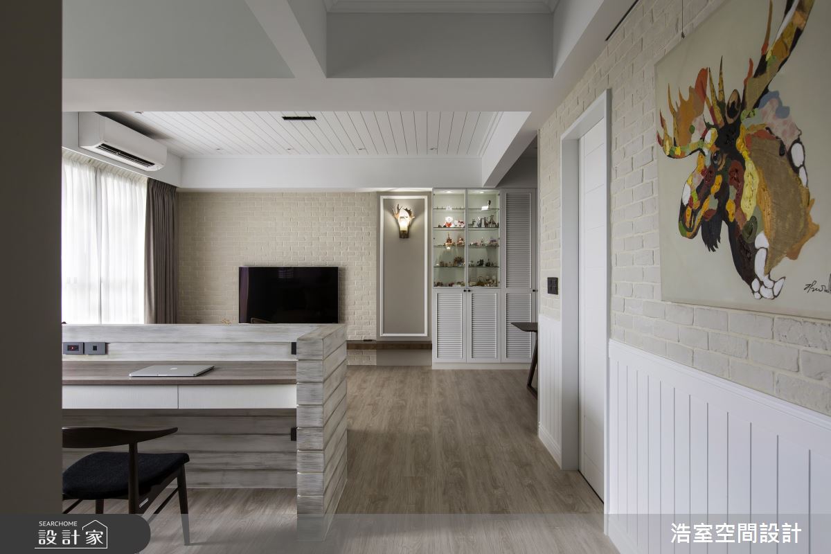 玄關處地坪利用拼接花紋與木質地板作分野,櫥櫃的線板設計、壁面的文化石與天花板線條彼此相呼應,展現美式風格。入口處左手側設置廚房,因公共空間採開放式設計,故加裝玻璃拉門將油煙阻擋,同時善用其通透特性,不壓縮視覺空間感。落地窗與書房窗戶為同一側,為公領域注入充足光源,而設計師也善用此優勢,以一道矮牆區隔書房與客廳,將不同機能空間獨立於開放式公領域,並讓光線自然流暢於室內。書房與客廳中間別具風格的時鐘、藝術掛畫,為整片淺色系視覺帶出亮點。私領域則以質感杏色調搭佐木質呈現,延續整體空間風格,並營造更加放鬆紓壓氛圍。