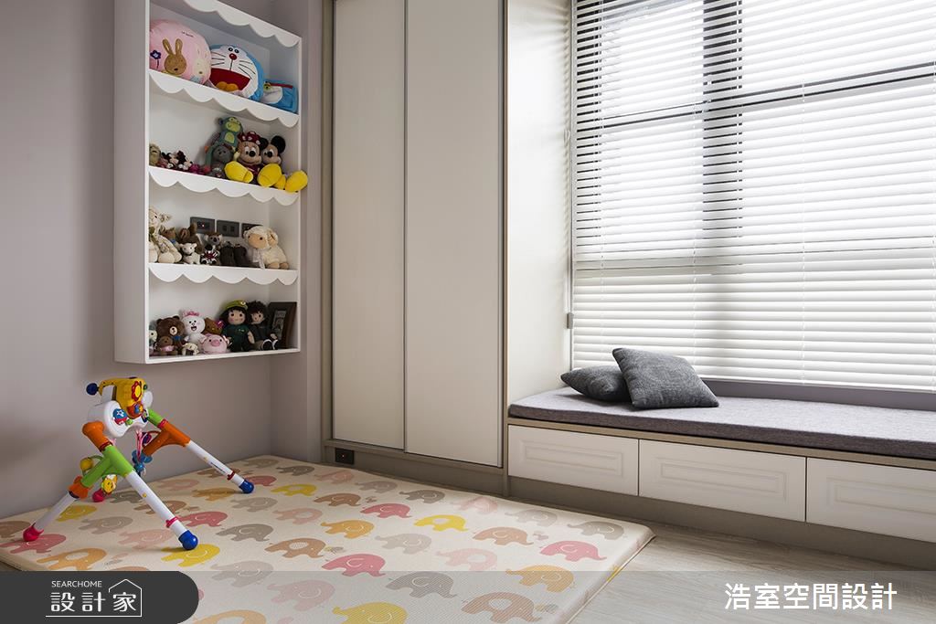 小孩房利用展示層架收納玩偶,具備妝點空間效果,活潑氛圍;窗戶一側設置日光臥榻處,為遊戲區注入更多自然光源,增加空間活力感。