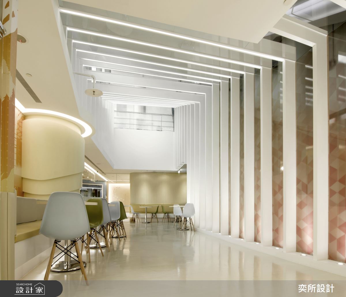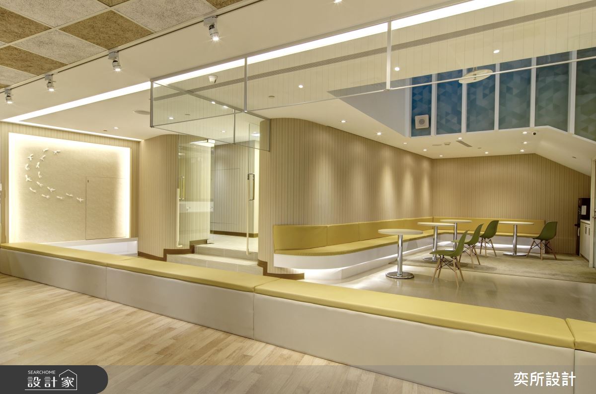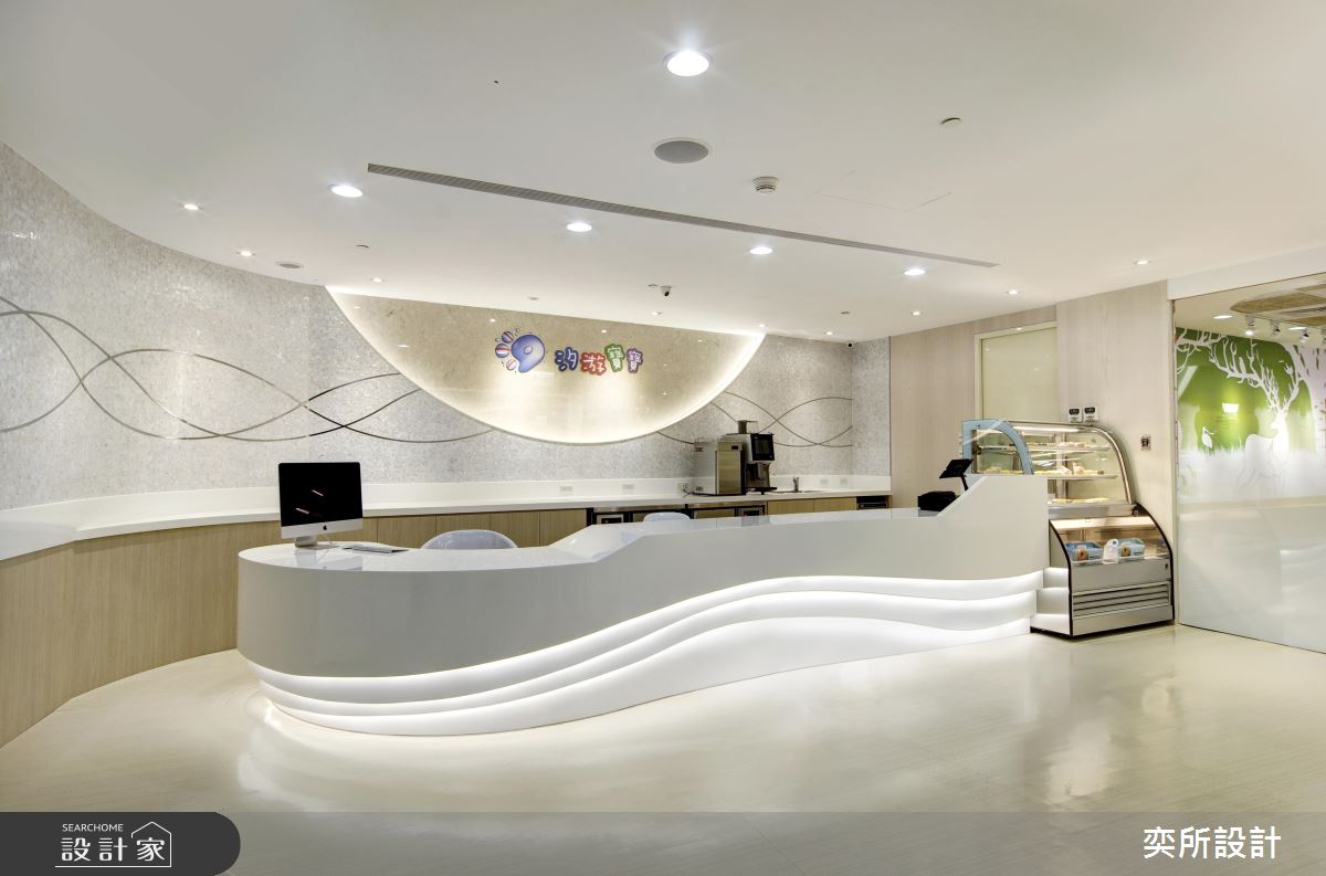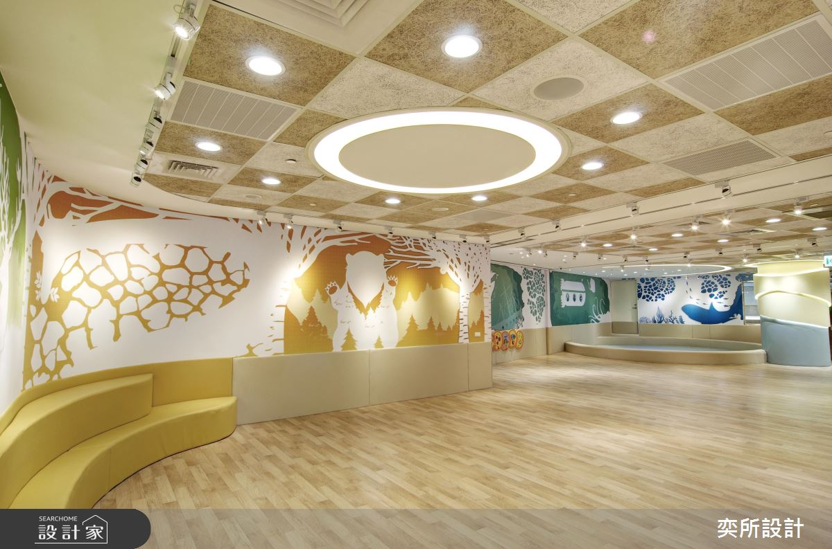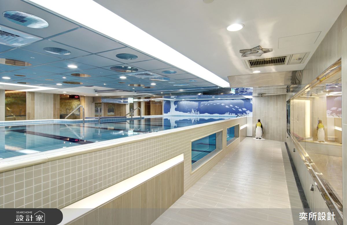 空間內,設計師除了採用環保無毒建材、提供安全的環境之外,更引進國外獨特設施,創造出時尚貼心的教學環境;櫃檯處,加入流線元素締造高質感畫面,搭配燈光照明,烘托出高雅的接待場景,泳池教室則以大面玻璃營造通透場景,搭配全景視窗規劃,讓在外的家長們可現場同步參與孩子的課程,而泳池上方更加入獨特的鏡面與燈光,藉此吸引寶寶們的注意力並兼具安撫情緒功用;休息區、活動區之間,則配置了低圍牆做領域界定,方便家長關注小孩們動態,活動區立面更特意選用防撞設計與木紋軟墊,打造更為安心奔跑的使用情境!