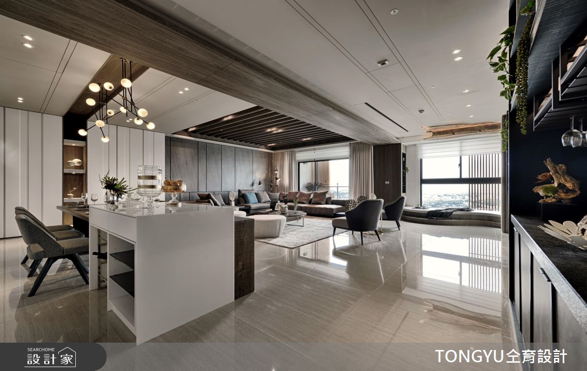 設計師透過多元建材及壁面造型劃分場域,客廳區,採以大量沉穩色調家具,展現自然與人文的結合,在木色的溫潤之中,與淨白的餐廚領域形成對比,而客廳天花更拿線條比例,運用木質包覆樑體,同時帶入俐落分明的線性延伸,達成延展放大的空間尺度,角落更刻意讓天花壁面呈現鏤空造型,帶入大樹攀沿而上的意象,搭配臥榻融為一體,圍塑成一處紓壓天地,窗邊則引入採光與遼闊景致,令人可隨時向外眺望海景,在自然景觀之中,感受深刻的心靈沉澱!