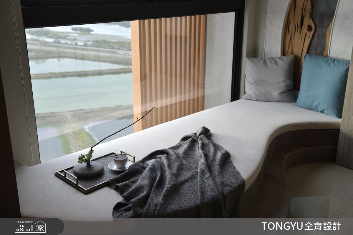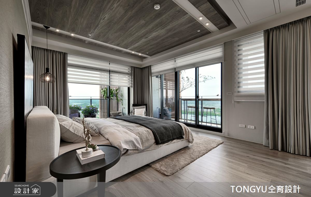 主臥內,呈現 L 型動線,劃分出實用的多元機能,並延續公領域色調,以木質雅韻做基底,搭襯落地窗外的陽台兼觀景台,在日光與景色之下,讓人有如置身於度假飯店般,可擁抱極佳的舒眠氛圍!