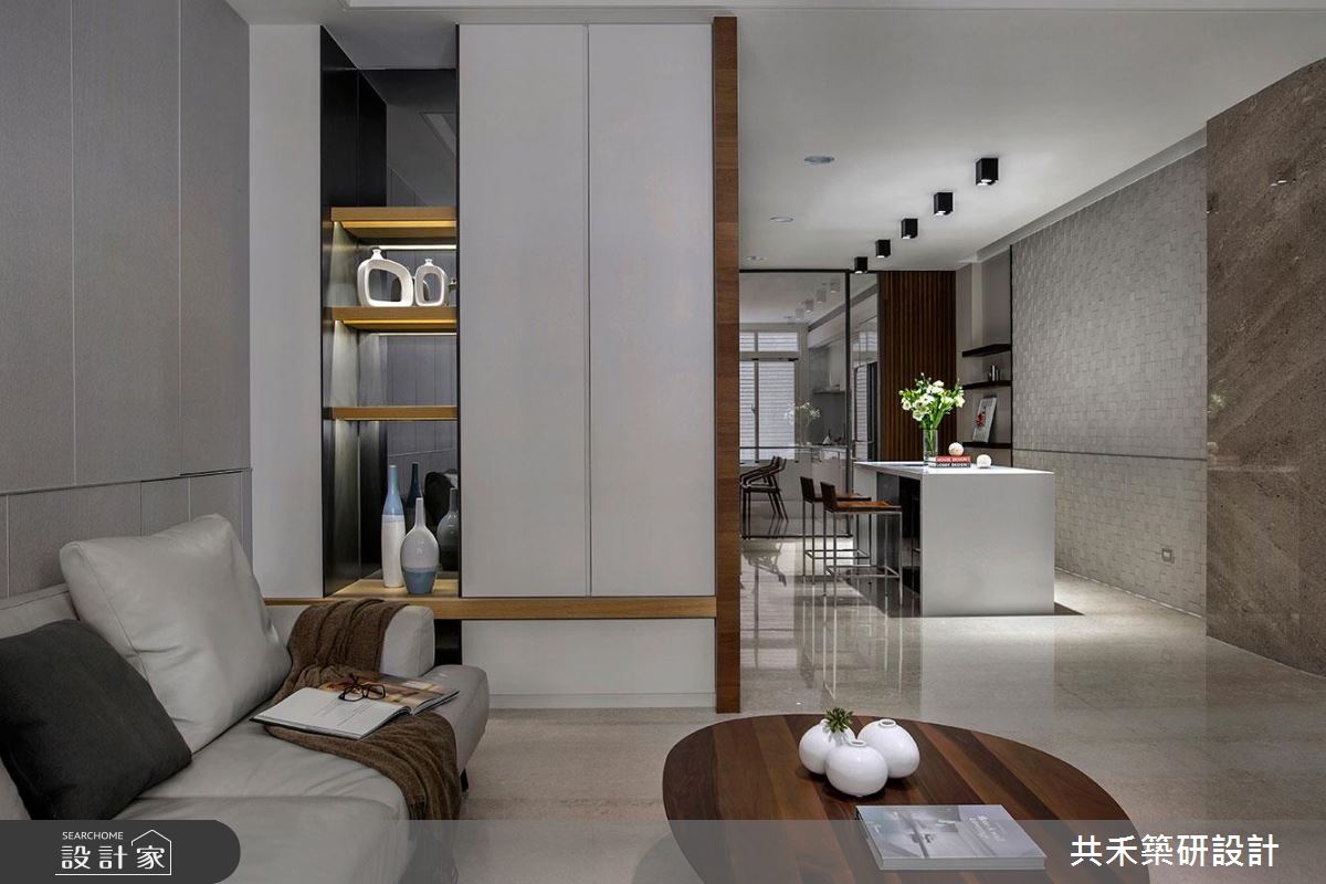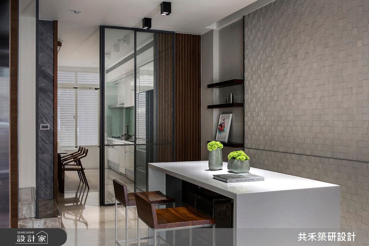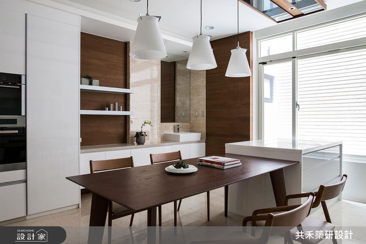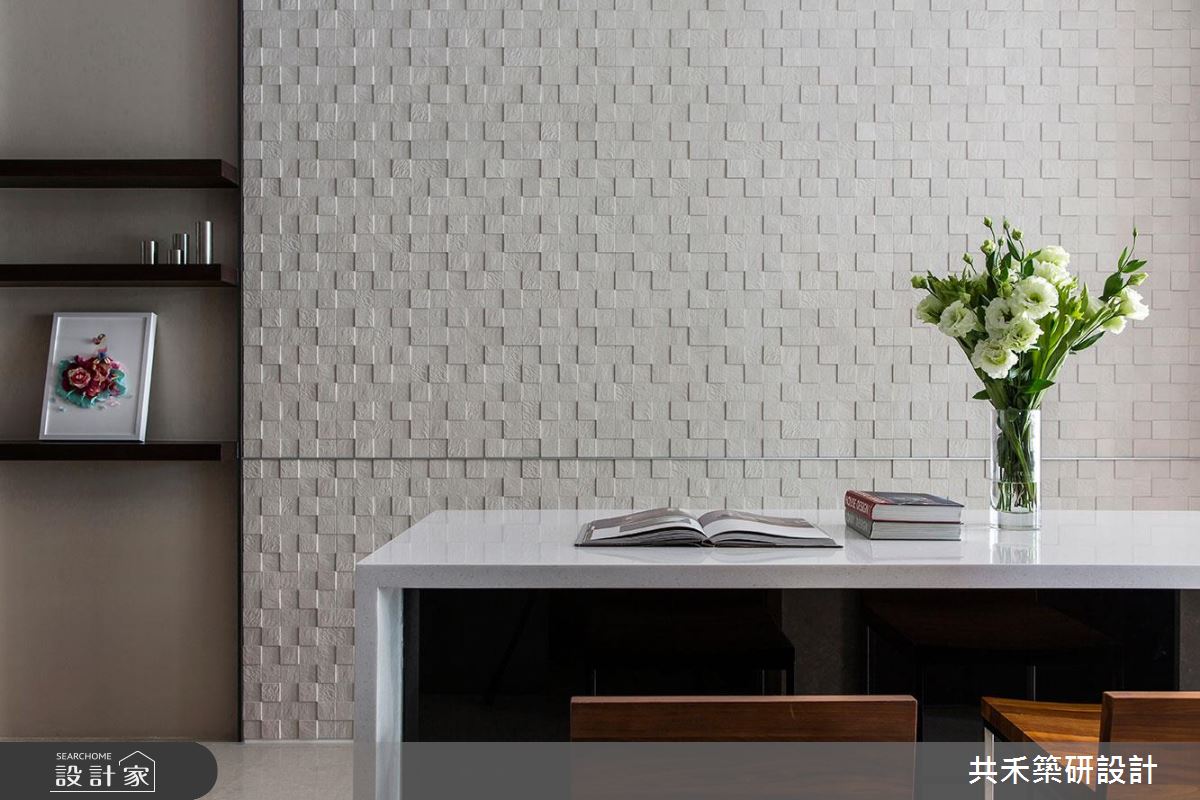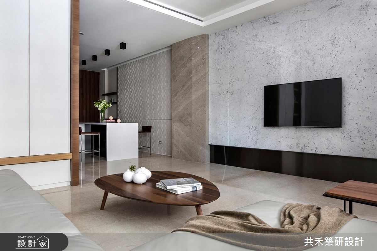 白色大理石舖敘整面電視牆,下方以黑色大理石呼應電視的黑色螢幕,更營造出非凡氣勢;L型米色調的皮革沙發,圍塑出最愜意的姿態,灰色調的沙發背牆以金屬勾勒出層次,一旁的收納櫃結合展示層架,隨著內嵌光源的映照,烘托陳列其中的藝術器皿,展現優雅的人文氣息;寬闊的餐廚區裡,以米色調石材舖陳的壁面,凹凸立面展現視覺層次,而白色調吧檯區域,無論是閱讀、享用佳餚或是跟親友暢談,都是非常好的場域空間;隔著玻璃拉門,來到餐廳空間,戶外光線隨著窗戶引入室內,空間裡像被刷洗過一樣,呈現潔淨明亮之感,原木質感的餐桌擺設,醞釀溫潤療癒的氛圍,與局部木作壁面相互呼應,替現代風的室內空間挹注自然生氣。