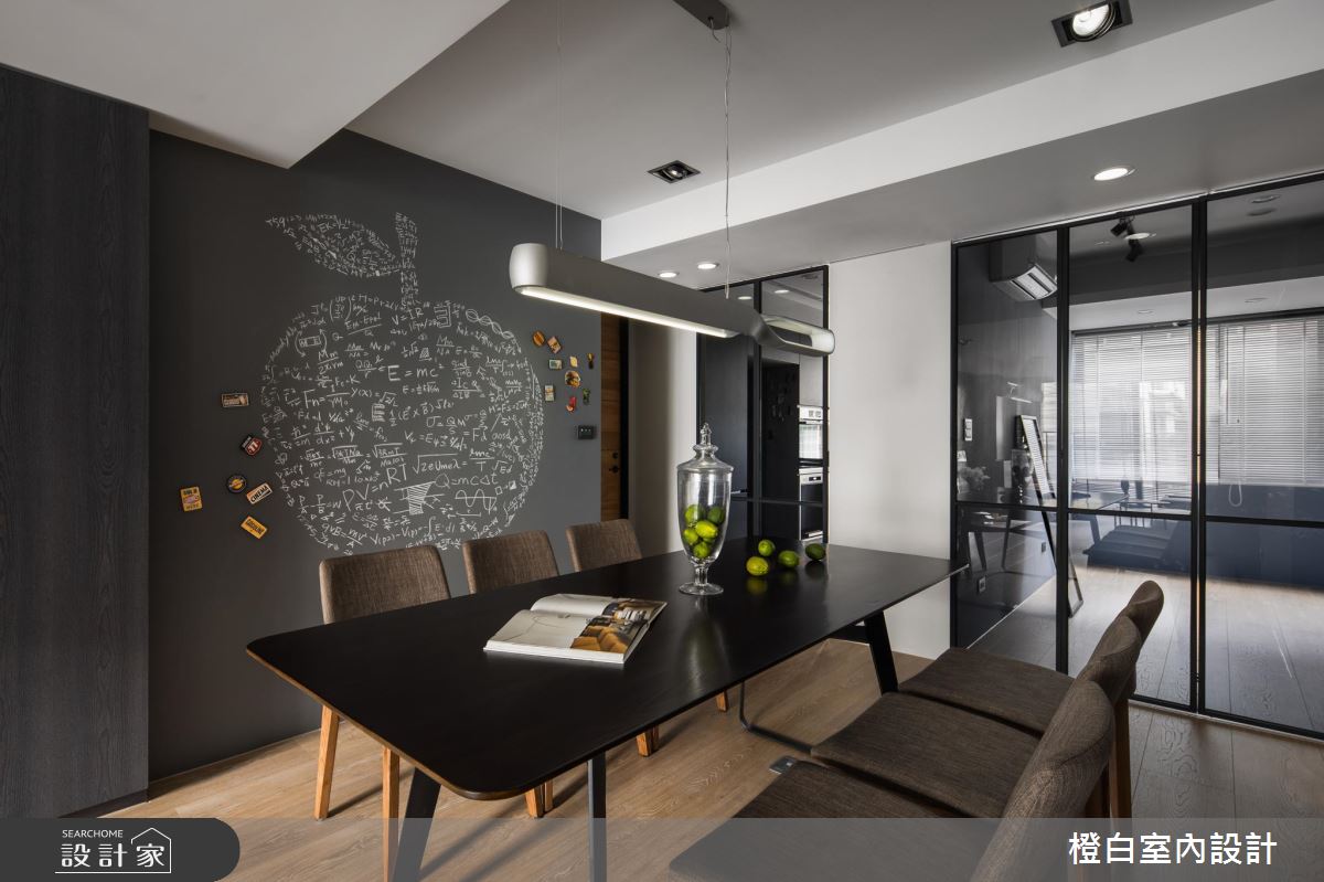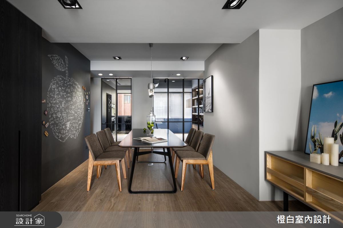 設計師破除格局不均問題,以簡單開闊的動線串連公共區域,由於老屋基地狹長且大門位於中間位置,因此設計師巧妙抹除制式玄關設計,以畫作與櫃體做為迎賓端景,沙發背牆漆上淡雅灰階色調,與電視牆的大理石天然紋路互相呼應,賦予紓壓的沉靜效果。順應常邊軸線鋪陳的木地板,為開放空間帶來無限延伸的視覺感受,餐廳以黑板漆打造充滿童趣的個性畫面,後端的書房與廚房皆以摺疊玻璃拉門打造兼具採光與獨立空間的雙重機能。