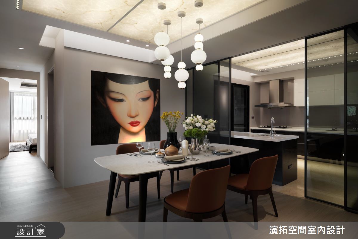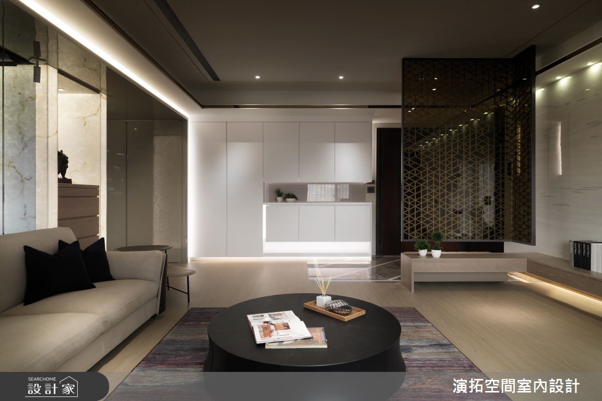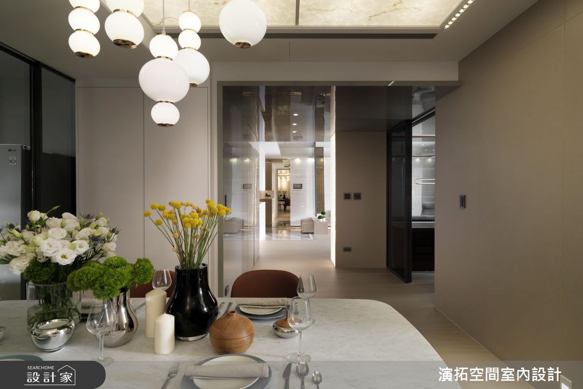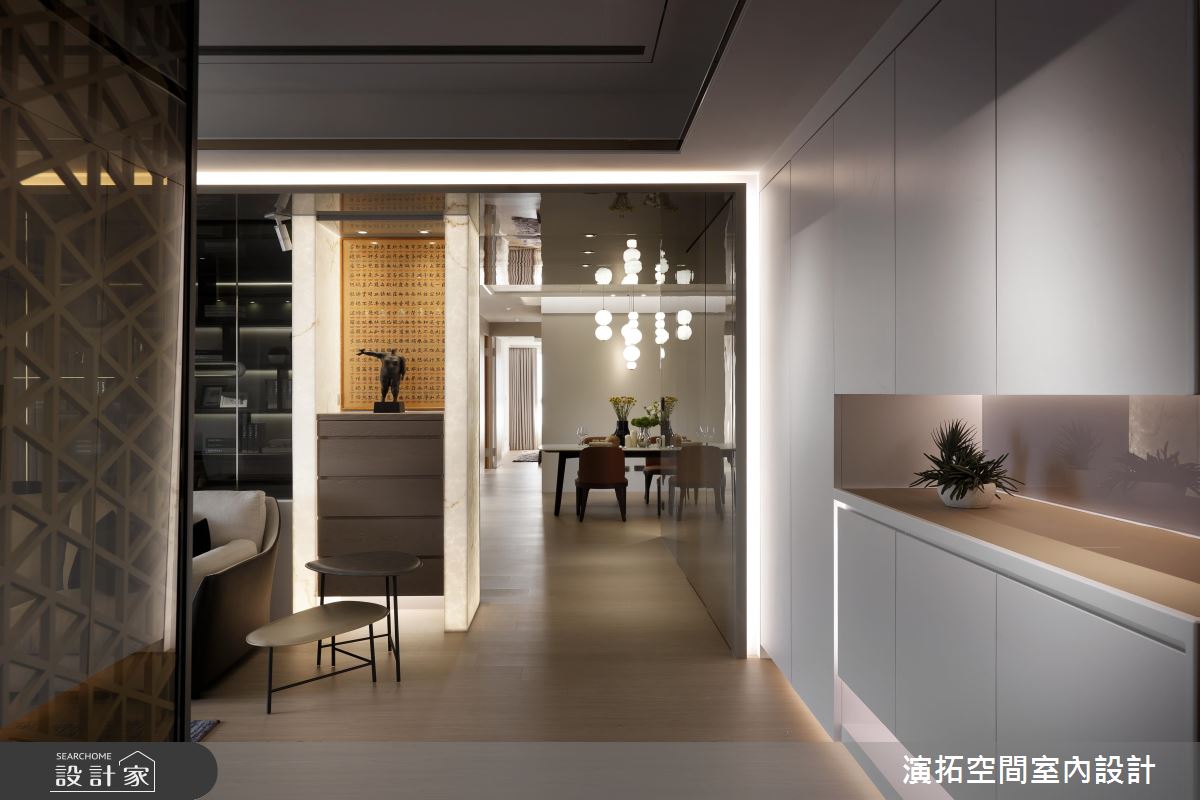 玄關作為落塵區,以石材地坪與室內木地板做界定,同時打造鏤空的屏風設計,並做出 L 型轉折,與客廳電視牆形成串接,化為流暢的立面表情;客廳則透過落地窗導入景色與採光,搭配沉穩的大地色家具陳列,型塑敞亮和諧的空間基底,沙發旁側更以透光石結合燈光照映,無違和的將東方風端景融入整體設計中,且為了化解天花橫樑壓迫,以光帶做出天與壁的飾邊,無形中框塑出美麗的框景;餐廚區,以流明天花搭配吊燈烘托柔和光線,並加入大幅畫作網羅聚焦效果,而廚房內部皆採用上掀式廚具,依循屋主習性規劃使用情境!