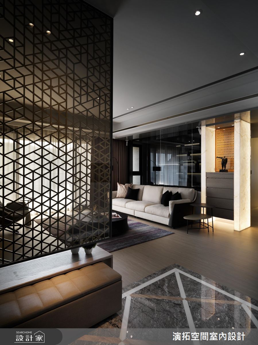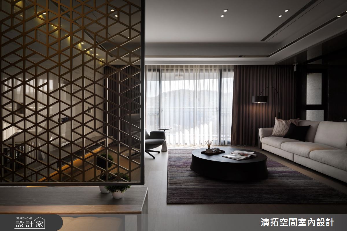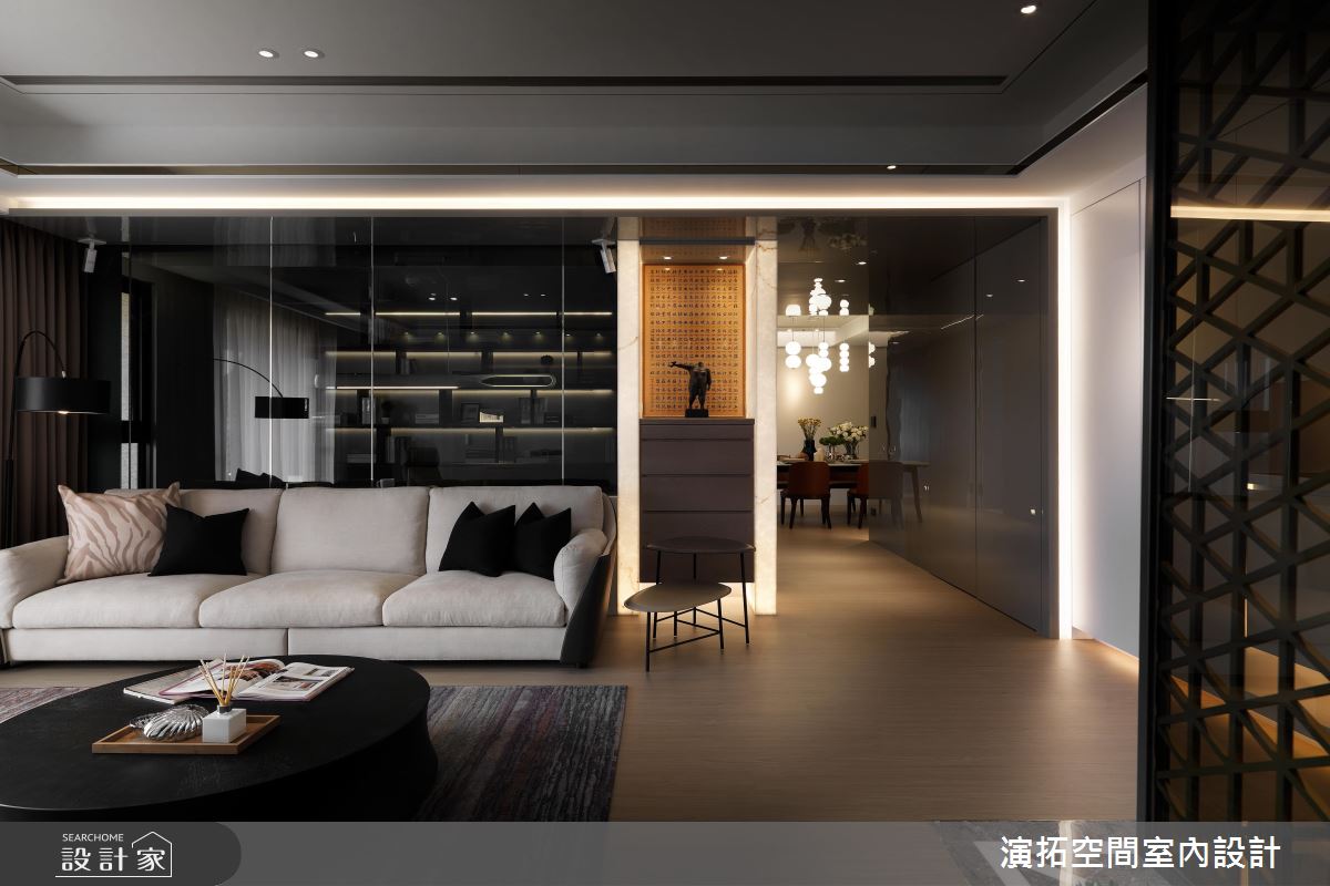 玄關作為落塵區,以石材地坪與室內木地板做界定,同時打造鏤空的屏風設計,並做出 L 型轉折,與客廳電視牆形成串接,化為流暢的立面表情;客廳則透過落地窗導入景色與採光,搭配沉穩的大地色家具陳列,型塑敞亮和諧的空間基底,沙發旁側更以透光石結合燈光照映,無違和的將東方風端景融入整體設計中,且為了化解天花橫樑壓迫,以光帶做出天與壁的飾邊,無形中框塑出美麗的框景;餐廚區,以流明天花搭配吊燈烘托柔和光線,並加入大幅畫作網羅聚焦效果,而廚房內部皆採用上掀式廚具,依循屋主習性規劃使用情境!