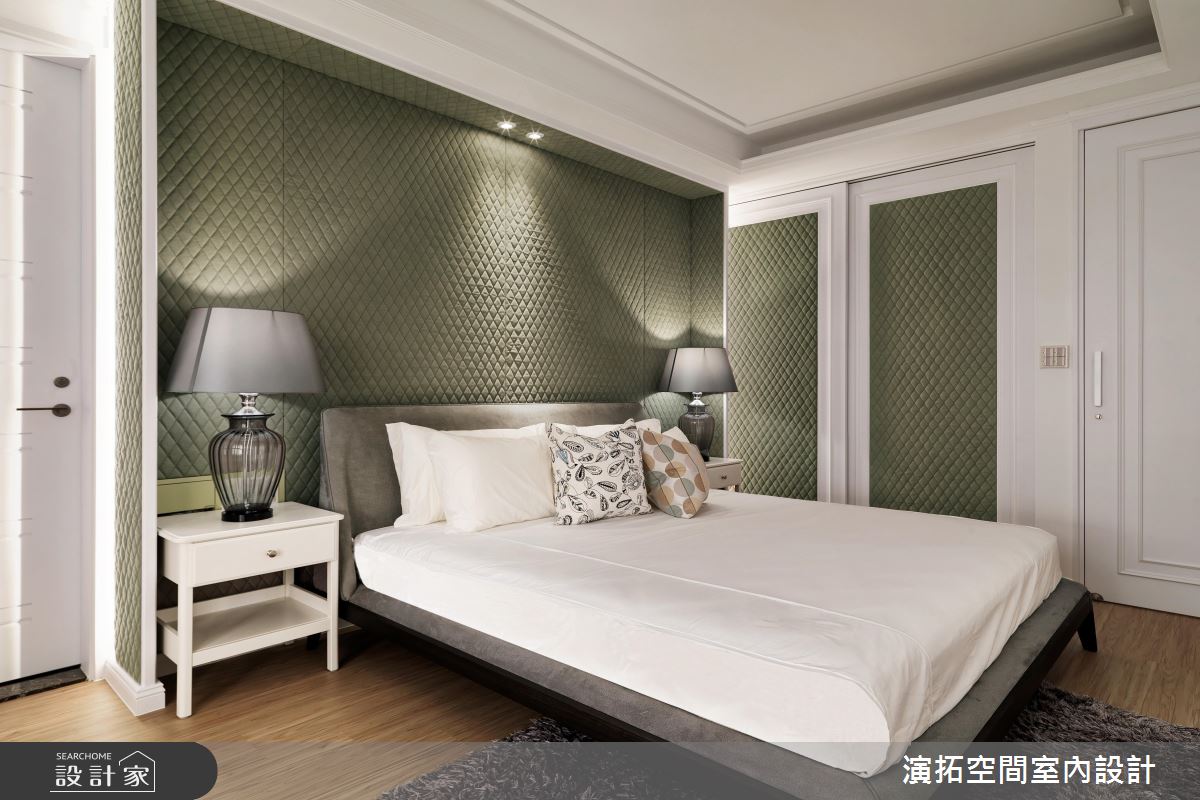 主臥以綠色菱格紋裱布鋪敘床頭,搭配純白色軟件,型塑優雅質韻,而衛浴、更衣區則安裝地暖設備,提升使用上的舒適度!