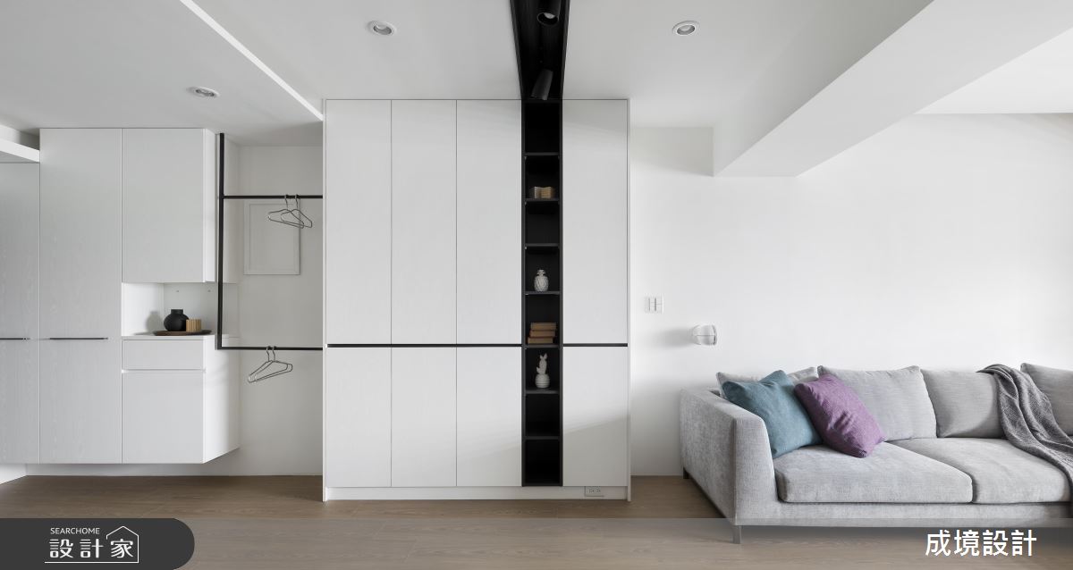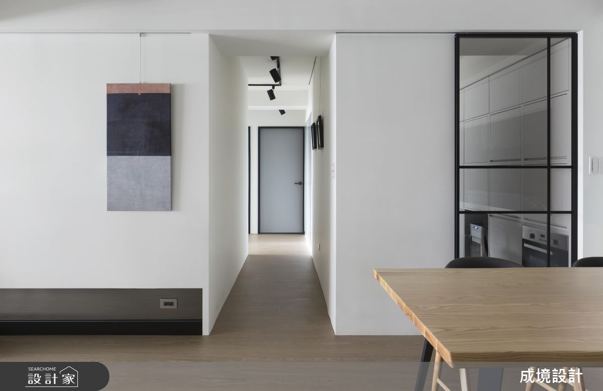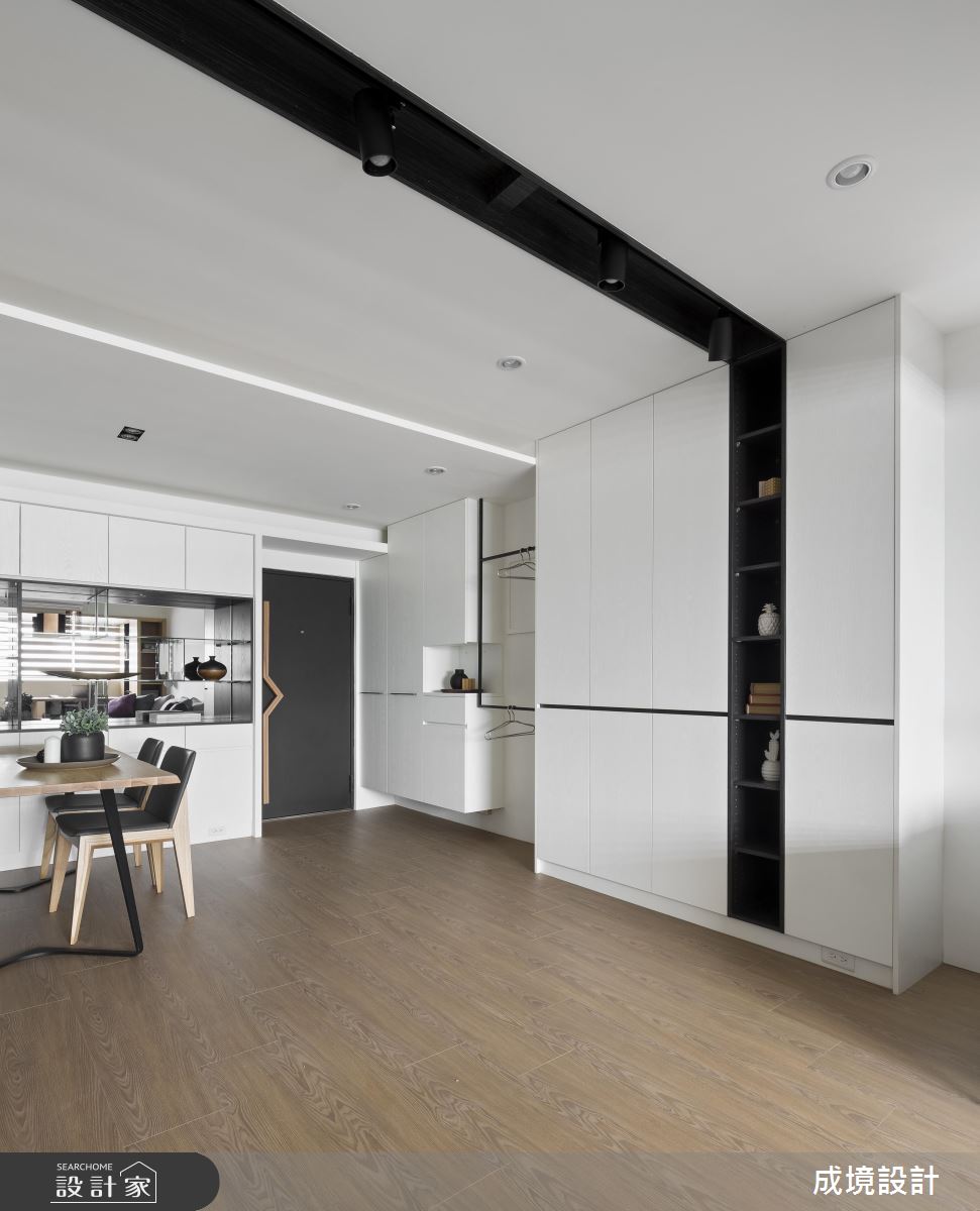 公領域呈現開放規劃,並引用經典不敗的黑白色作為設計主調,搭配鐵件的立體勾勒,彰顯明亮簡潔、寬敞大器的簡約質感,客廳窗邊則安置閱讀書房,巧妙地融入廳區互動之中,而櫃體與櫃體之間更巧妙安置了鐵件衣架,除了成為現成的掛衣處之外,也製造了線性的趣味串聯;廚房,依循女主人需求,將一切電器都收納到櫥櫃中,餐廳則刻意在牆面加入鏡面,不只放大空間感,也形成視覺延伸的趣味錯覺;主臥,以木質鋪敘床頭,且暗藏大容量的收納機能,小孩房亦加入書桌與多功能書櫃等,且一體整合不浪費絲毫空間,清爽、簡約且功能齊全!