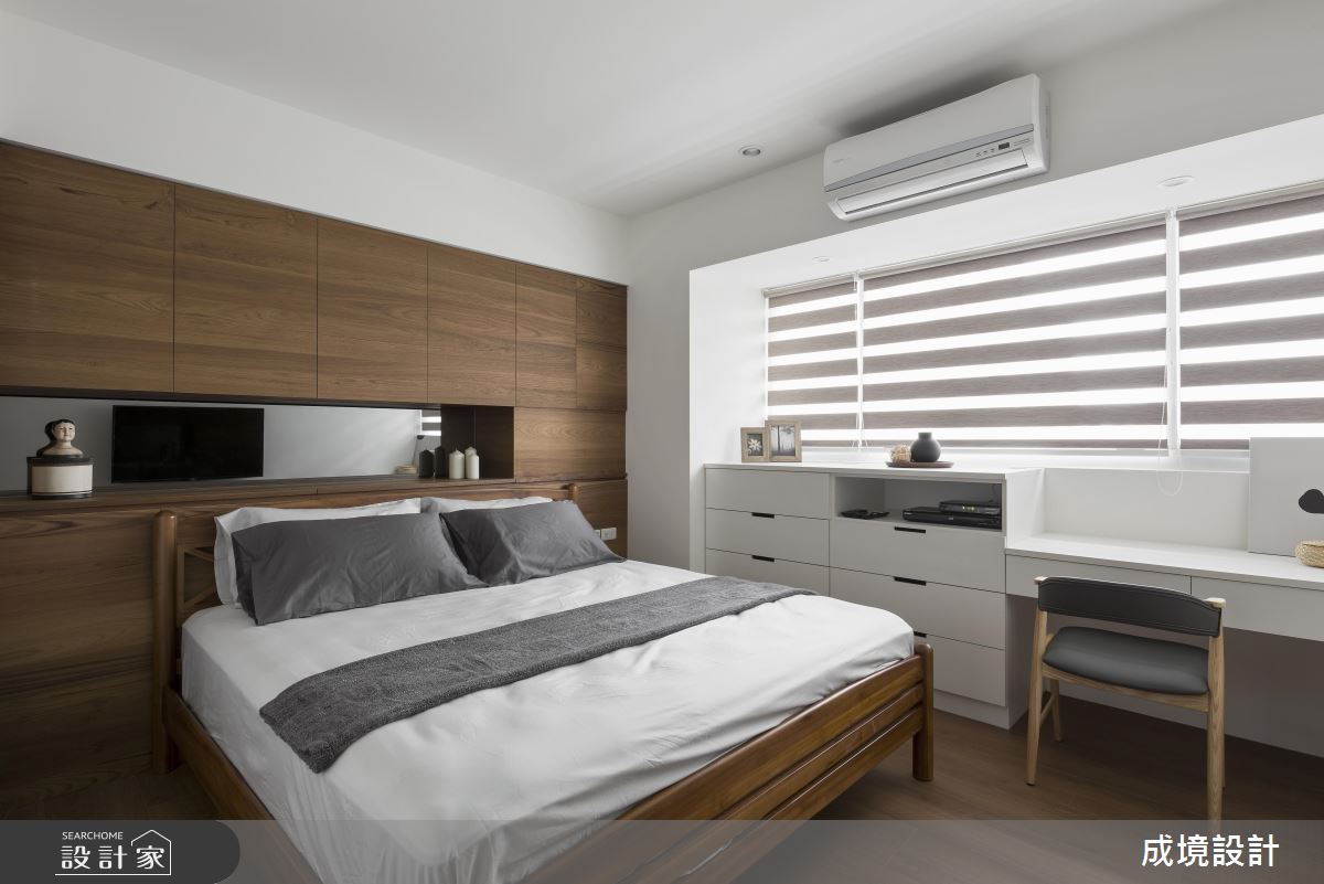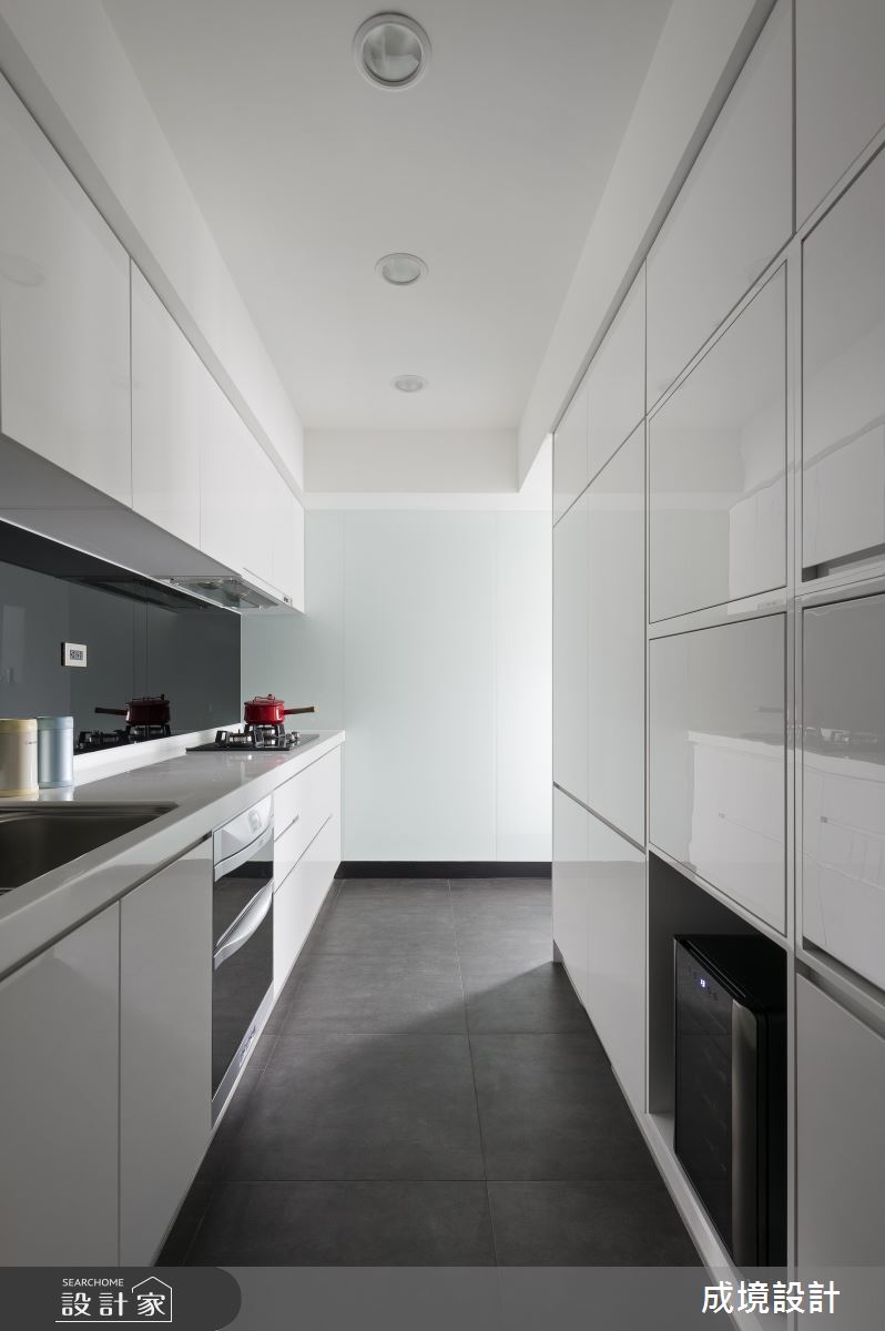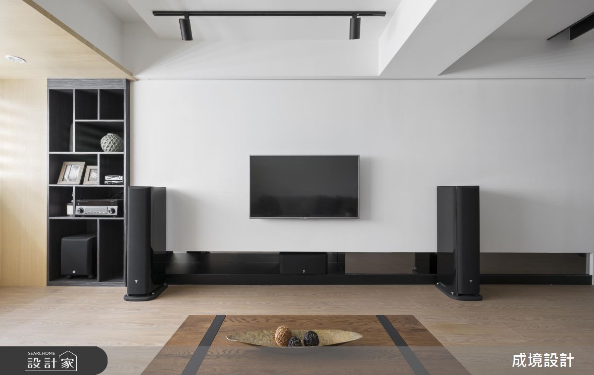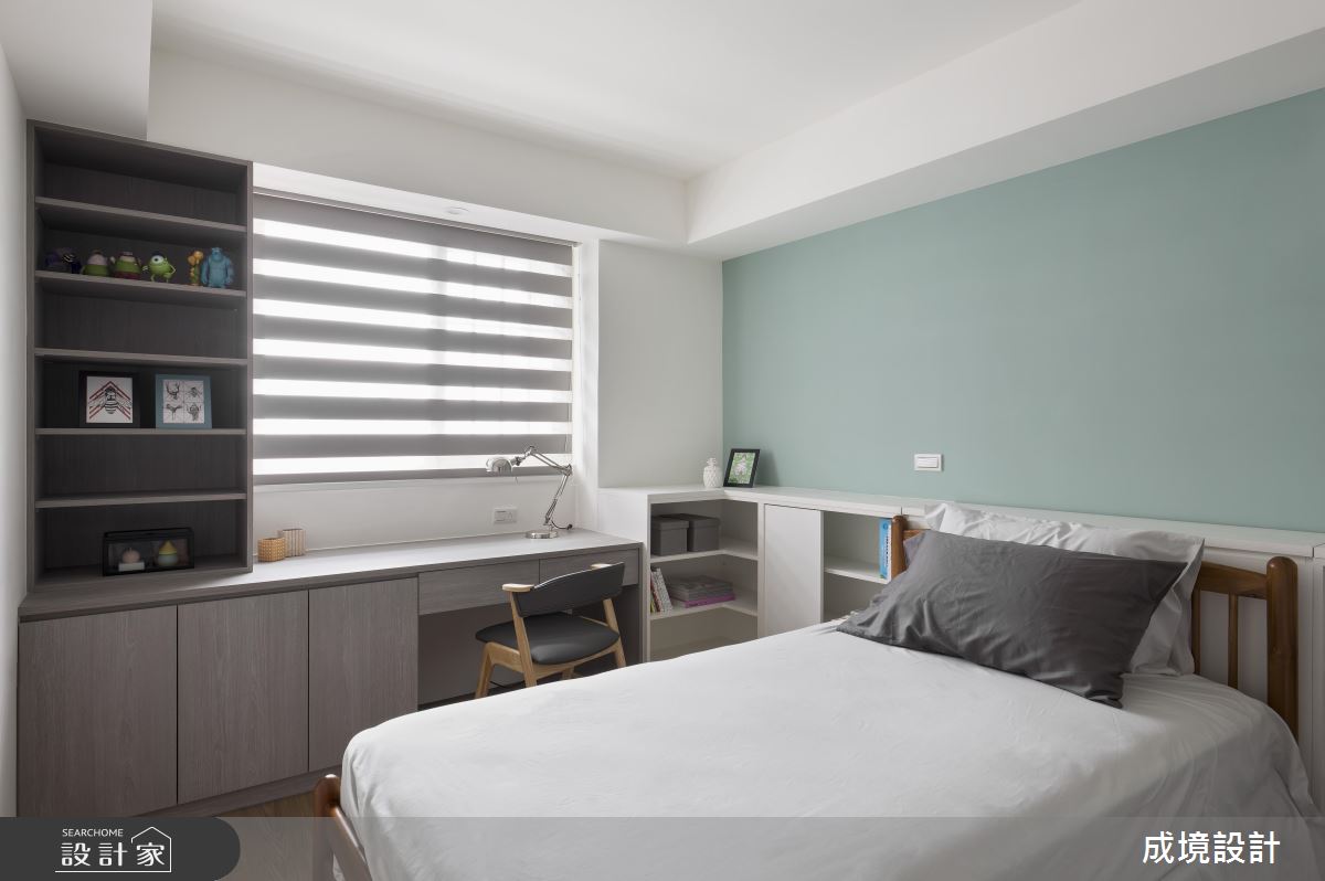 公領域呈現開放規劃,並引用經典不敗的黑白色作為設計主調,搭配鐵件的立體勾勒,彰顯明亮簡潔、寬敞大器的簡約質感,客廳窗邊則安置閱讀書房,巧妙地融入廳區互動之中,而櫃體與櫃體之間更巧妙安置了鐵件衣架,除了成為現成的掛衣處之外,也製造了線性的趣味串聯;廚房,依循女主人需求,將一切電器都收納到櫥櫃中,餐廳則刻意在牆面加入鏡面,不只放大空間感,也形成視覺延伸的趣味錯覺;主臥,以木質鋪敘床頭,且暗藏大容量的收納機能,小孩房亦加入書桌與多功能書櫃等,且一體整合不浪費絲毫空間,清爽、簡約且功能齊全!