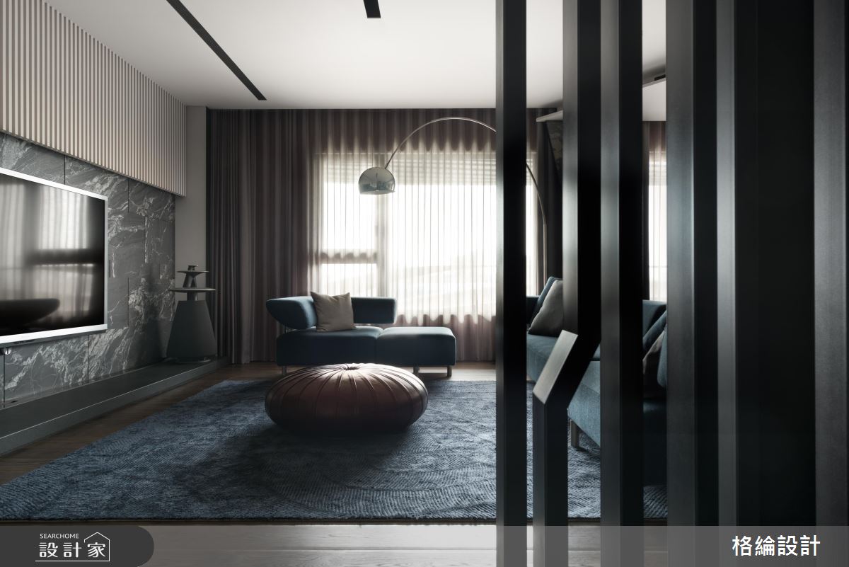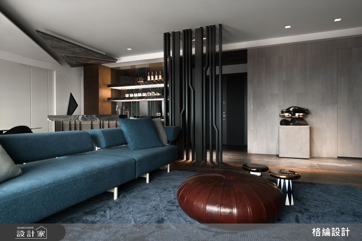 毛胚階段便開始籌劃,全面性的討論與溝通整體細節,重整原有動線不流暢的問題。屏風以鏤空視覺的金屬質感打造,巧妙界定內外領域,中間部分以曲線向上延伸,展現流動美感;玄關向廊道方向的壁面以水泥板施作,自然灰階色彩的舖陳,挹注樸實的手作溫度。客廳電視牆以天然石材拼接成形,潑墨山水般的藝術風采流淌其中,植入東方美學色彩之想像,牆面上方搭佐白色格柵層,隨著洗牆燈光的映照,流露動人的鮮明層次;客廳裡擺設藍色絨布沙發以及灰、藍色調的抱枕,安排一盞銀色流線型的吊燈,共同描繪出質感非凡家屋品味。開放的公領域裡,客廳、餐廳、輕食吧檯區為機能共享的生活區,吧檯上方以大小不一的三角板塊為設計巧思,從天花板到牆面皆施以木作、薄石板、鐵件等材質的幾合線條,隨著吧檯區背景間接光的映照下,形塑一種振翅高飛的動人意涵。