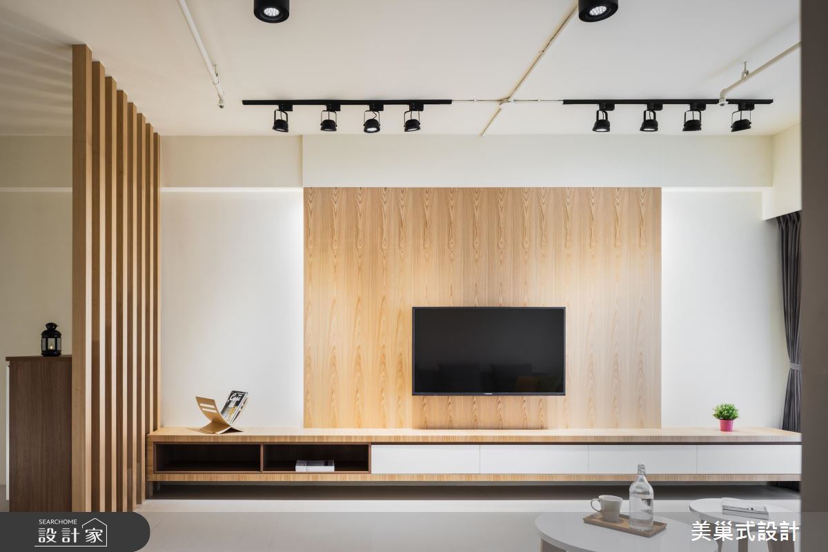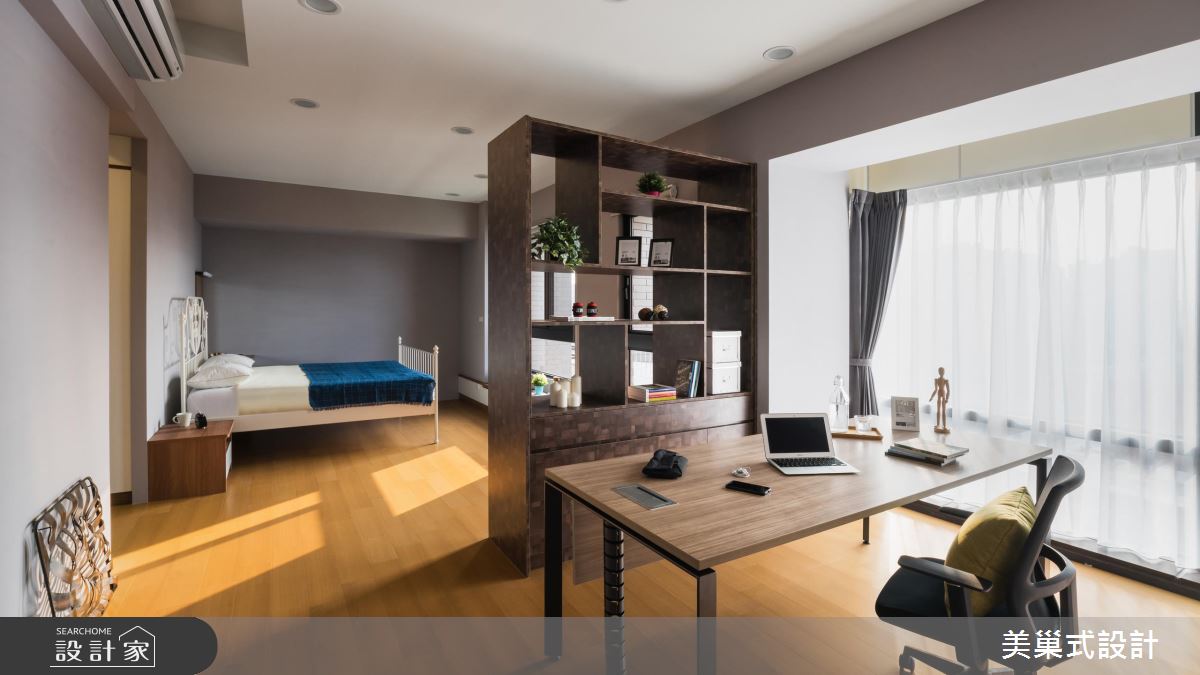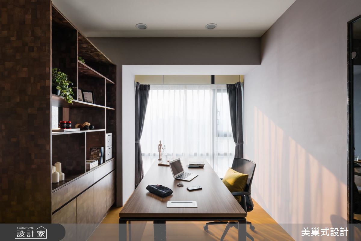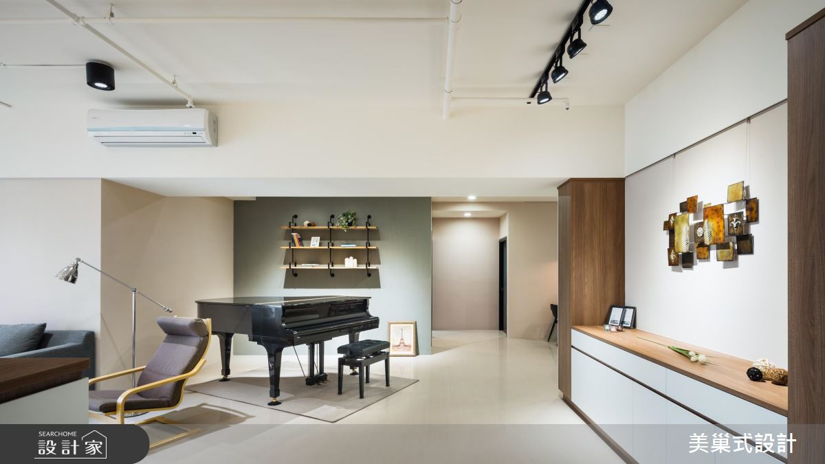 公領域選用白色與灰色打底,適度給予純淨木色鋪陳,勾勒素雅的生活情境,天花則加入裸露管線配合軌道燈,創造不加修飾的 Loft 風格,同時讓客廳減少繁瑣的家具配置,型塑流動、開放的留白視野,搭配採光灑落入室,讓空間隨時可承接光影的時序變換;客廳、餐廚區的過渡地帶,安置了一架鋼琴,讓琴音可環繞整個居室,串起兩個場域,並搭配灰綠色的展示牆面,形成賞心悅目的風景;主臥內,則考量生活習慣,將閱讀書房納入室內,與睡眠區開放連貫,加以一道透空書櫃形成界定,型構出流暢而不擁擠的使用動線!