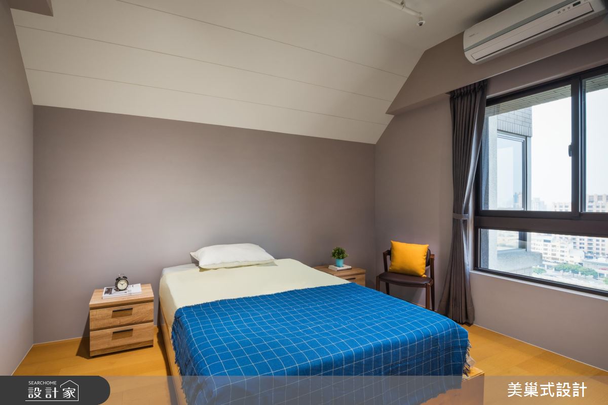 次臥房,刻意將天花板做成打斜造型,不僅提升冷房效果,也搭配跳色的家具軟件,順勢帶出童話小木屋般的趣味視感!