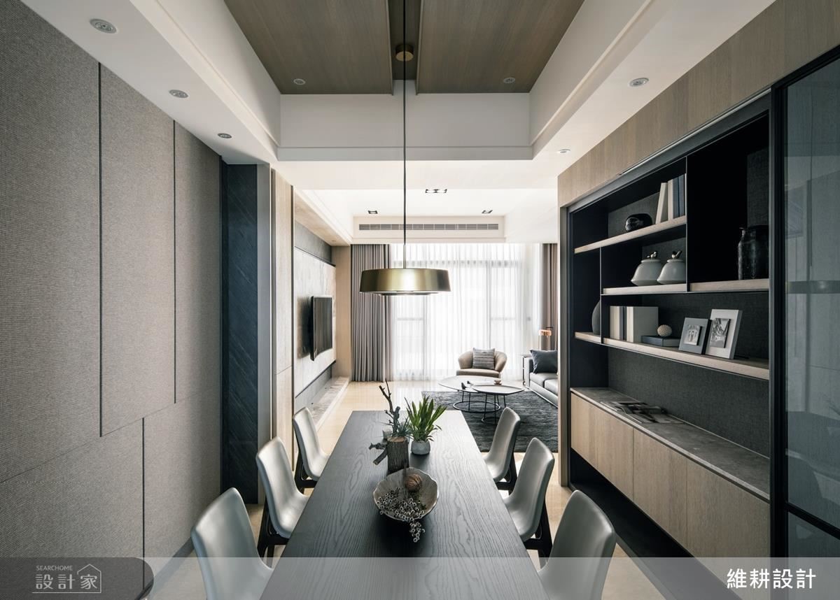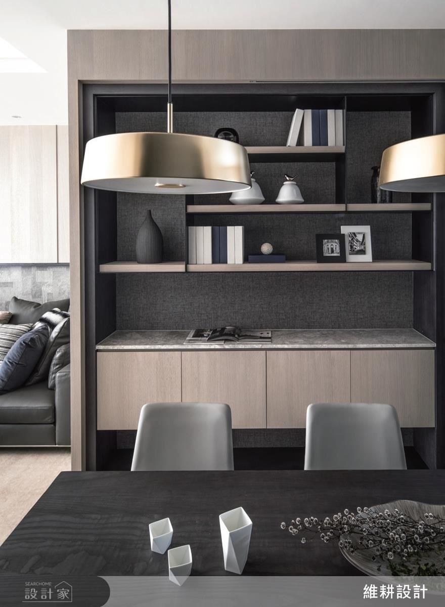 開放的格局設計,自客廳一路伸至餐廳區,為了不使狹長型的餐廳區視覺顯得窘迫,設計師規劃了展示與收納功能並存的層架,讓屋主能隨興陳列收藏與書籍,又延展場域景深,放大空間感。
