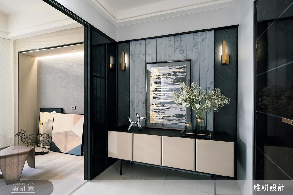 進入屋內玄關,一側是結合迎賓與休閒複合機能的多功能和室,捨棄實牆隔間,以黑玻拉門作區隔,既保有隱私又具通透感,放大 1 樓整體空間感,又能滿足屋主多樣化的生活需求。