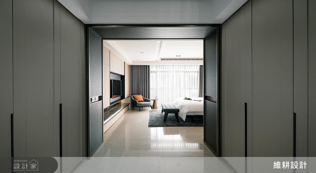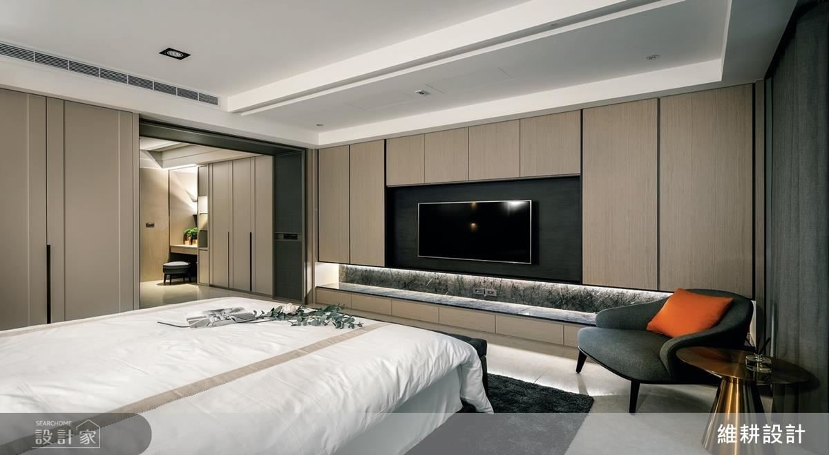 為滿足屋主夫妻大量衣物與物件收納需求,主臥房裡除了在更衣梳化空間兩側規劃整排衣櫃外,進入寢臥過道框板兩側也具有收納機能,並以木紋收納櫃框構出電視牆造型,既能滿足收納需求,也營造整體空間俐落的視覺感。