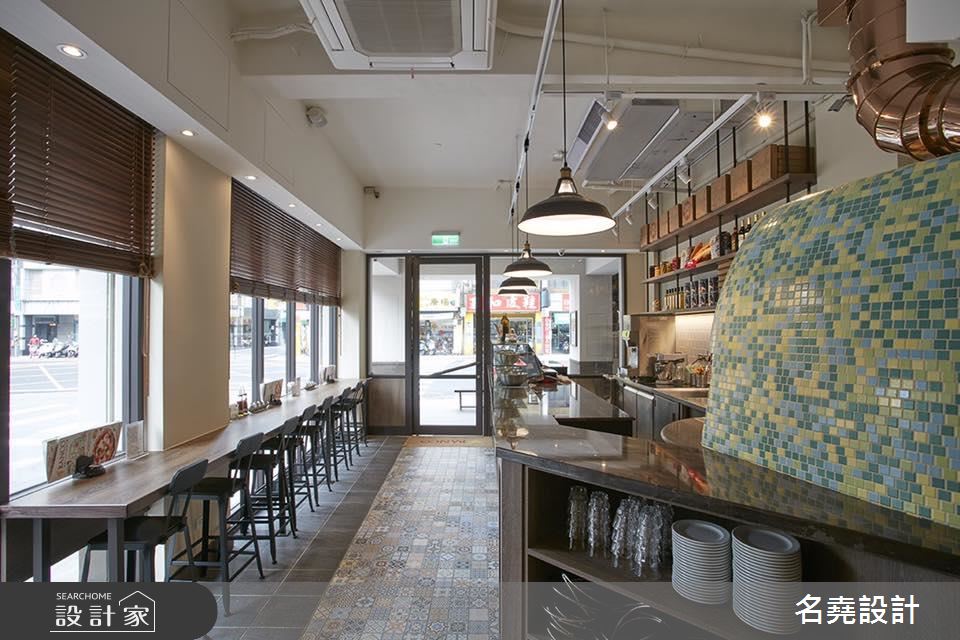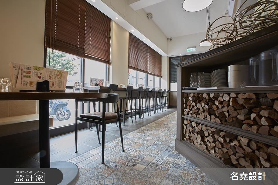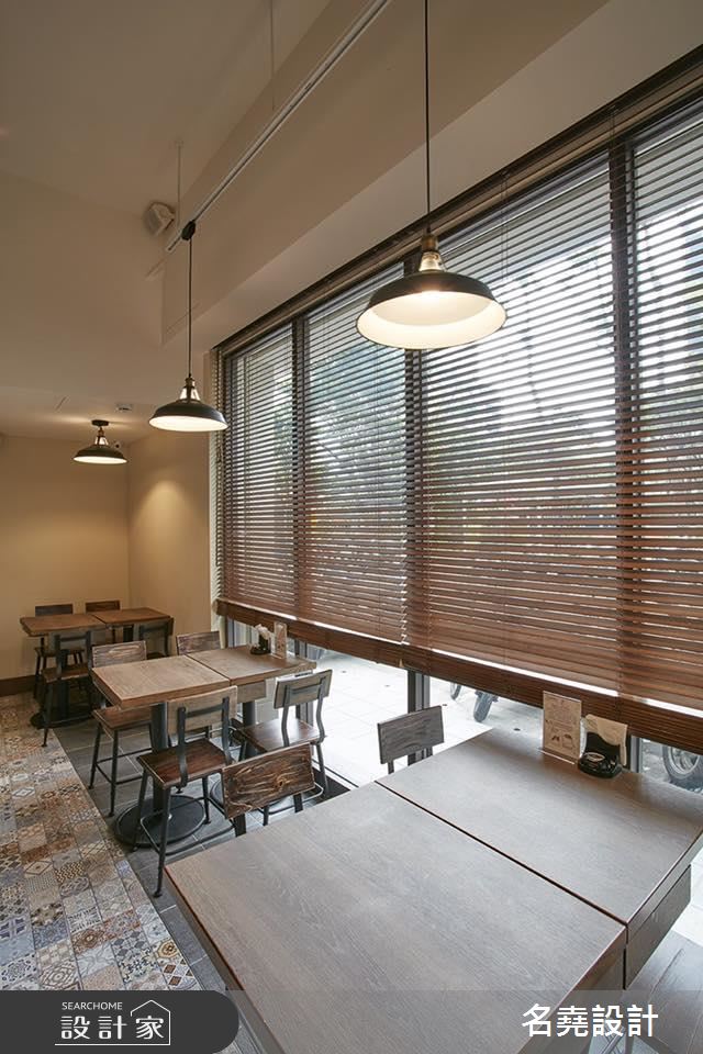 店內,沿著窗邊規畫整排座位,並配置木百葉窗簾做出採光量調整,藉由清玻璃達到延伸視線、放大空間的效果,再導引光線入室,使空間感更為穿透明亮!