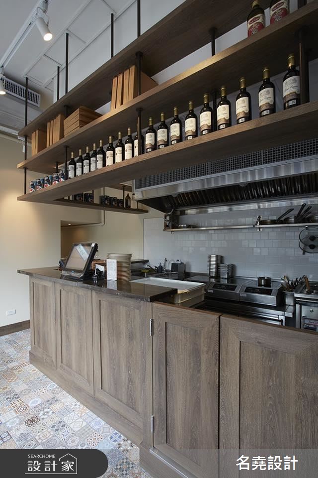 空間內,讓天花刻意裸露管線、樑柱,帶出不加修飾的味道,加上樓高優勢,使大型簡約燈具從上方垂墜而下,顯出視覺的矚目焦點;地坪則鋪述復古花磚,刻意形成走道動線,與靠窗座位區做出區塊界定,讓餐廳彷彿鋪上一層精緻地毯,帶來活潑生動的觀感;吧檯表面採用仿舊木質打造,展現充滿深淺層次的紋理,一旁的窯烤爐更鋪貼馬賽克磚,搭配古銅色澤排煙管,讓廚具也有如裝置藝術一般,成為令人眼睛一亮的亮點!