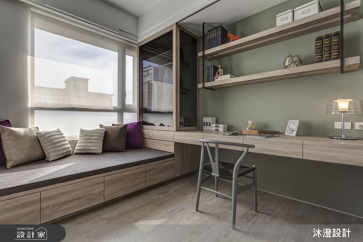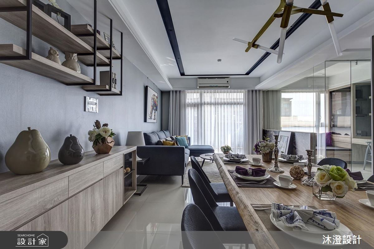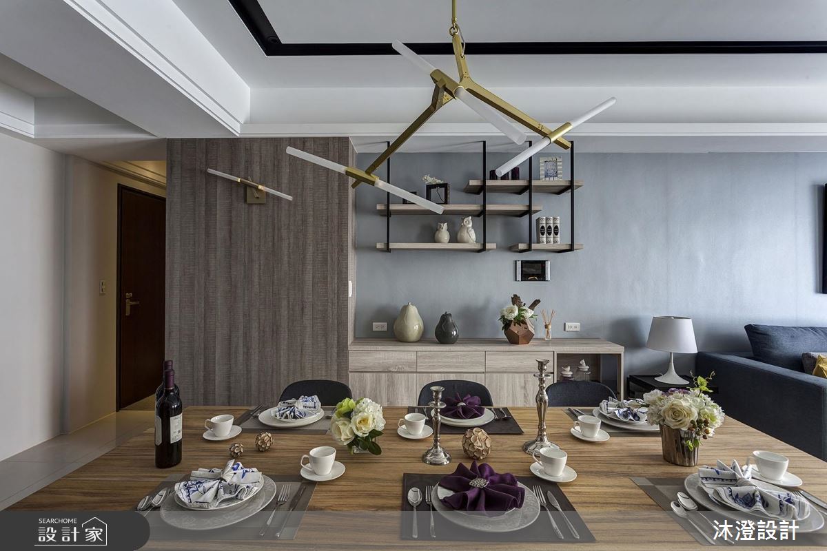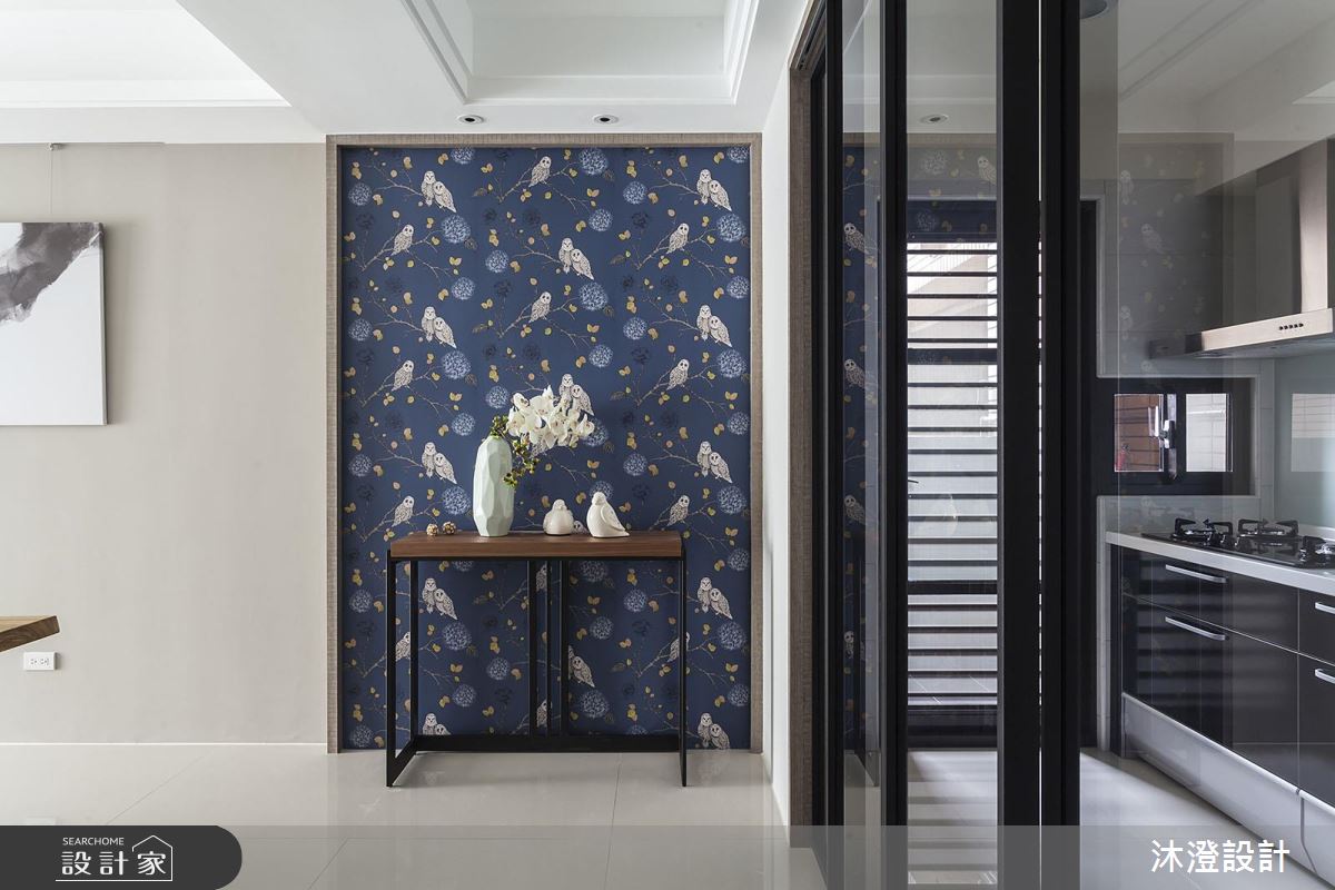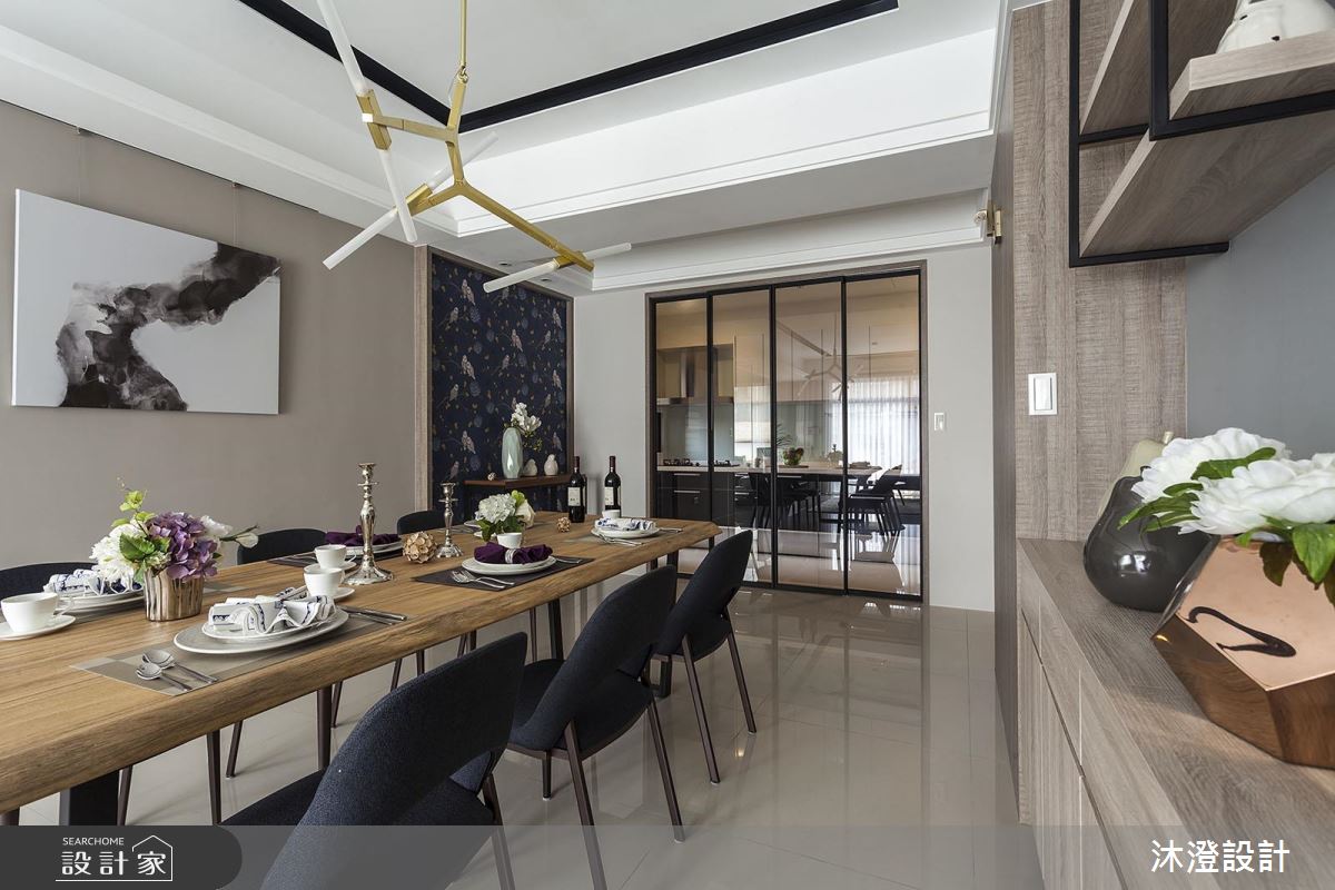 整體空間以現代風格做為基調,客廳的天花板利用黑色溝縫描繪出線條,營造出更高挑的屋高感受;後方以玻璃為質材,圍塑出書房區,宛如一個玻璃盒子,在空間裡閃閃發亮,穿透的質材界定,更讓展示櫃上的風格物件也化作公領域的一道風景。客廳的一旁為餐廚區,以玻璃拉門界定出烹調領域以及用餐空間,木作餐櫃加上原木質感餐桌的擺設,營造出寫意自然的生活氛圍,大地色系的配色安排,更注入一抹暖調氣息,增添宜人的溫度;餐桌上方垂掛骨架結構的燈飾,加上牆壁上掛著一幅黑白畫作,皆替領域增添創新美感;靠近廚房區域的角落處特別框出一道藝術端景,壁面以深色、鳥語花香的圖騰意象壁紙襯底,擺設一張結合鐵件、木作層板的矮櫃,平台結合花藝與瓷器的擺放,形塑動人的美學視野,讓人都倍感優雅起來。