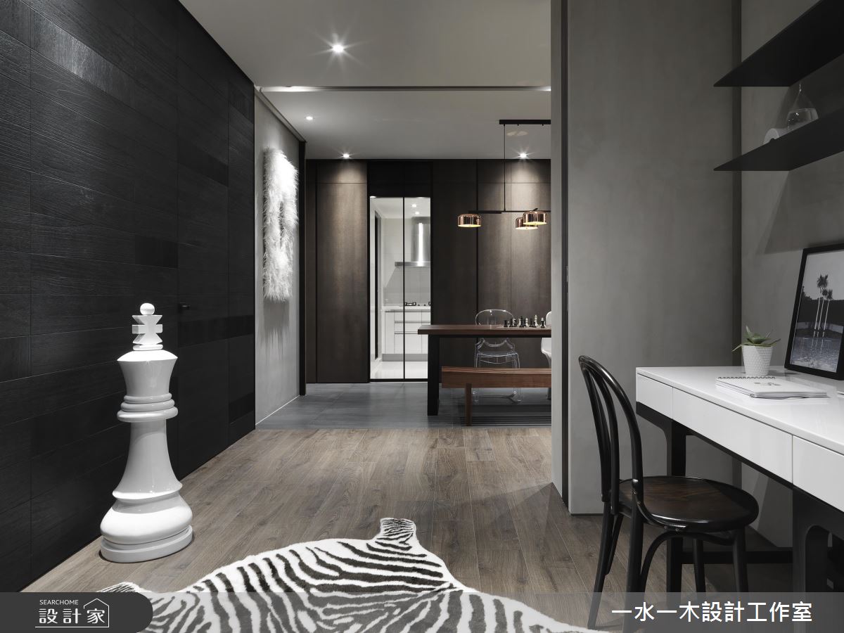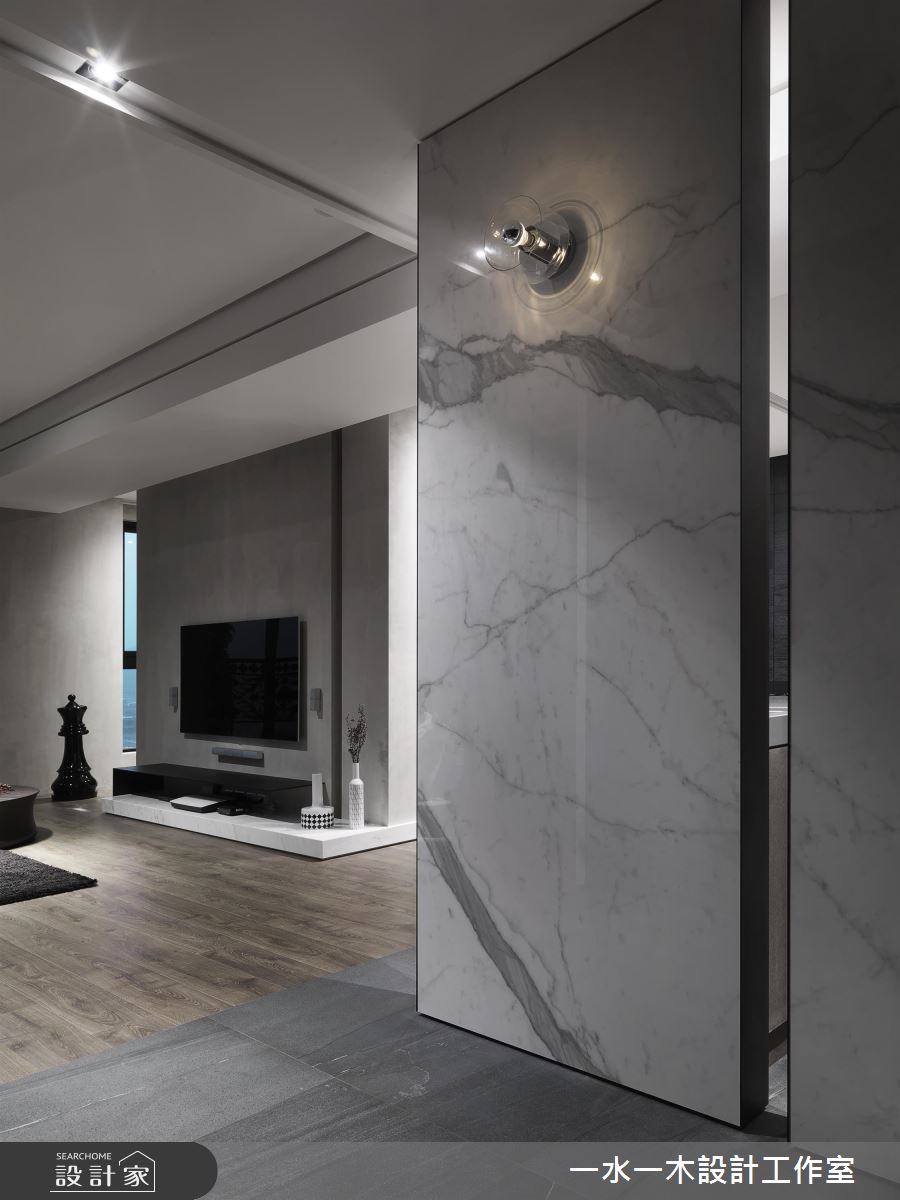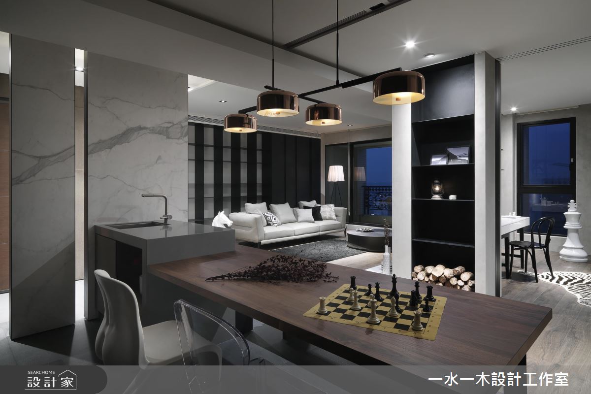 玄關,以大面大理石作為屏風,透過局部簍空讓光線自由穿梭,藉著石材紋理象徵孤島溪流;室內場域,則順應採光不佳的特點,抓緊黑灰白設計主軸、結合現代質感材質,電視牆面則採以細膩水泥混凝土構築而成,帶來孤島的涼意氛圍,一旁窗台更加入植栽牆,帶出些許綠意妝點,有如島嶼上的自然景觀,電視牆後方則規劃為書房區域,在牆面別出心裁地留了一道斜切的縫隙,讓光線可以穿透自如,打造空間之間的連結性,且選用不鏽鋼做為書房門板材質,象徵艾拉島的冷冽;餐廳賦予唯美的燈光、醉人的窗景,讓人可在此用餐或品酒一整天,享受親臨島上的微醺時光;私領域內,延續黑灰白與木質感,並延伸更衣機能,呈現舒適簡約的使用情境!