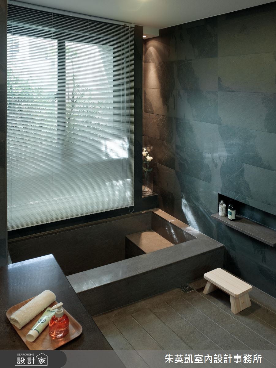 衛浴內,透過降板式浴缸規劃,並善用美好的窗光條件,建構出帶有日式禪運的湯屋澡堂,成為全家人最喜愛的紓壓之地!