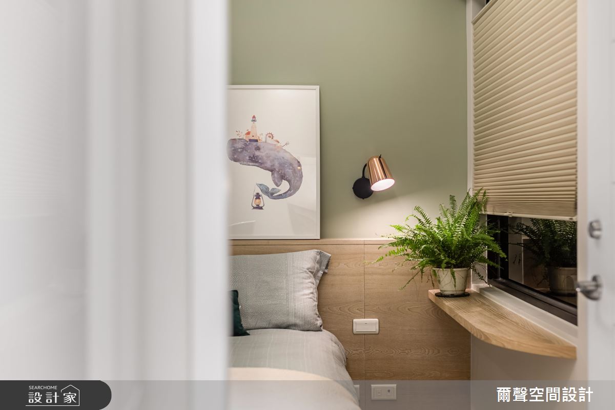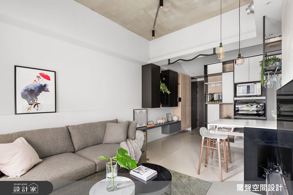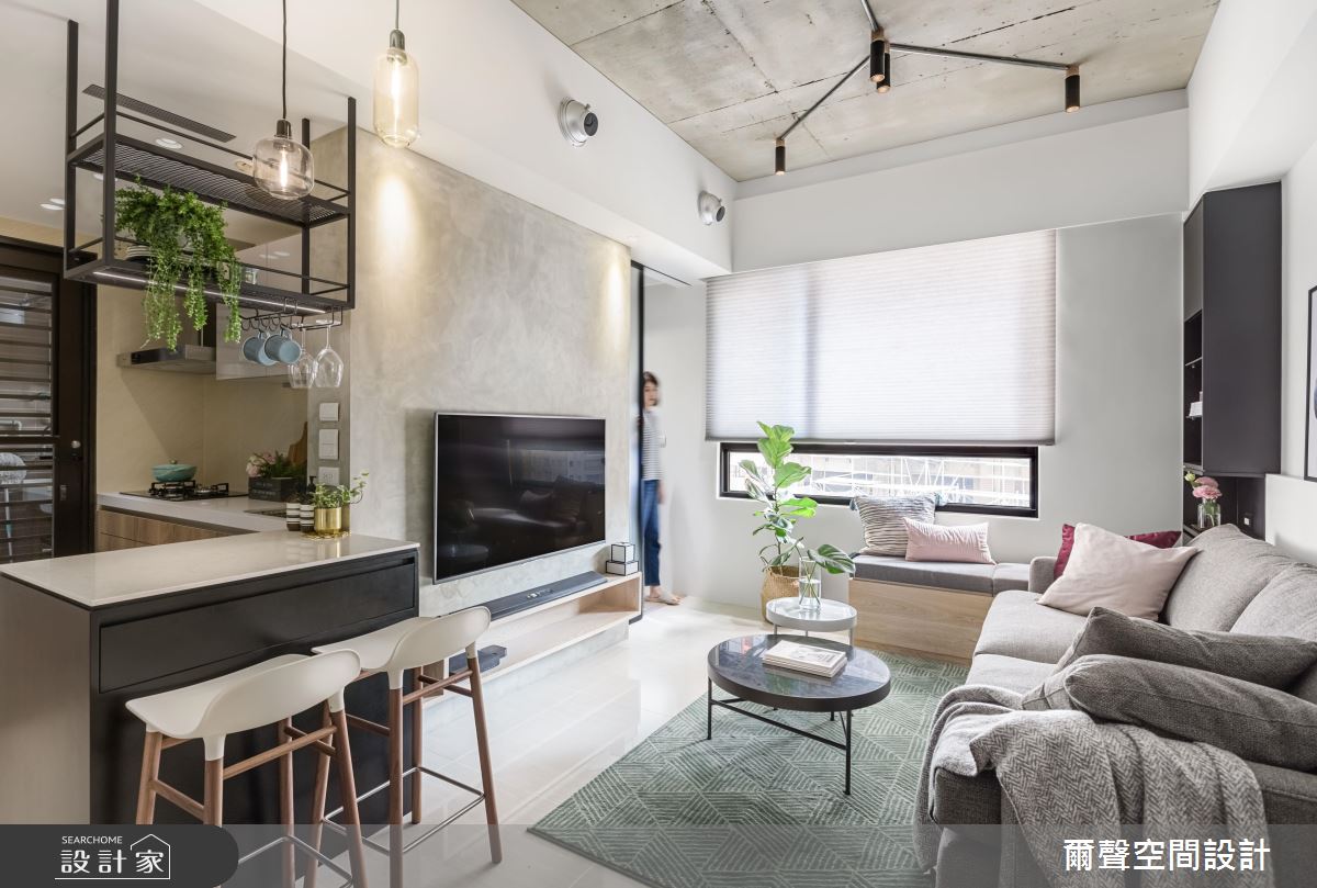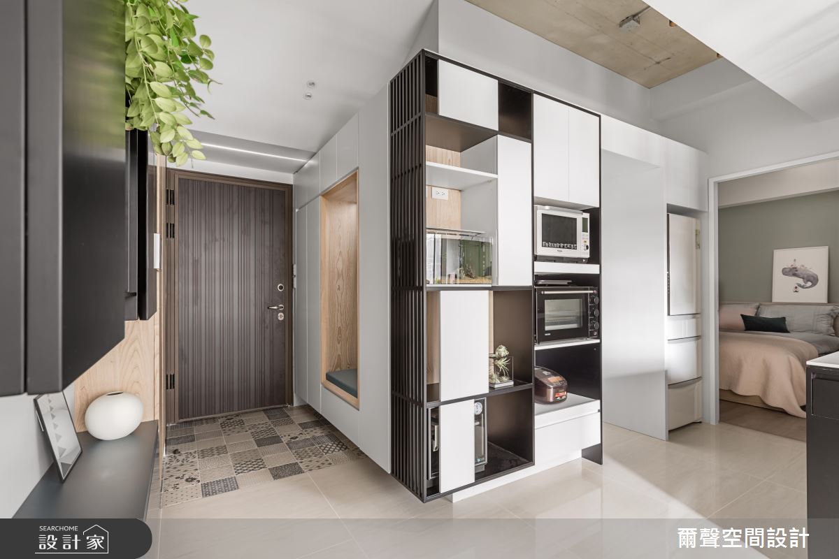 玄關處,將部份原有的石英磚拆除,改為女主人喜愛的灰藍花磚圖騰,形成明確的落塵範圍,且安排鞋櫃與穿鞋椅,機能性十足;並考量到女主人本身喜愛做糕點,於是將廚房工作檯面延伸成中島,用餐時間可作餐桌使用,其餘時段則可將桌板完全收整納入中島,讓住宅保持寬敞明亮的視野;空間內採用造型收納櫃,呈現俐落的簡約黑白風,天花則因水泥天花結構良好,特意裸露原始表情,電視牆面塗料也仿造天花板,彰顯樸質原始的紋理;兩間臥室內,地坪皆以木地板鋪陳,並將木質延伸至床頭立面,搭配女主人喜愛的灰綠跳色,營造溫暖舒適的休憩氛圍!