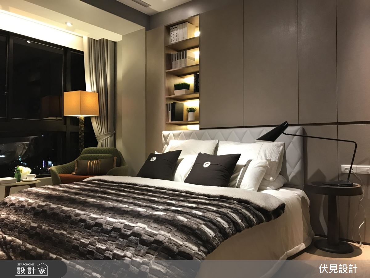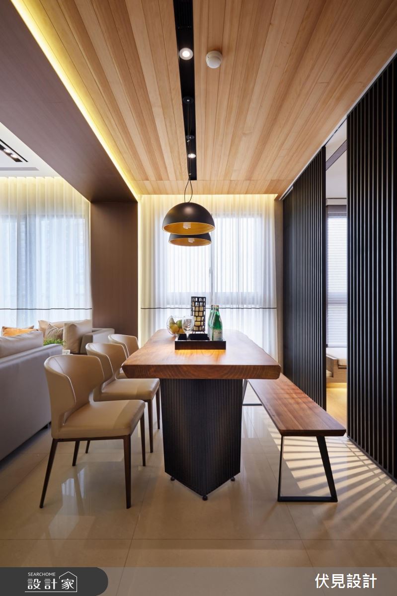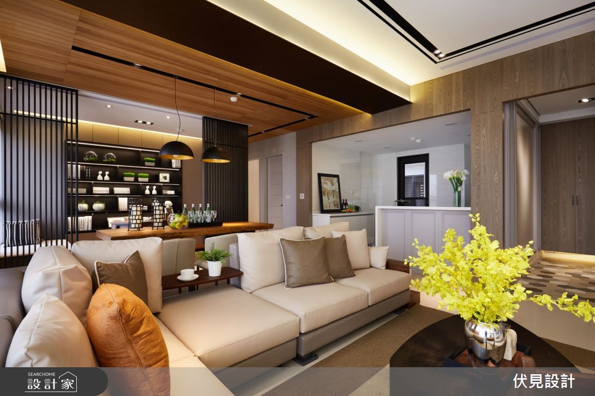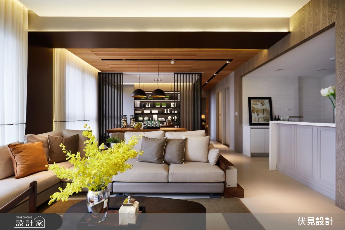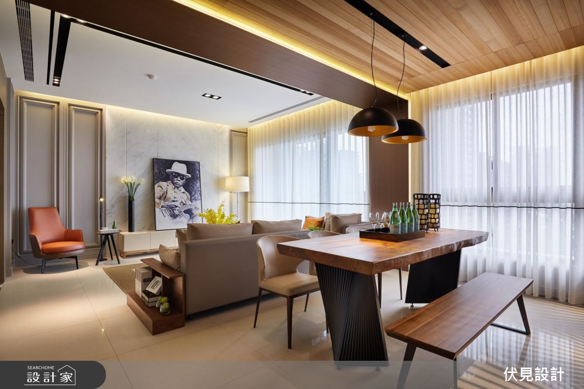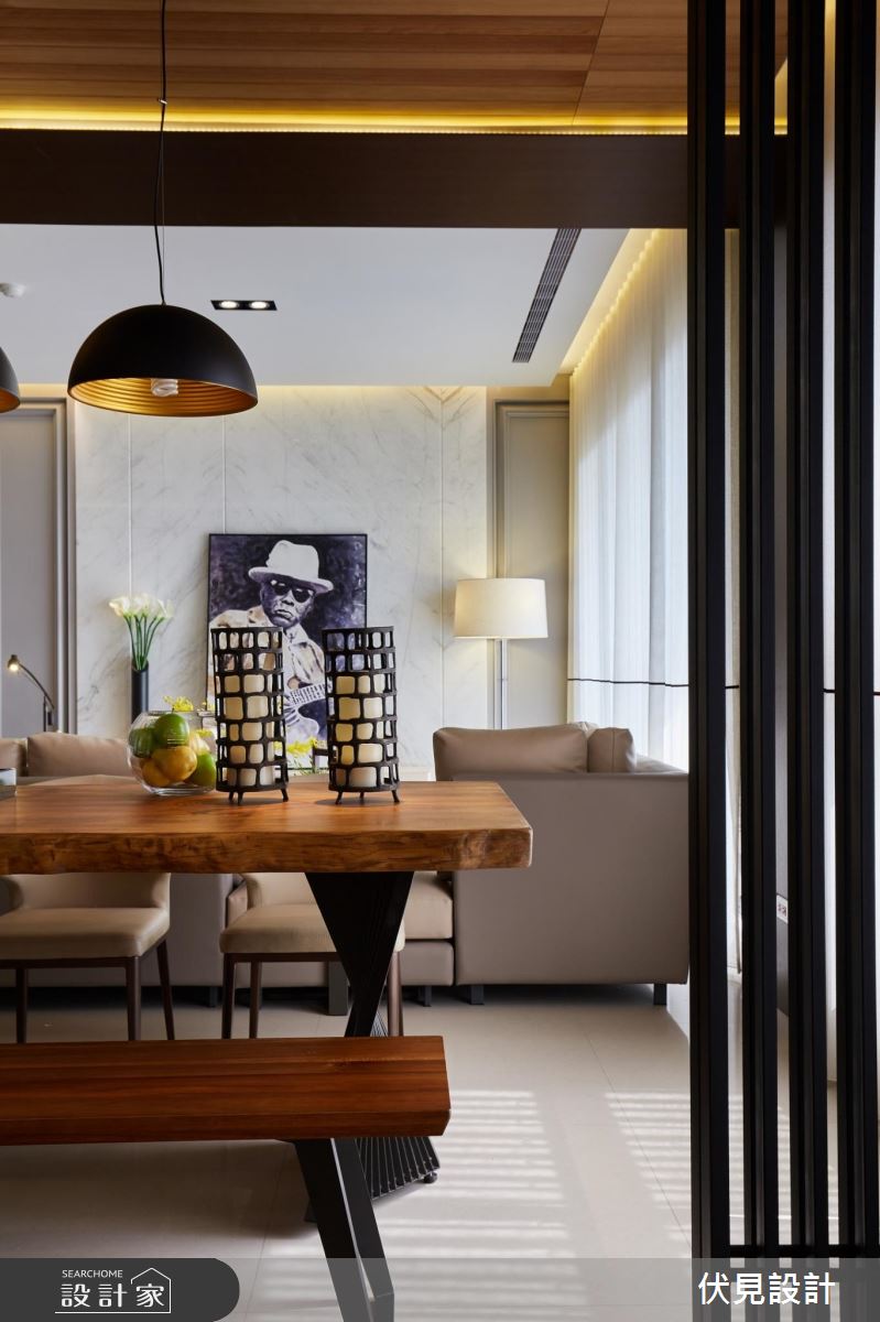 公領域部分,透過格局整頓,調整客廳重心偏向的問題,並調整玄關比例,利用美式壁板延伸成一個L型,做出轉折動線,再藉由對稱線板框出客廳主牆,導正客廳重心及穩定性;並在美式風格之中,混入了些許自然現代元素,採以灰色調打底、搭配溫潤的木皮穿插,形成恰到好處的溫煦視野,客廳主牆則選用純淨的大理石建構而成,搭配 3 米高的空間優勢,締造立面大器質感;同時運用開放格局,讓客廳後方連結餐廳、書房,開啟空間居住者的互動性,沙發上方則做出 L 型的造型框架、弱化天花的壓迫感,餐廳銜接書房處,也配置黑鐵隔柵做出分水嶺,衍生通透的視覺體驗;主臥內,呈現優雅的飯店風格,彰顯簡約的中性質韻,且讓衣櫃結合電視牆機能,不浪費一絲坪效,創造實用、美型的舒適睡眠場域!