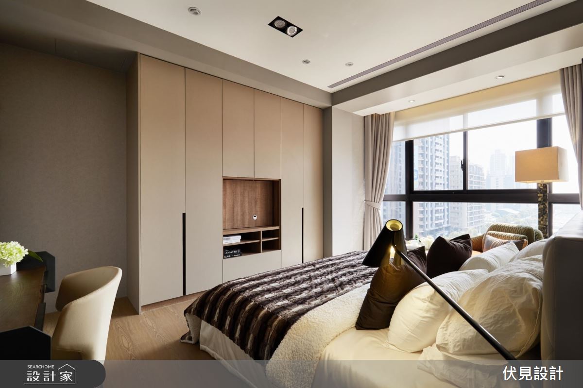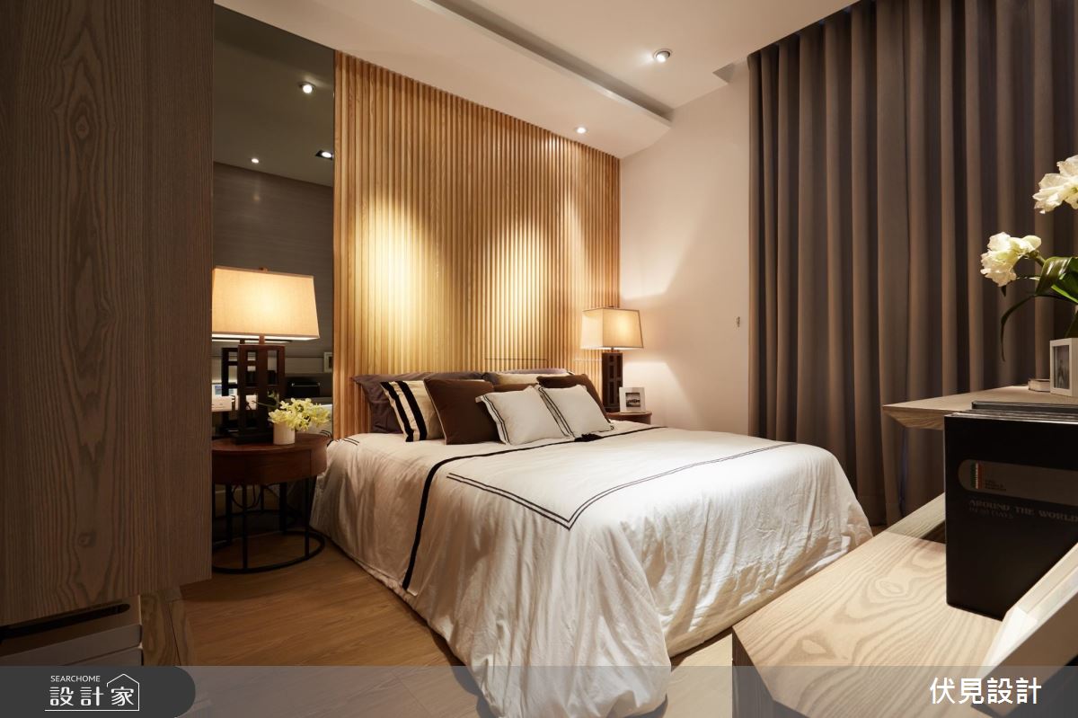 孝親房,因床頭具有雙向開窗問題,於是藉由木柵修飾立面,達到拉伸壁面尺度的效果,並在線條序列之中,帶出恬靜的和風韻味!
