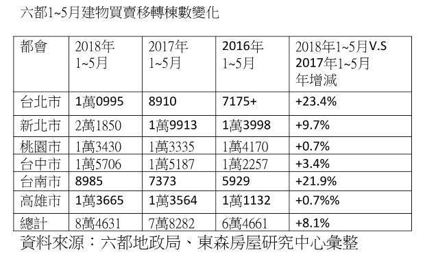 而六都今年1~5月總計8.46萬棟,相比去年同期共交易7.82棟,年增8%,各都皆呈現正成長,尤以台北市今年1~5月突破1萬棟,相較去年同期8910棟,大增23%,為六都年增最明顯,新北市累計2.18萬棟,也年成長1成,台南今年累計共8985棟,相較去年同期7373棟,也年成長將近22%。