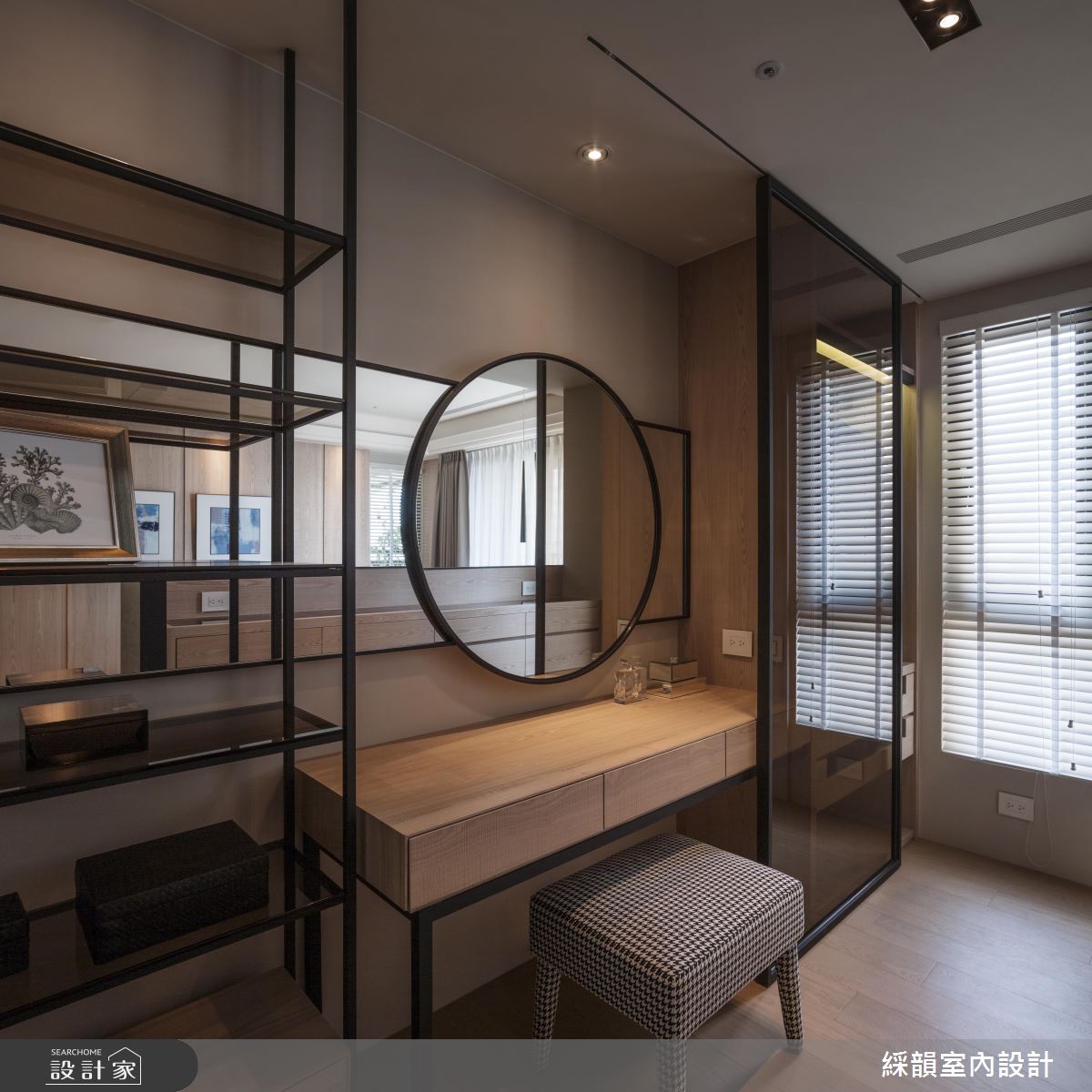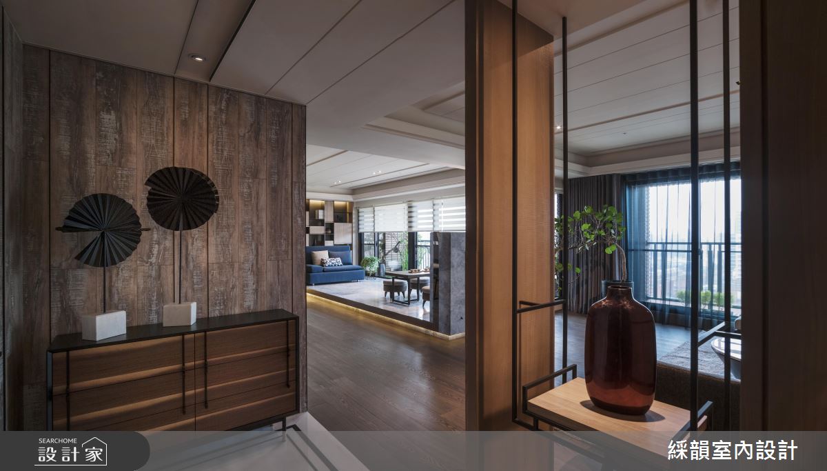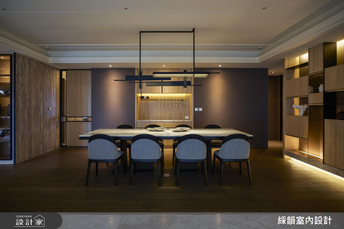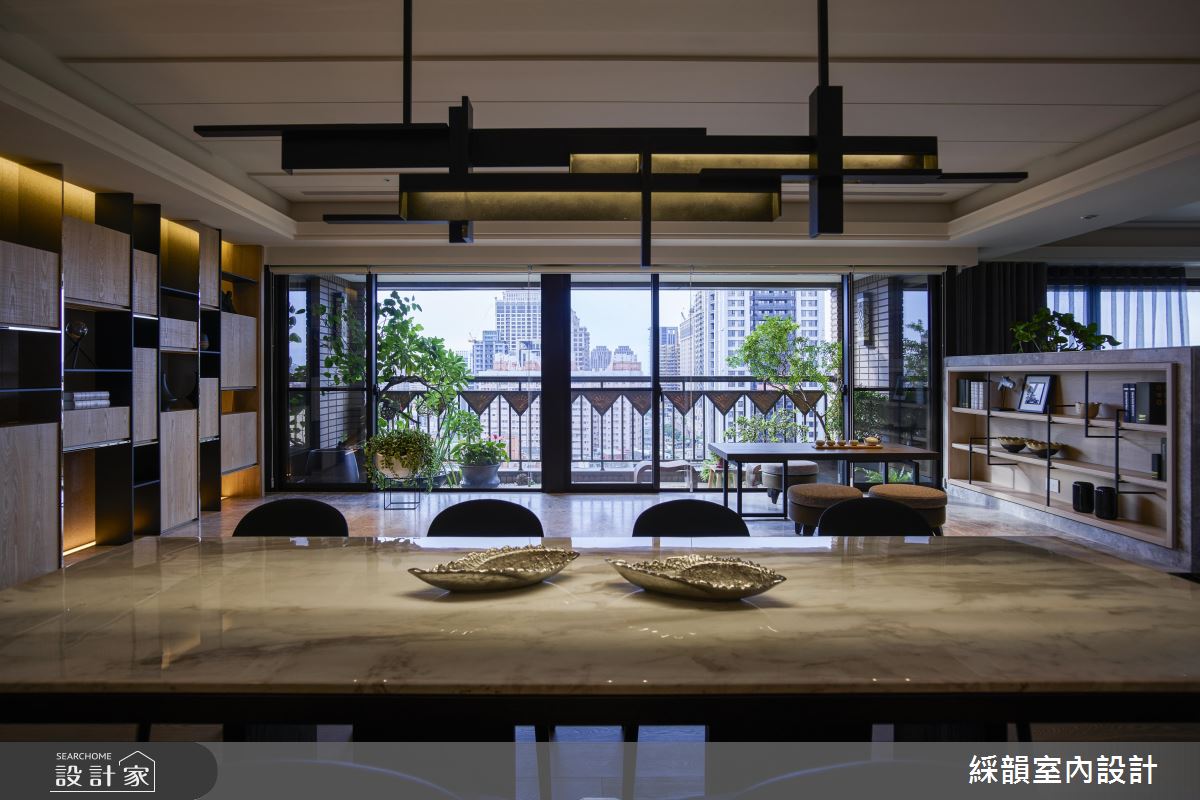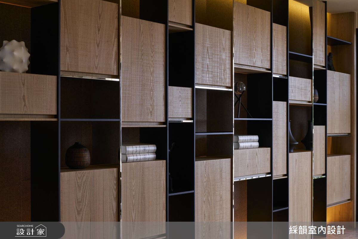 玄關區以舊質感的木紋鋪陳牆面,前方以簡約線條的矮櫃陳列藝術作品,右側則以騰空展示層架詮釋屏風機能,通透器皿裡插上幾根枝葉花卉,流露自然的人文氣息。深色調的木紋鋪敘公領域地坪,沙發背牆以不同厚度的薄石片拼接,嵌入不鏽鋼飾條,懸掛幾幅藝術畫作,隨著天花板嵌燈的映照下,傳遞靜謐優雅氣息;半高的石材電視牆成為領域界定,區隔出客廳與泡茶區、餐廳區,泡茶區裡以架高地坪,泡茶、喝茶之際還能欣賞陽台的綠意美景,好不愜意!電視牆背面利用鐵件與木作層架轉化為書架,其俐落的分割線條,巧妙與木皮、鐵件與金屬創造的書櫃牆相互呼應,錯落有致的視覺造型,替幽靜的空間氛圍注入趣味活潑性;餐廳領域透過大量的大地色系襯底,在間接光源的映照下,調和出溫馨自然的饗宴氛圍,餐桌上方是設計師獨家訂製的金屬造型燈飾,讓空間裡線條的延伸與切割技法的展現,更完美對稱。