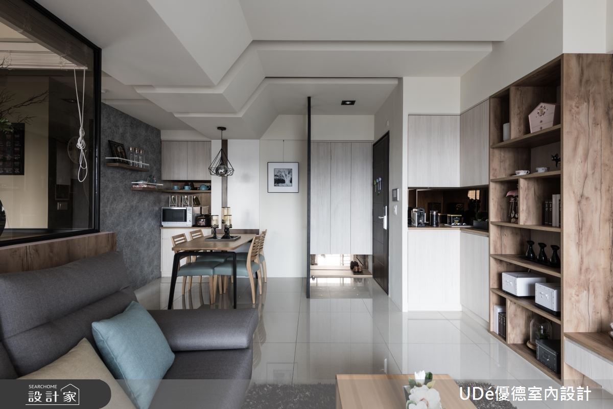 步入空間,可見到加入幾何線條的天花板造型,透過高低錯落的設計,緩解橫樑壓迫的問題,並同步妝點燈帶延伸,展現富有層次的空間視野,同時讓隔間以通透形式呈現,無論是玄關隔屏,或是書房與廳區的隔間,皆透過鐵件為框、清玻為面進行設計,展現好採光的自由流動,並延伸寬闊空間感,而居室內的美型收納也是一大重點,經由展示櫃或層架的配置,讓充滿記憶的生活物件作為設計一部分,達到美化作用;私領域內,則讓色彩妝點空間主題,並搭入實用的櫃體、書桌等機能,透過和煦木皮做修飾,調和出溫暖、愜意的使用情境!