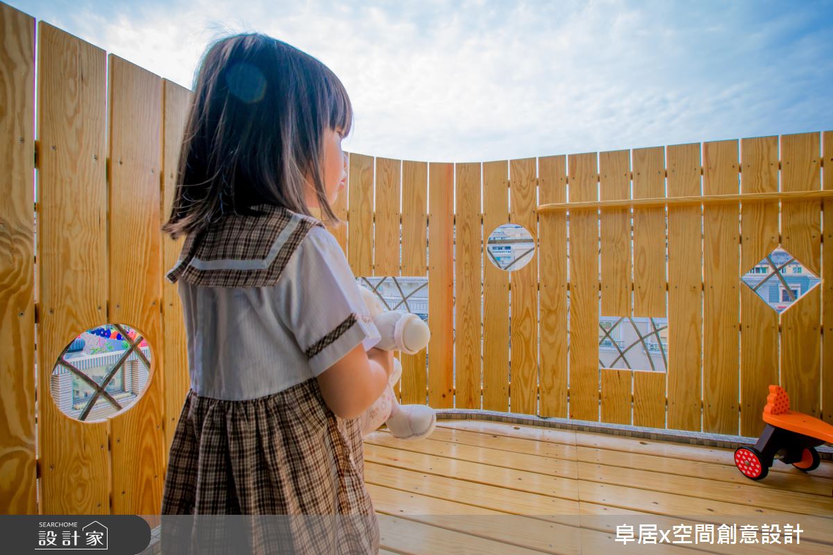 客廳外陽台,是孩子們的專屬遊戲區,於南方松挖出的幾何圖形孔洞,兼具安全考量與觀賞風景性質,並保有與公領域的視線聯繫,讓大人在客廳聚會時,也可隨時照看到小朋友的玩耍情景!