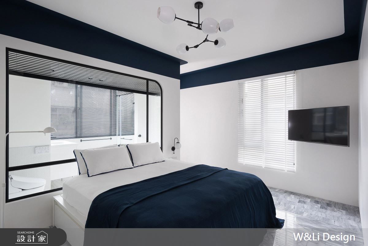 客廳,以純白為主體,刻意保留台灣早期使用的石材地磚,以特殊紋理創造視覺焦點,加上舒適皮沙發與玻璃桌几,讓廳區多了豐富層次,而原有的廚房因太過狹隘且動線不順,在重新調整比例後,拓大廚房使用機能,並於餐區加入藍、白、黑幾何造型地磚、與客廳形成區分,搭配著餐椅與同色桌檯,深具立體新潮的味道,而深藍色門框的斜面設定,更帶出了廚房入口的框景效果,充滿著視覺趣味;私領域,讓每間房保有各自的獨立性,並將台灣的復古白石材延伸入室,在藍與白之間穿插黑色線條,強調空間的層次感,且置入玻璃增加臥房採光,讓光線可相互連貫,達成空間尺度放大之效!