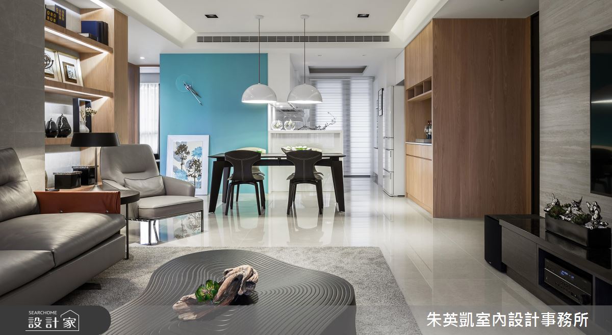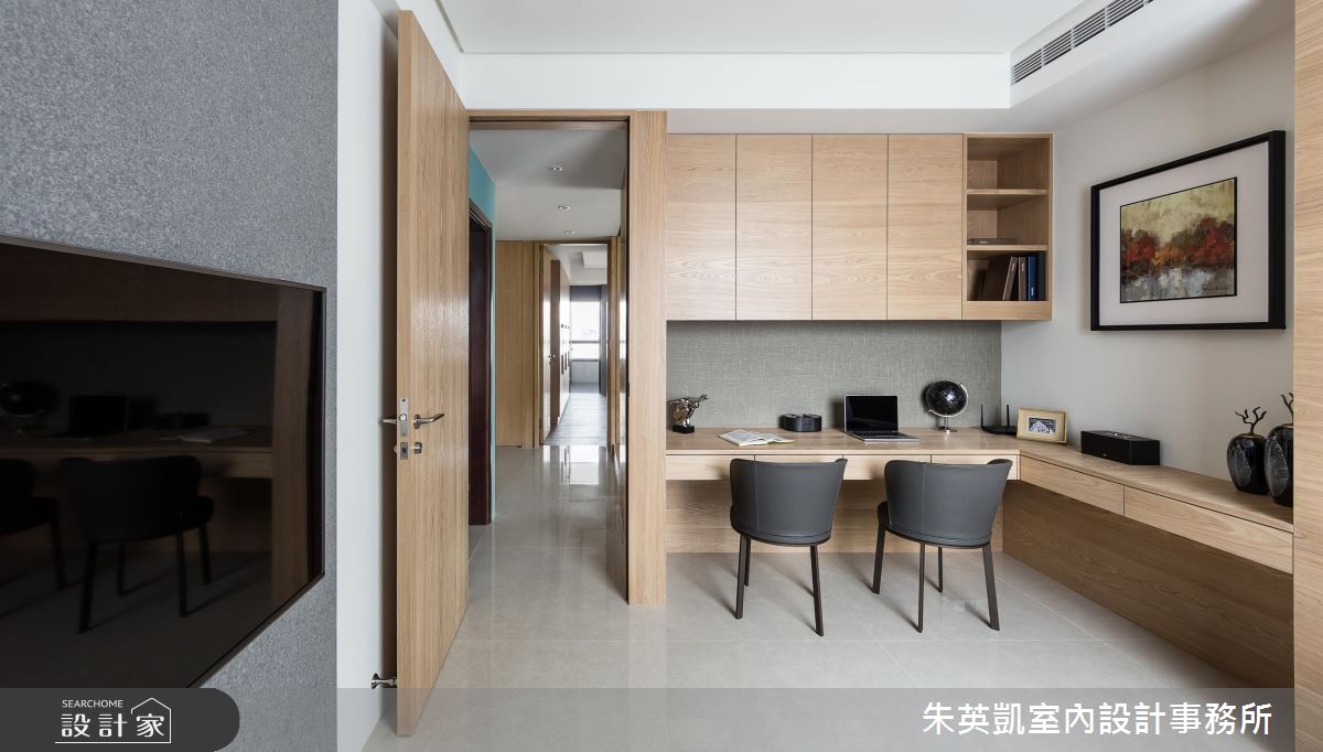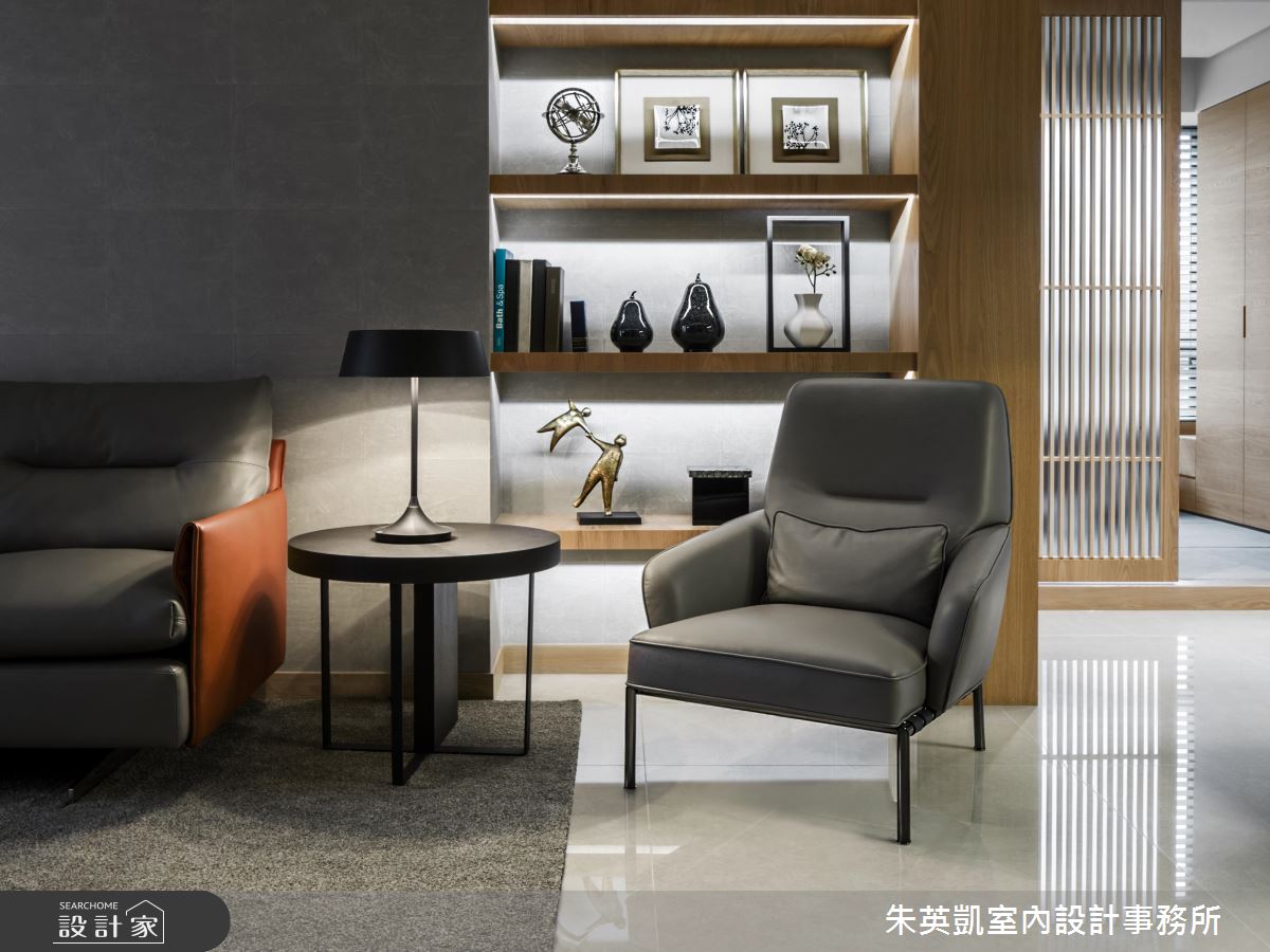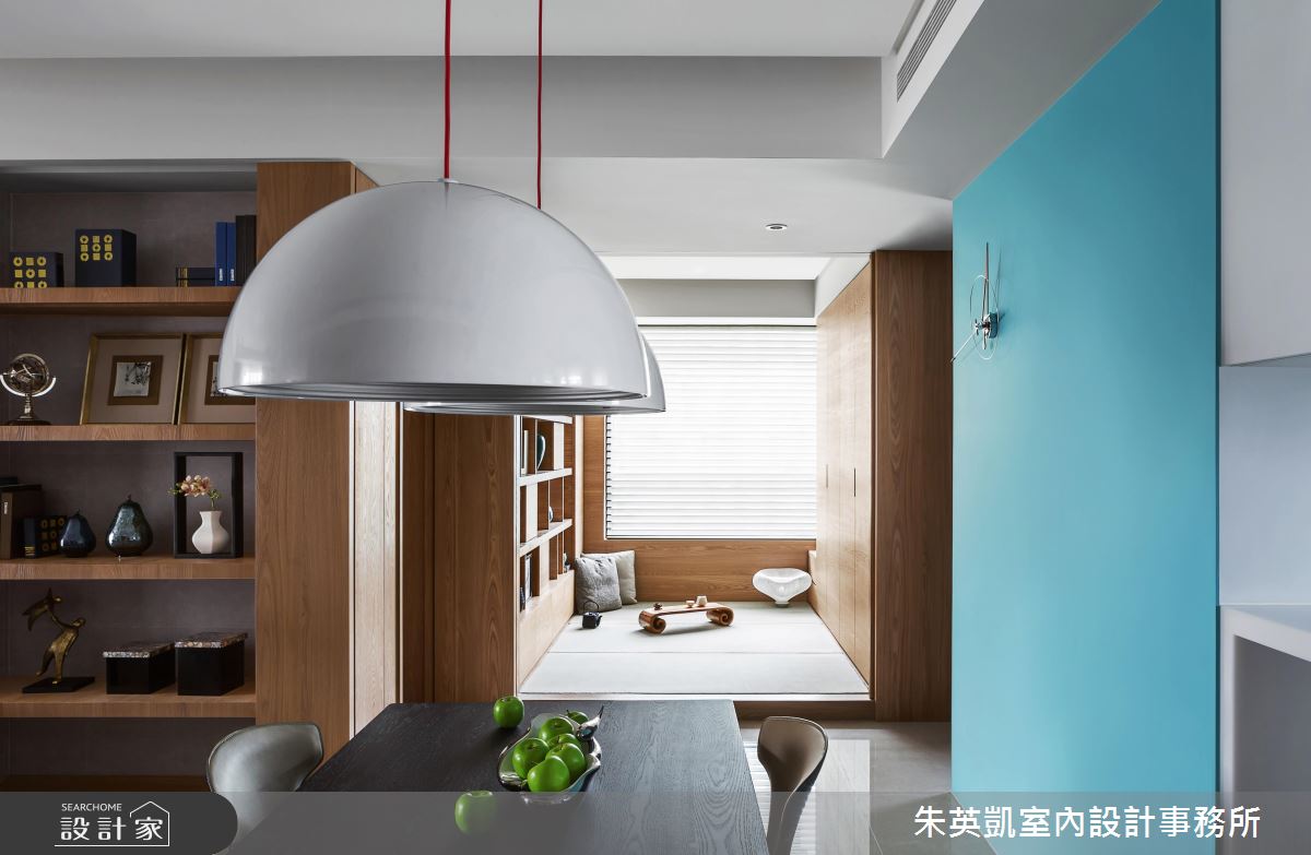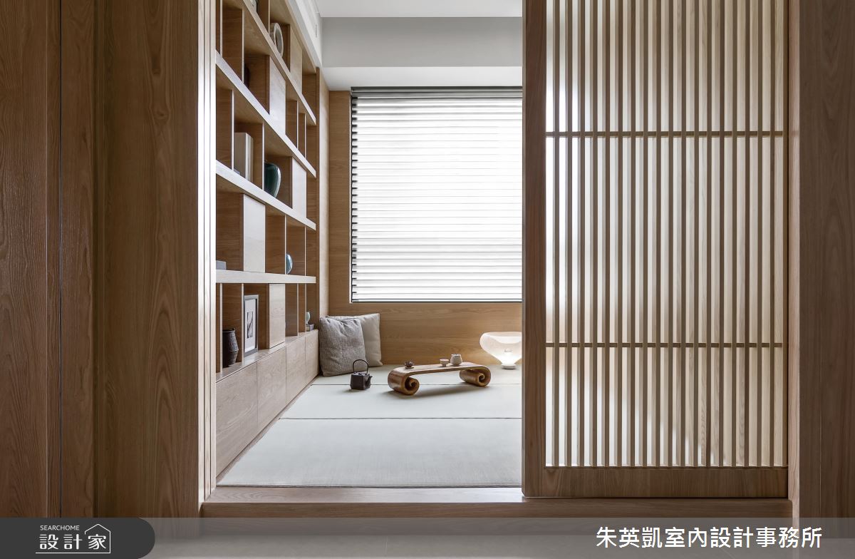 整體空間選用木質家件結合俐落線條,打造出具設計感的現代風貌,並藉由充足日光挹注,傳達出設計師想營造的沉靜感,同時利用光影恣意流轉,活絡開放的公共空間。走入室內,藉由客廳沙發背牆延伸出的展示層架,作為入門端景牆面,考量居者便利性及結合整體空間設計,客、餐、廚配置於同一水平線上,整齊俐落了視覺並方便使用動線。比鄰用餐空間的多功能和室日光充足佐以木質,營造了沉靜減壓氛圍,作為閱覽室能靜心享受閱讀,將一切阻隔於格柵拉門外;作為客房拉上拉門即將場域獨立,讓使用者享有隱私。