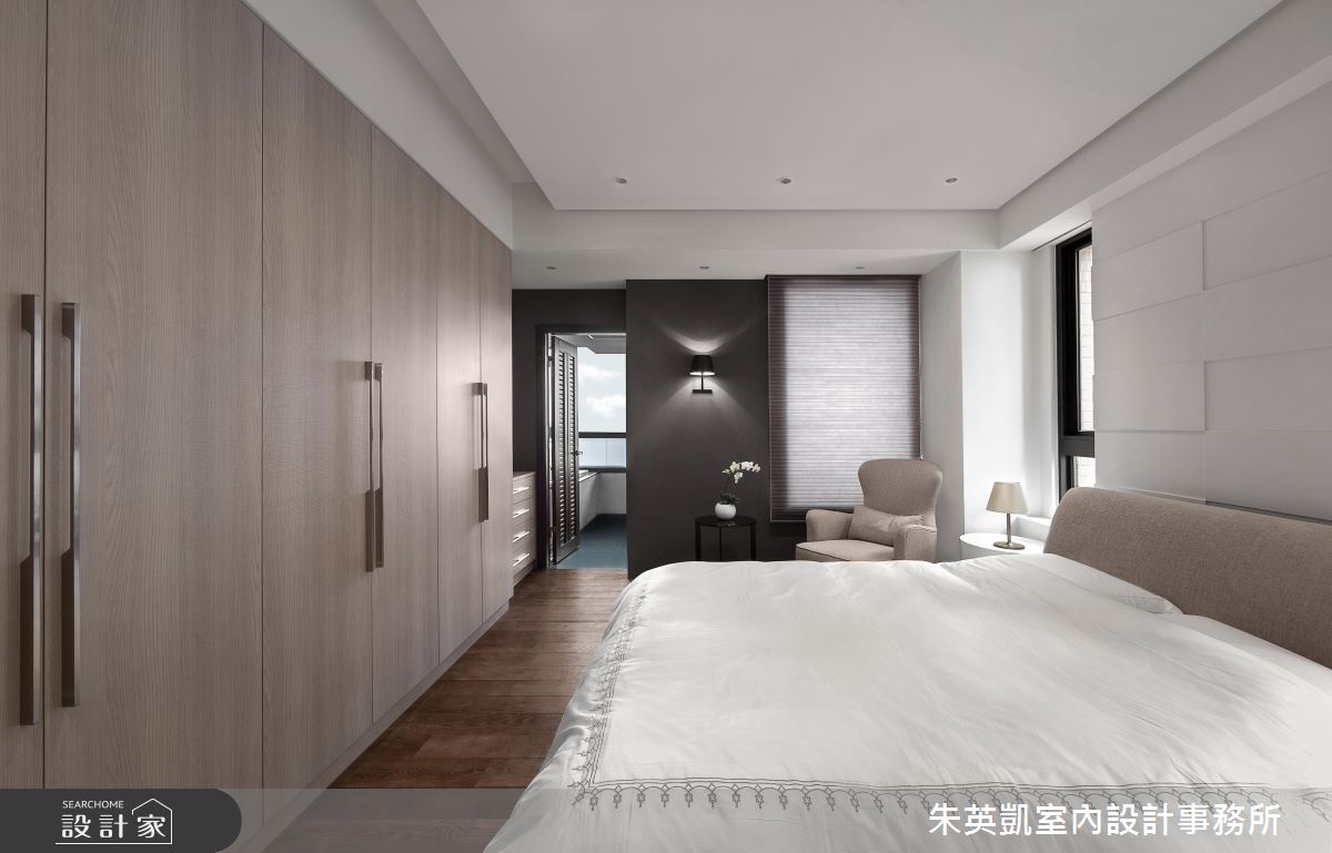 走入臥房,延續了公共空間的木質設計,並運用系統櫃體將收納隱形,整齊分割視覺空間,型塑更開闊的臥房線條,呼應了公領域的簡約紓壓。