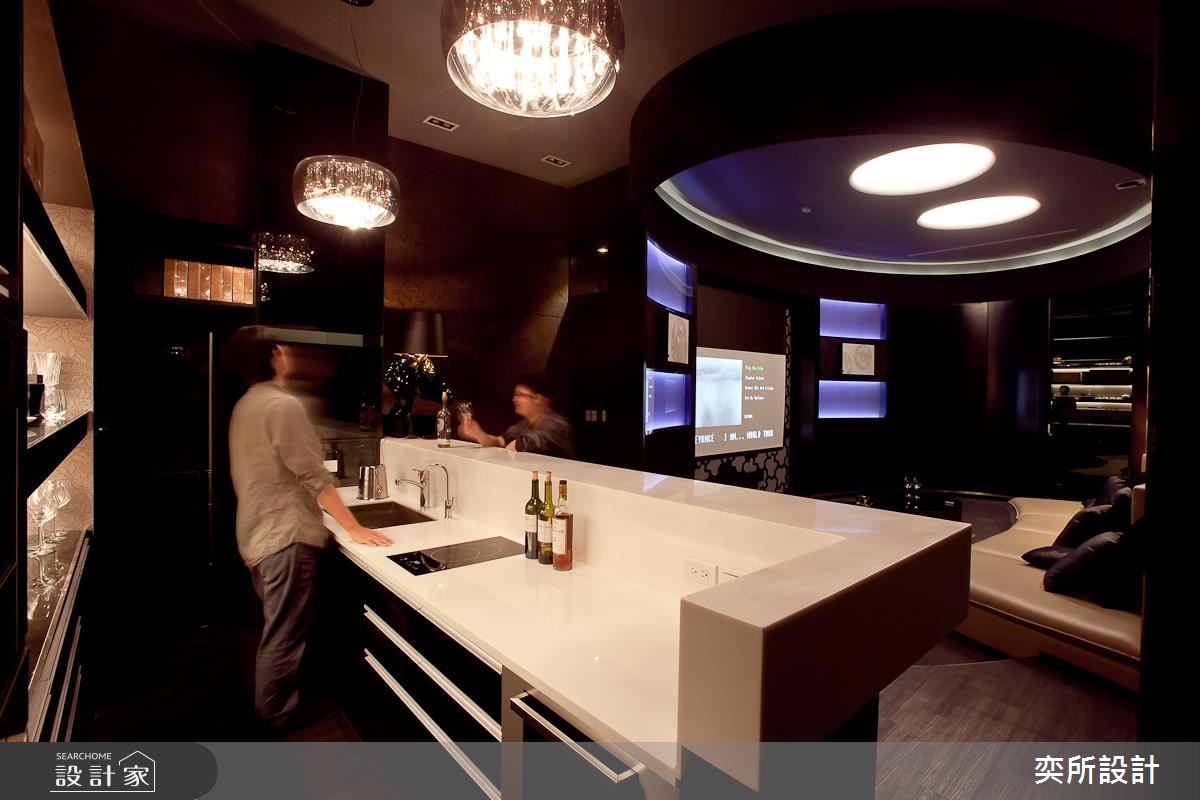 橢圓形的交誼廳是百坪大宅的亮點,不同於樓下的木紋風格,設計師藉著黑鏡與燈光的經營,讓空間呈現沉雅的丰韻。