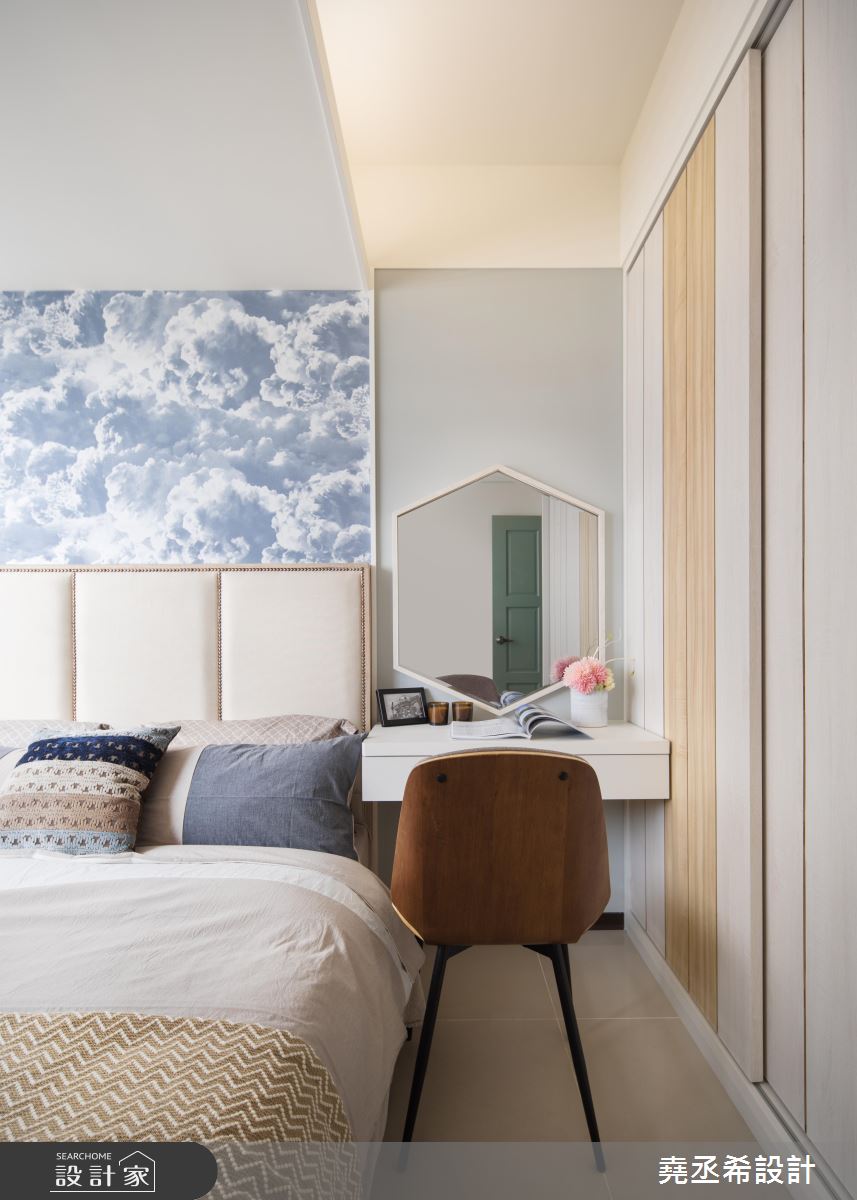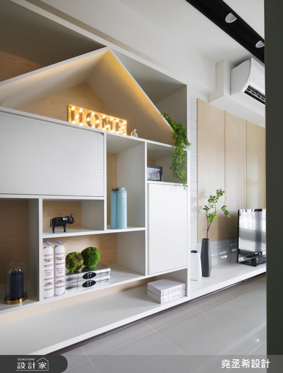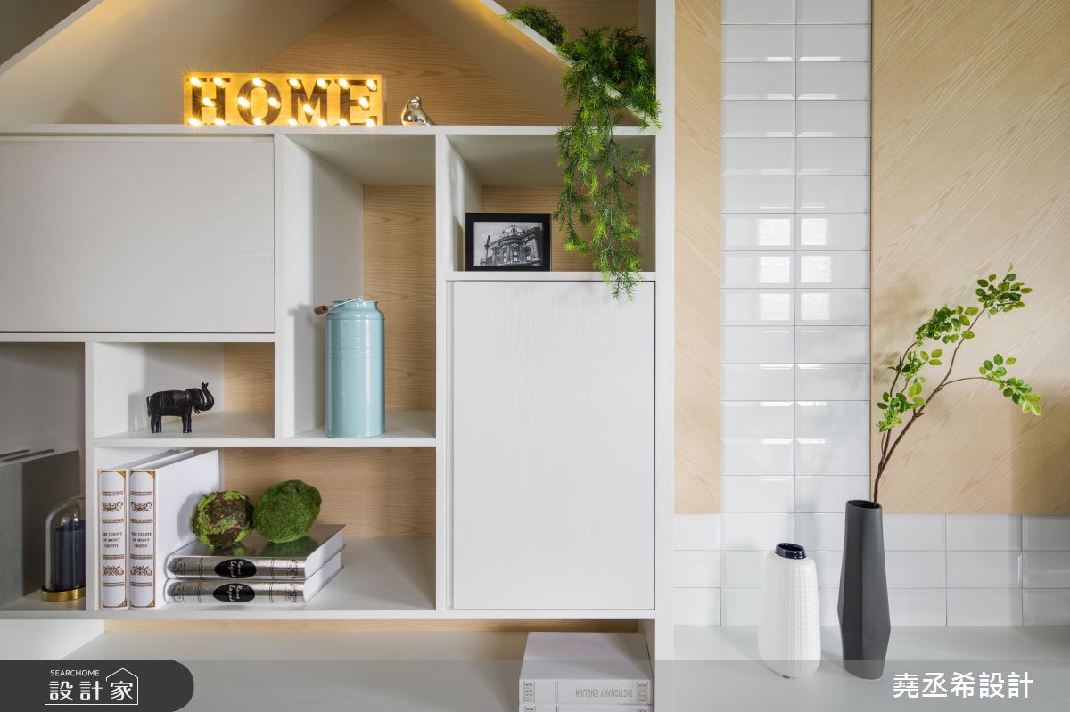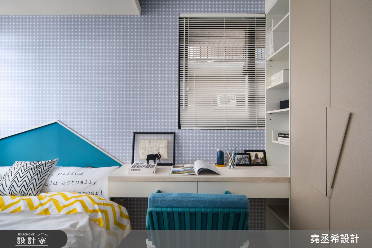 設計師於電視牆鋪陳亮白的磚面,搭接木皮表面,在輕盈表情中貫穿北歐風特性,一旁則規劃尖屋頂展示收納櫃,加入燈光、擺飾等妝點,展現趣味收納巧思,藉由整合式的櫃體,讓居家物品可集中於此道立面,天花板燈光則沿著立面安排、一路延伸,讓光源以最簡單的形式存在,並照亮整個廊道;軟件上,則於客廳選用輕盈的灰色沙發,映襯牆面底色,再透過抱枕等點綴趣味圖紋,讓灰色顯得不過份單調;兩間臥室分別依照兩人的不同個性,於床頭鋪貼不同的圖紋壁紙,且安置專屬的閱讀書桌,但引用清爽的藍作為基底,串起私領域的關聯性!