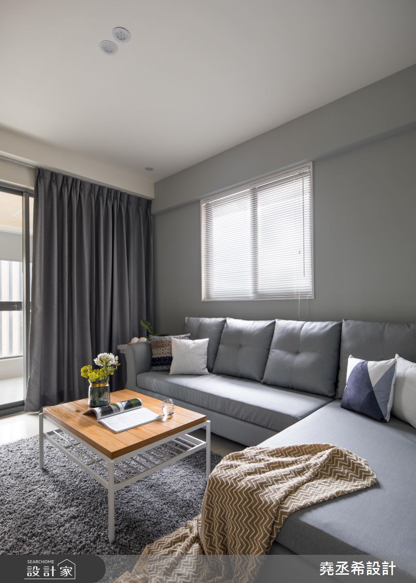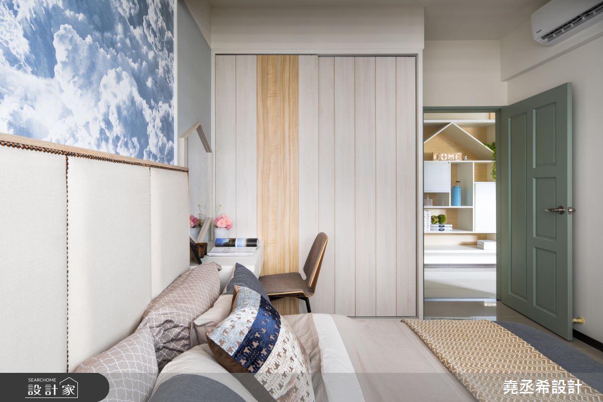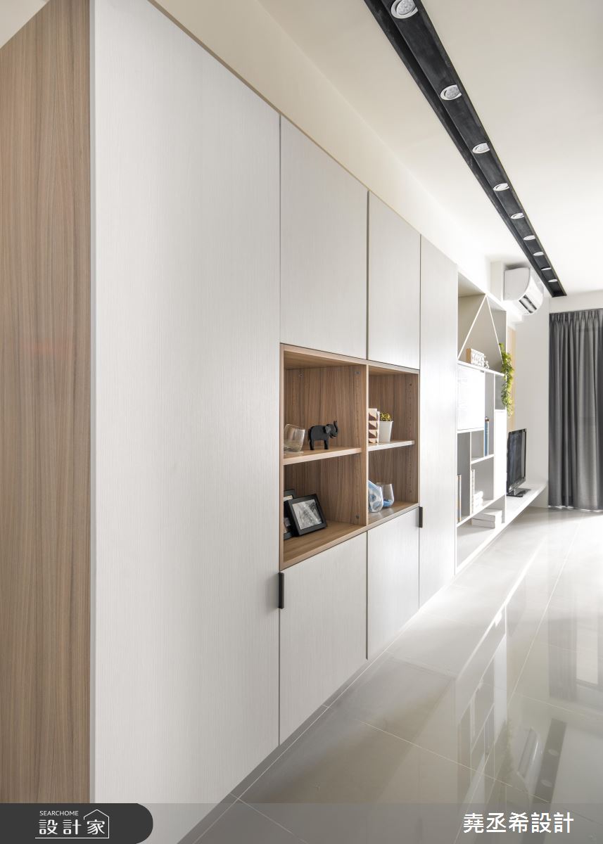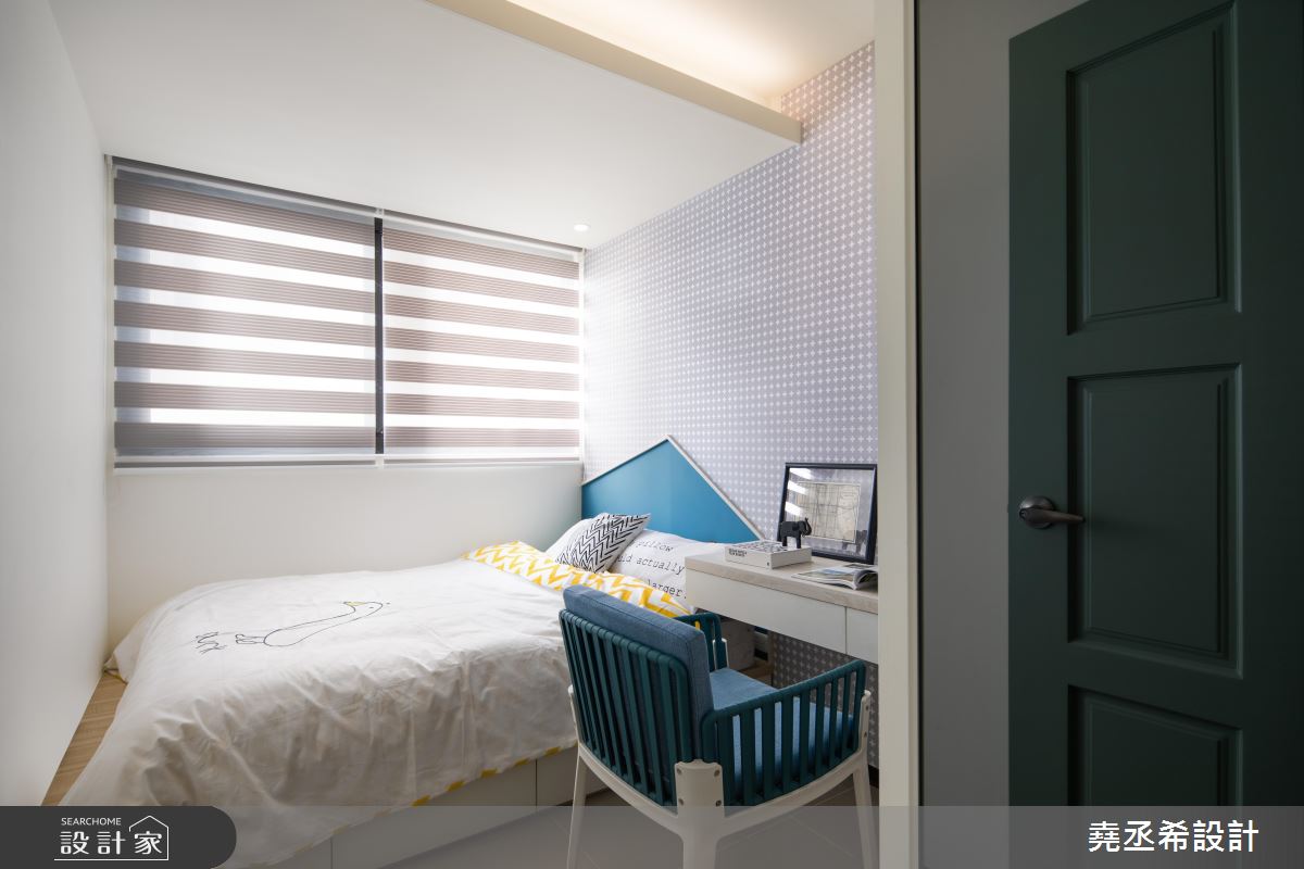 設計師於電視牆鋪陳亮白的磚面,搭接木皮表面,在輕盈表情中貫穿北歐風特性,一旁則規劃尖屋頂展示收納櫃,加入燈光、擺飾等妝點,展現趣味收納巧思,藉由整合式的櫃體,讓居家物品可集中於此道立面,天花板燈光則沿著立面安排、一路延伸,讓光源以最簡單的形式存在,並照亮整個廊道;軟件上,則於客廳選用輕盈的灰色沙發,映襯牆面底色,再透過抱枕等點綴趣味圖紋,讓灰色顯得不過份單調;兩間臥室分別依照兩人的不同個性,於床頭鋪貼不同的圖紋壁紙,且安置專屬的閱讀書桌,但引用清爽的藍作為基底,串起私領域的關聯性!