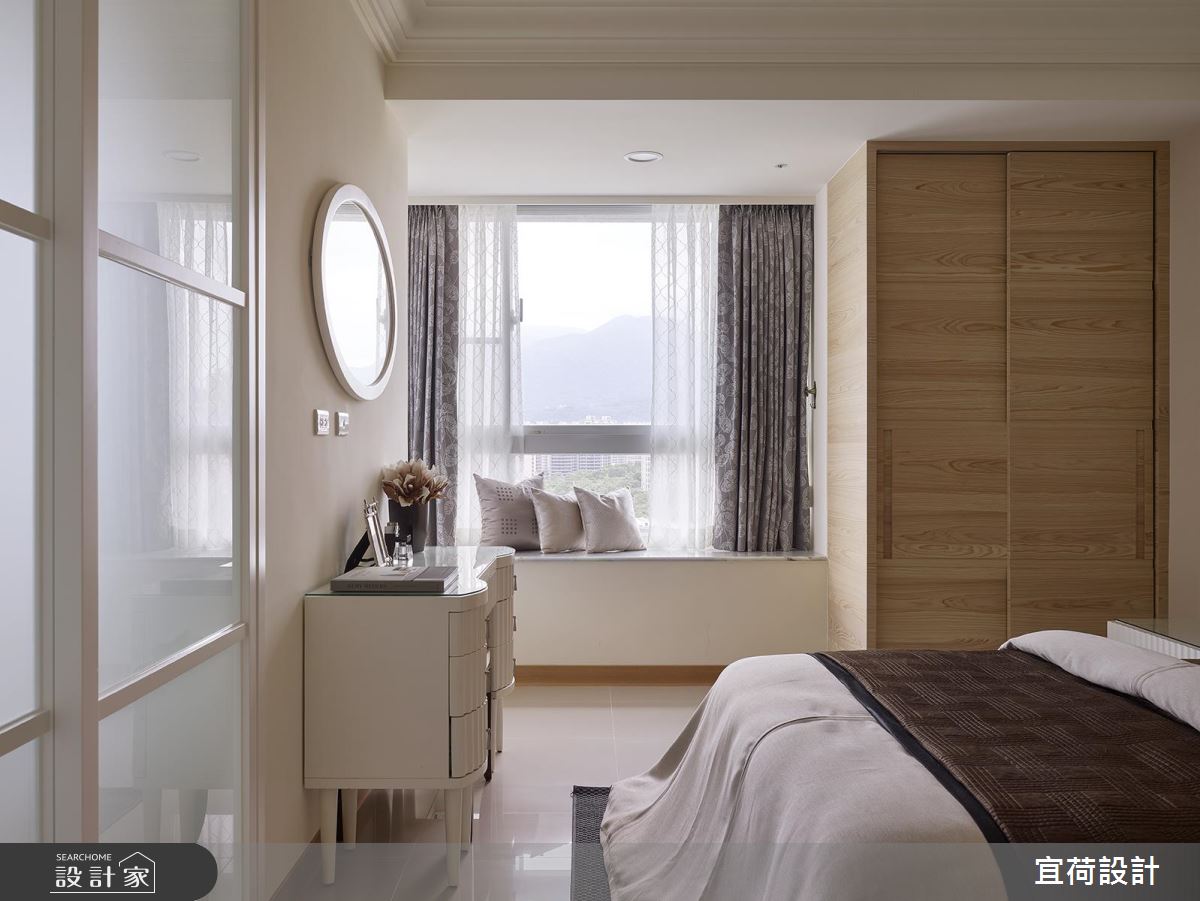 屋主希望廚房和書房可以維持通透感,但考量到書房要安靜、廚房有油煙疑慮, 所以選用白框清玻隔間門,讓空間獨立又具備充裕採光。主臥採取貼近真實感的木皮與石材,跟優美的戶外窗景相互輝映,而且設計師轉化窗台的大樑,規劃出臥榻區域,邊閱讀邊賞景,好不愜意。