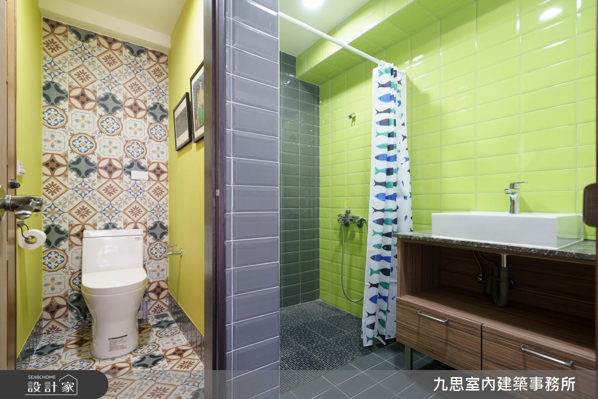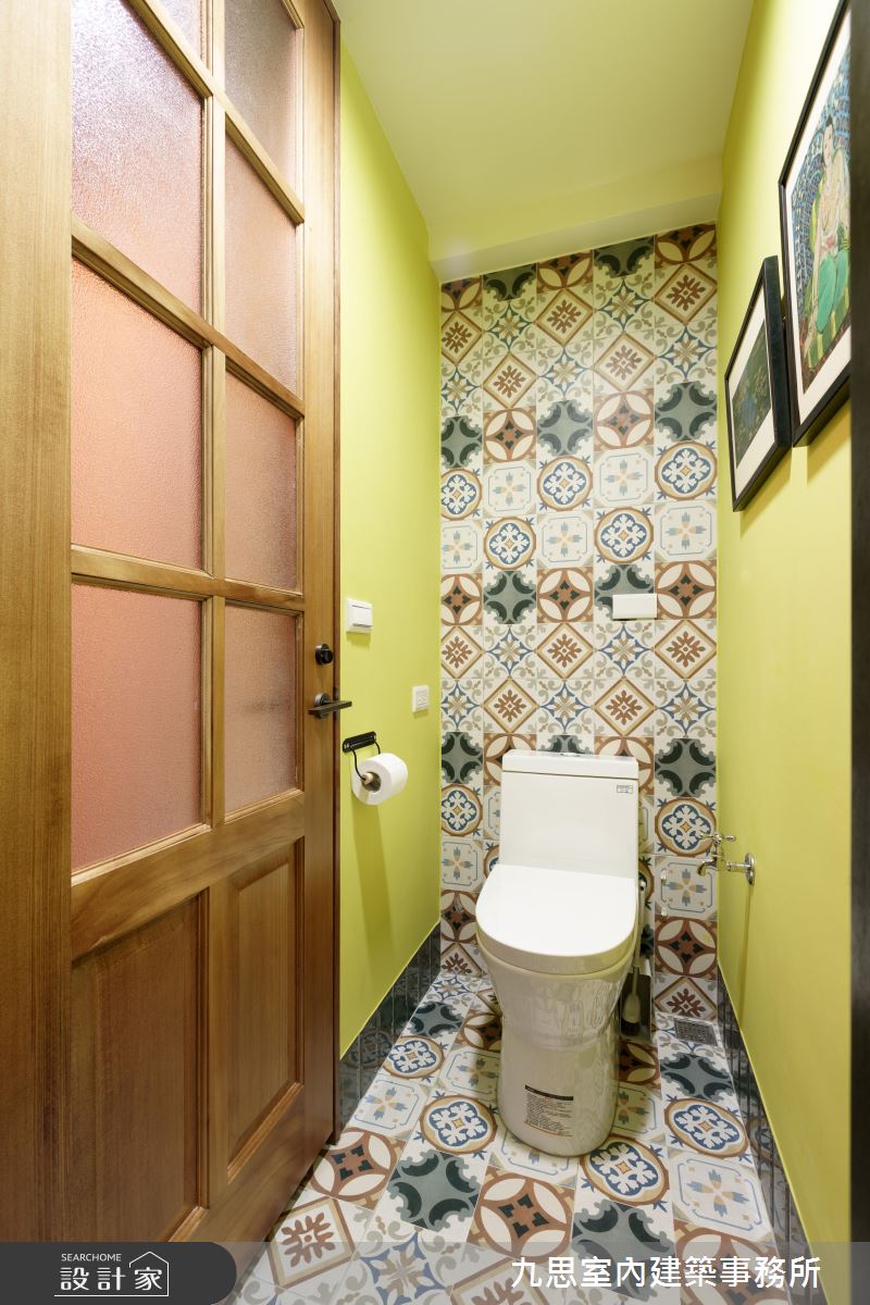 廁所兩側壁面以黃色舖陳,並利用花磚鋪設出核心領域,有限的空間裡因為亮度、視覺美感提升,解除狹隘壓迫感受。