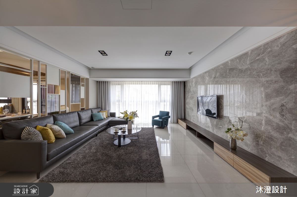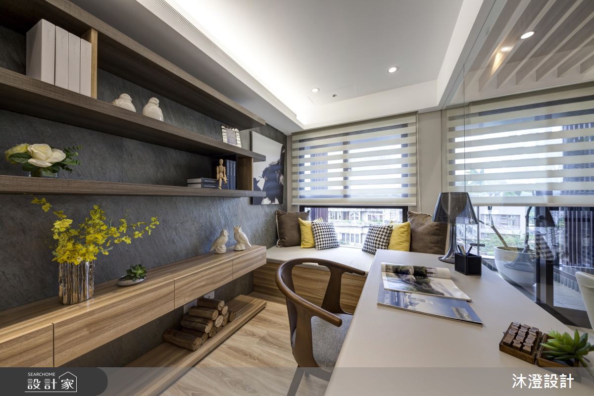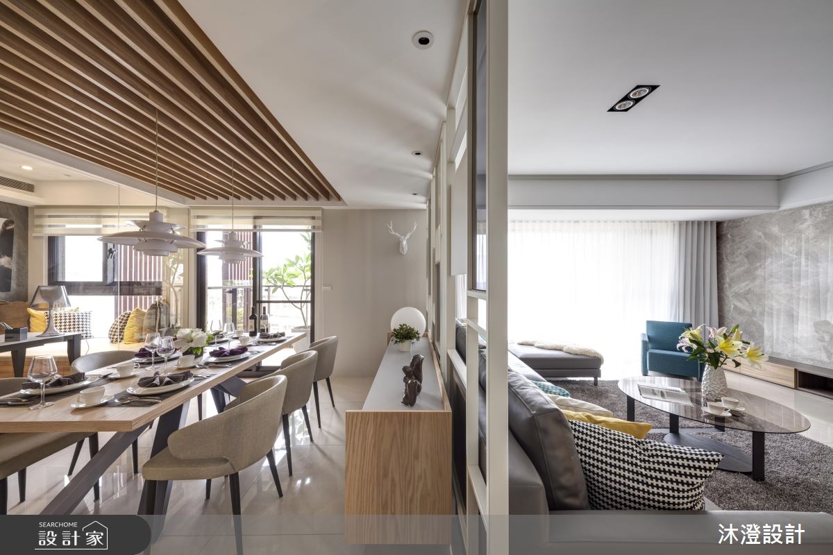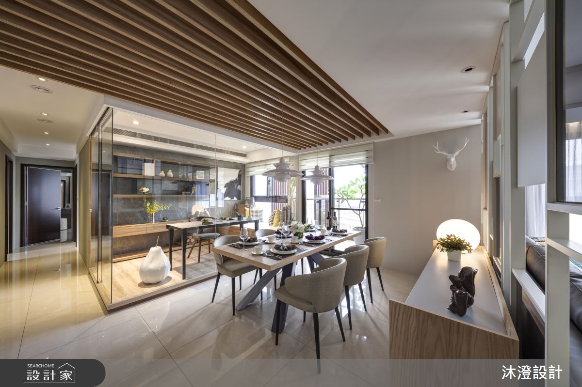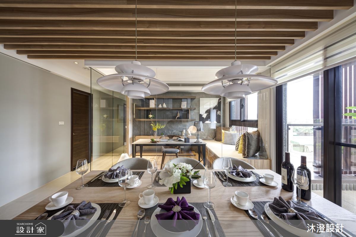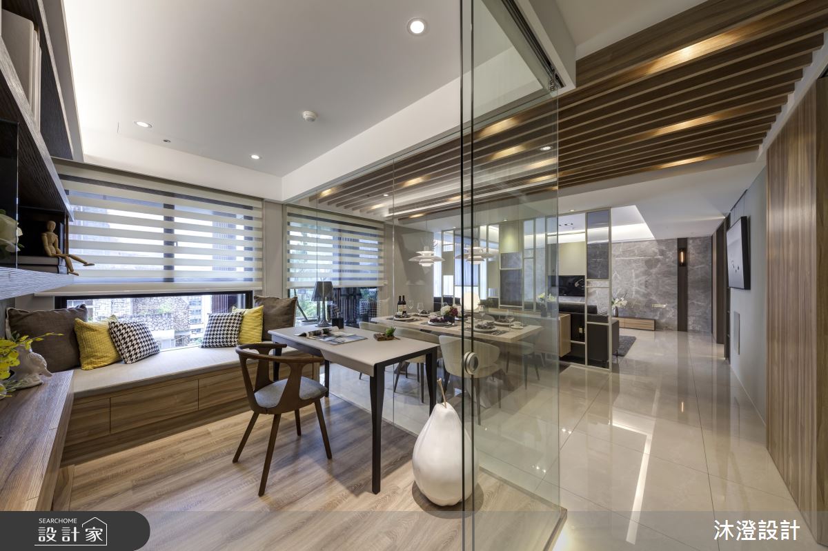 從玄關、客廳、餐廳至書房,同一軸線的配置,順暢了生活動線。首先,客廳區以灰棕大理石電視牆低調帶出大宅氣場,質材後方藉由格柵屏風隔出客、餐場域,光線、空氣及視線相互通透串聯。走進用餐空間,壁面由灰色牆面轉為木質材,呼應餐桌上方天花板處的木質格柵,清楚界定空間場域,室外小陽台空間以落地拉門設計為公領域帶入更多光源。接著向後轉來到透明玻璃隔間的書房,讓開放式空間視野通透,緊鄰窗邊規劃的臥榻,搭佐室外綠意日光,為室內營造更愜意紓壓的氛圍。