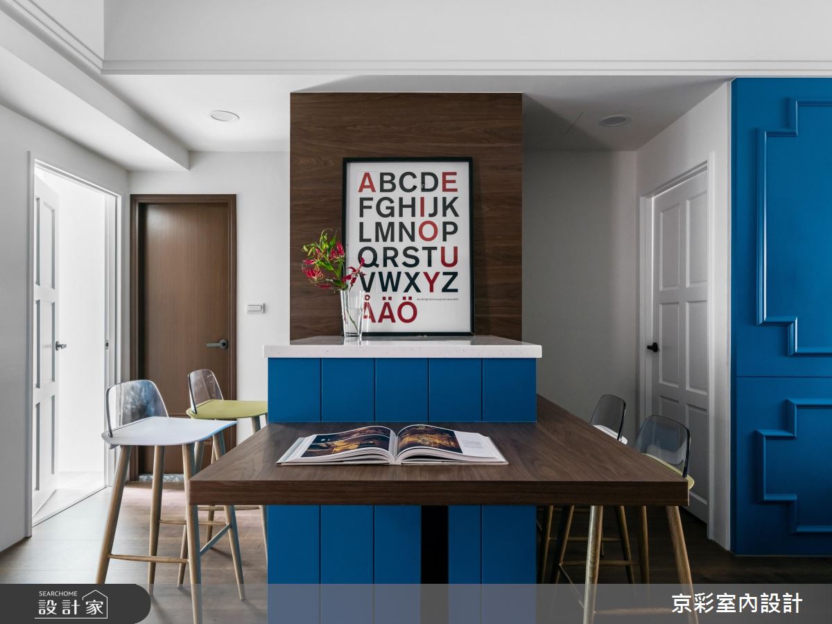 客餐廳採取開放式設計,讓採光能夠順暢地打亮公領域,同時還能放大坪效、改善動線。英國藍的電視牆搭配靠近玄關的收納櫃,以及一面能夠放上相片的黑板,形成居家最繽紛的端景。餐廳則結合吧檯與餐桌,形成一個方形區塊,在有限的空間下,變化出最有效率的利用。