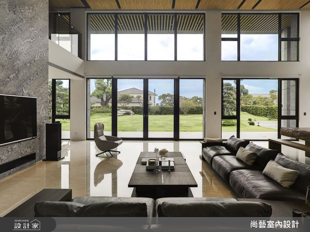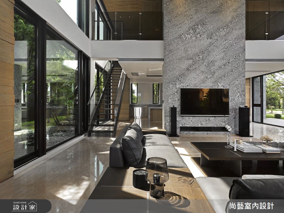 250 坪現代風大宅,設計師透過玻璃帷幕的挑高及圍塑、緩解了生硬疆界、並將窗外景觀串聯入室,同時給予木料與石材搭配,塑造絕美的室內外景致,快跟著小編一起來看看吧!客廳,於天花加入適當線條打破拘泥,藉由格柵衍生向外延伸感,並於空間內加入大面積玻璃帷幕,使自然景觀綿延入室,且讓電視主牆成為唯一頂天立地的