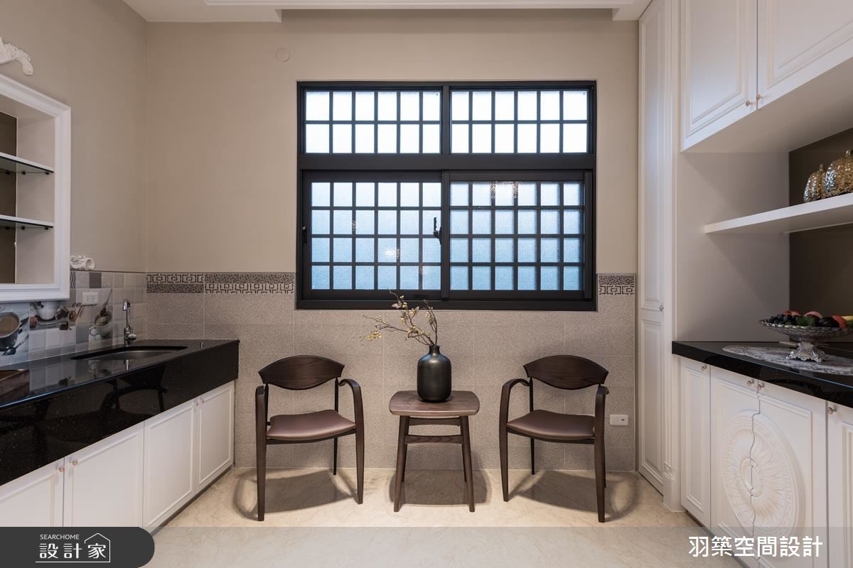 公領域以電視牆作為機能界線,保留了一小塊備餐區域,採以方正窗型詮釋東方韻味,搭配古樸家具與花藝陳列,打造出有別於客廳主調的內斂風景!